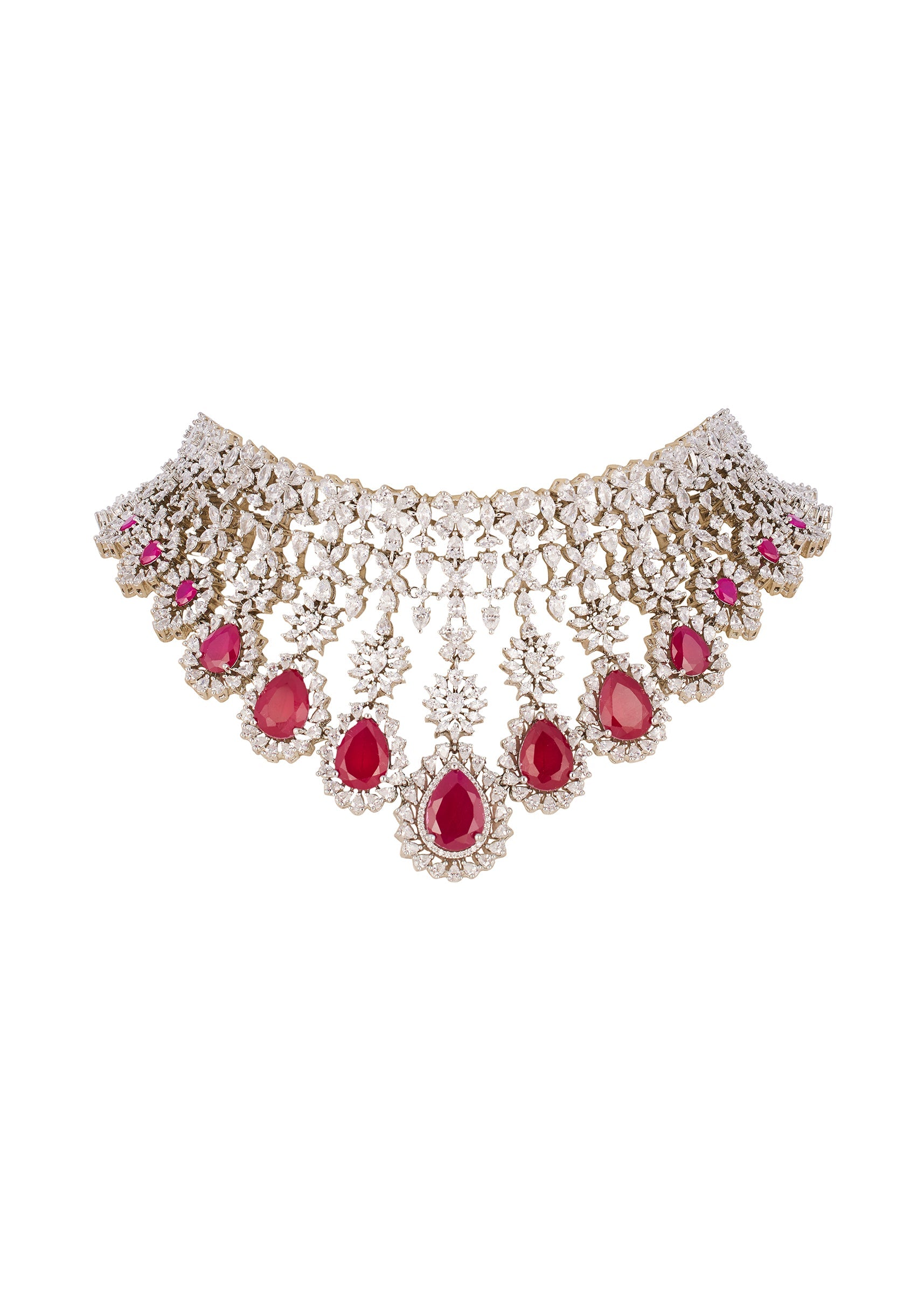 A radiant choice for the rani pink bride, this CZ diamond look necklace set brings together timeless sparkle and modern finesse. Crafted in durable rhodium plated brass with an anti... More Product Details
