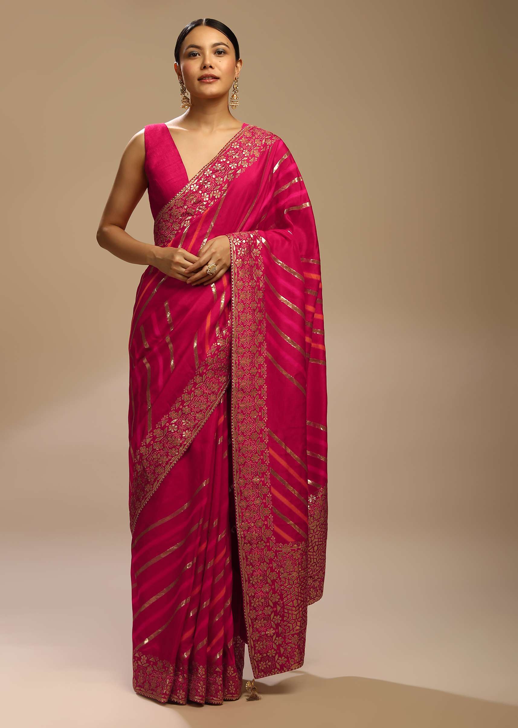 Rani pink saree in dola silk with coral, gold and magenta woven diagonal stripes. The border and pallu are adorned with brocade woven floral and geometric motifs. Trimmed with tassels on the corners of the pallu. Paired with a matching unstitched blouse. Awarded As The Most Trusted Brand We'Re Delivering Styles You Love Just As Promised.