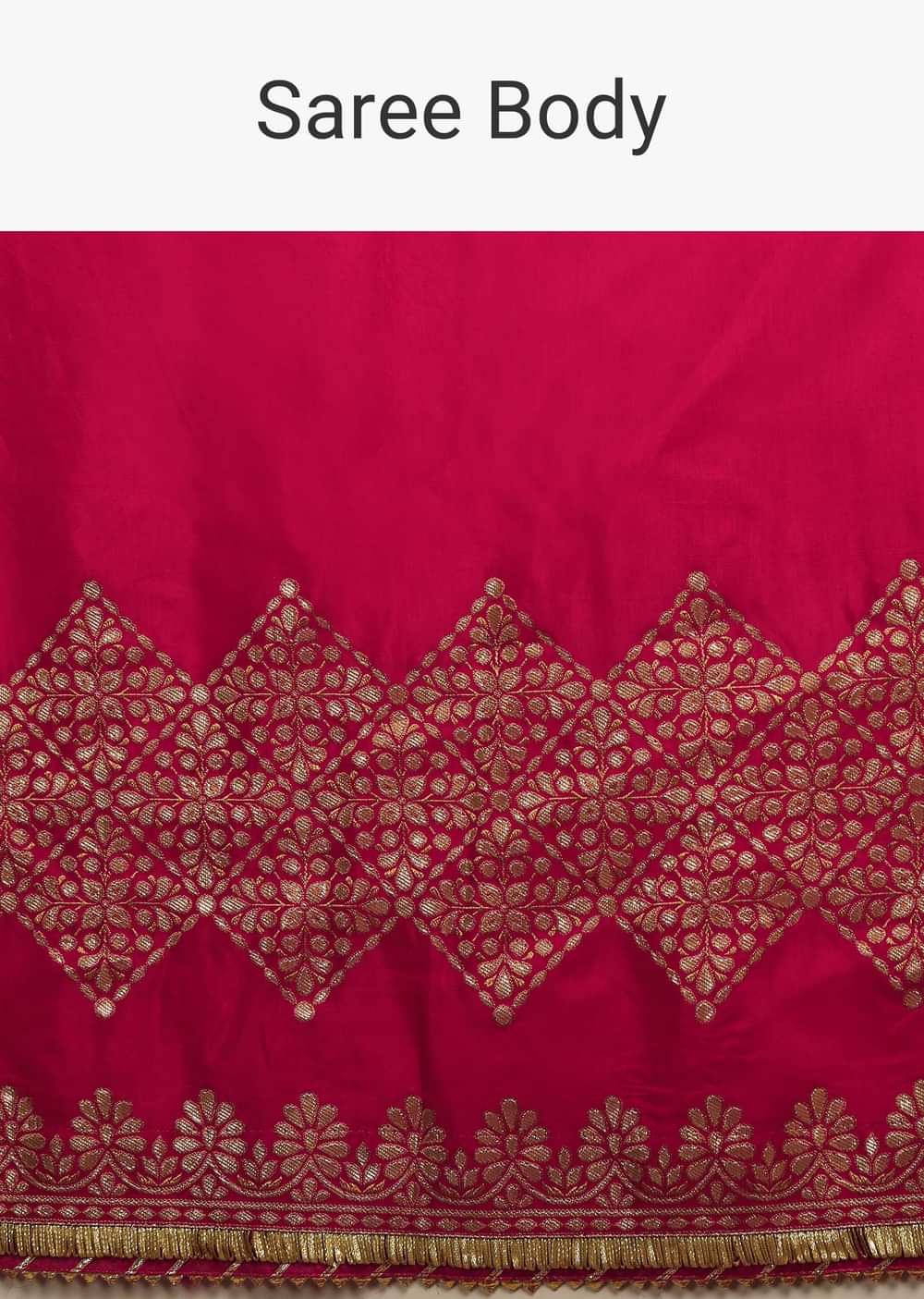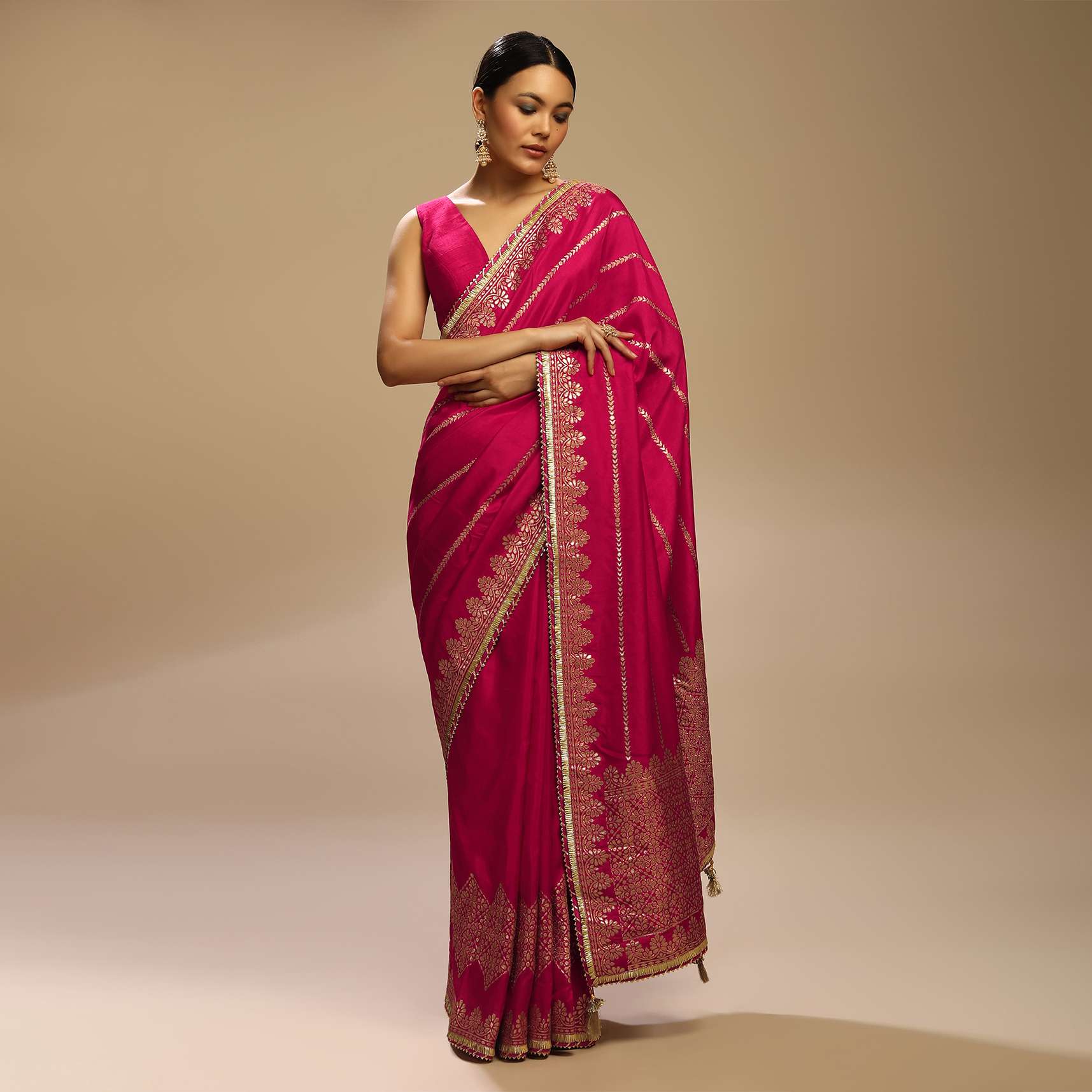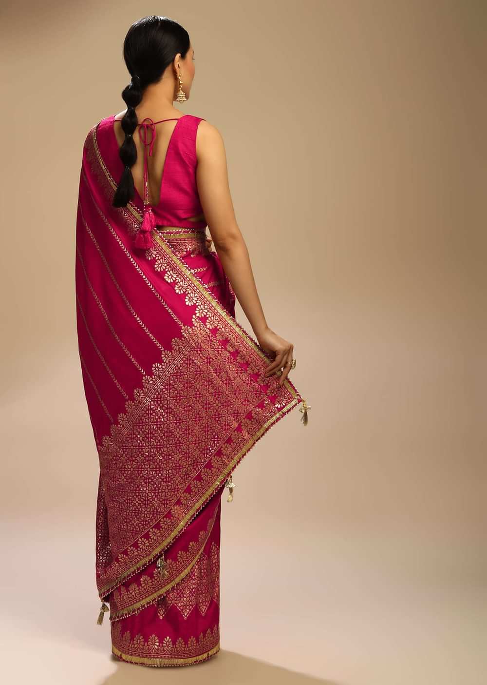Rani pink saree in silk with ethnic motifs woven in striped design. The border and pallu are adorned with woven geometric and floral motifs along with gotta lace trims. Edged with tassels on the pallu. The saree comes with a matching unstitched blouse. Awarded As The Most Trusted Brand We'Re Delivering Styles You Love Just As Promised.