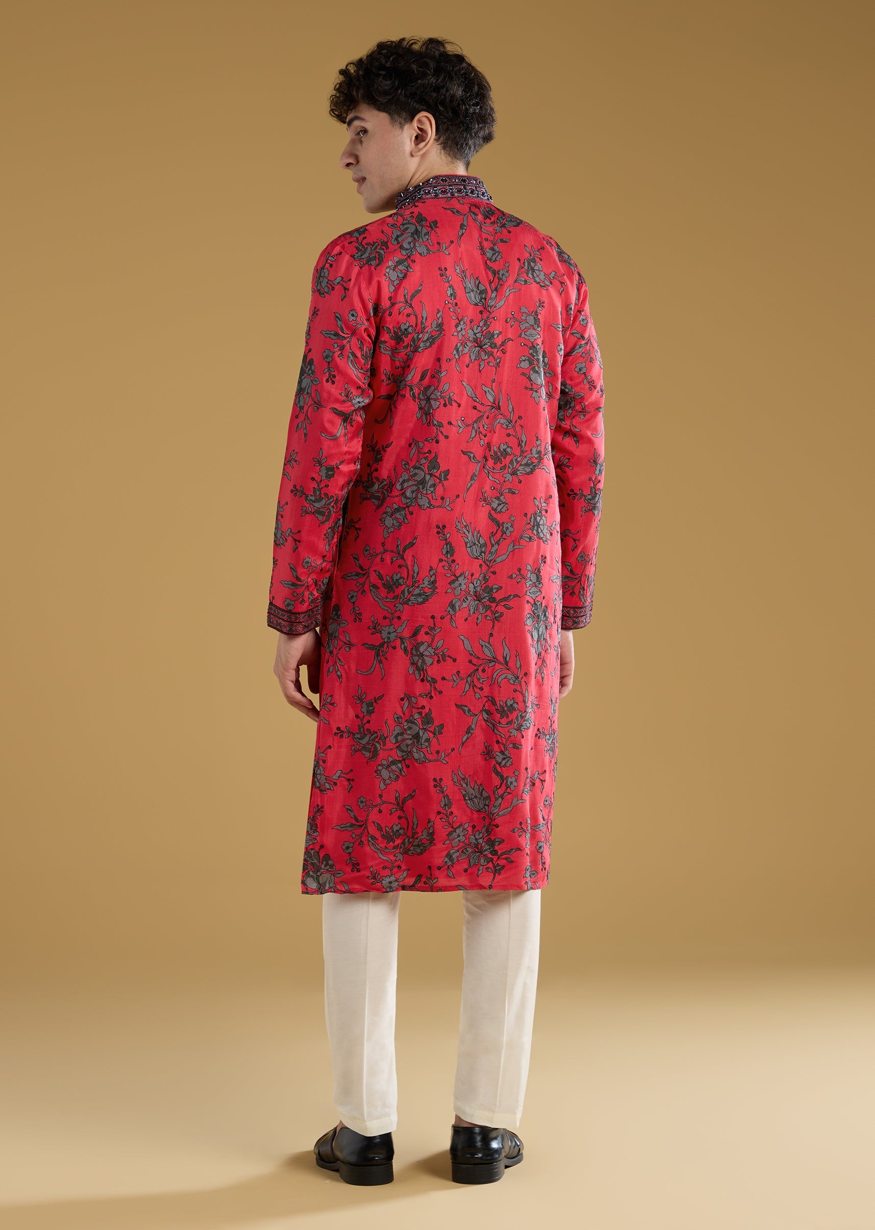 Bright and festive, this rani pink kurta set is perfect for mehendi celebrations as a wedding guest. Crafted in luxurious silk, it features full sleeves and a classic mandarin collar... More Product Details