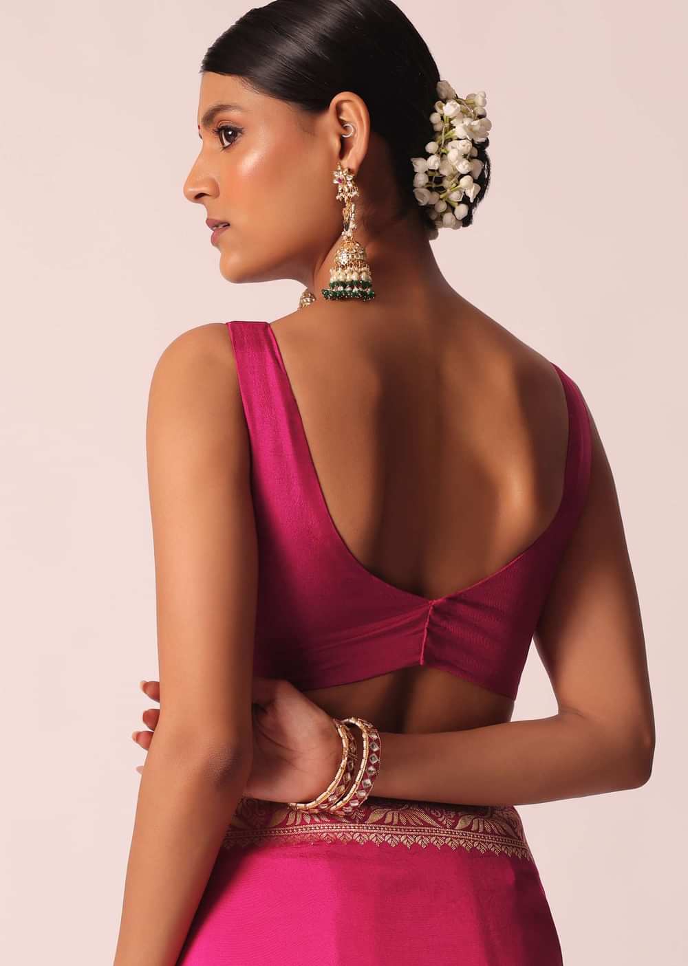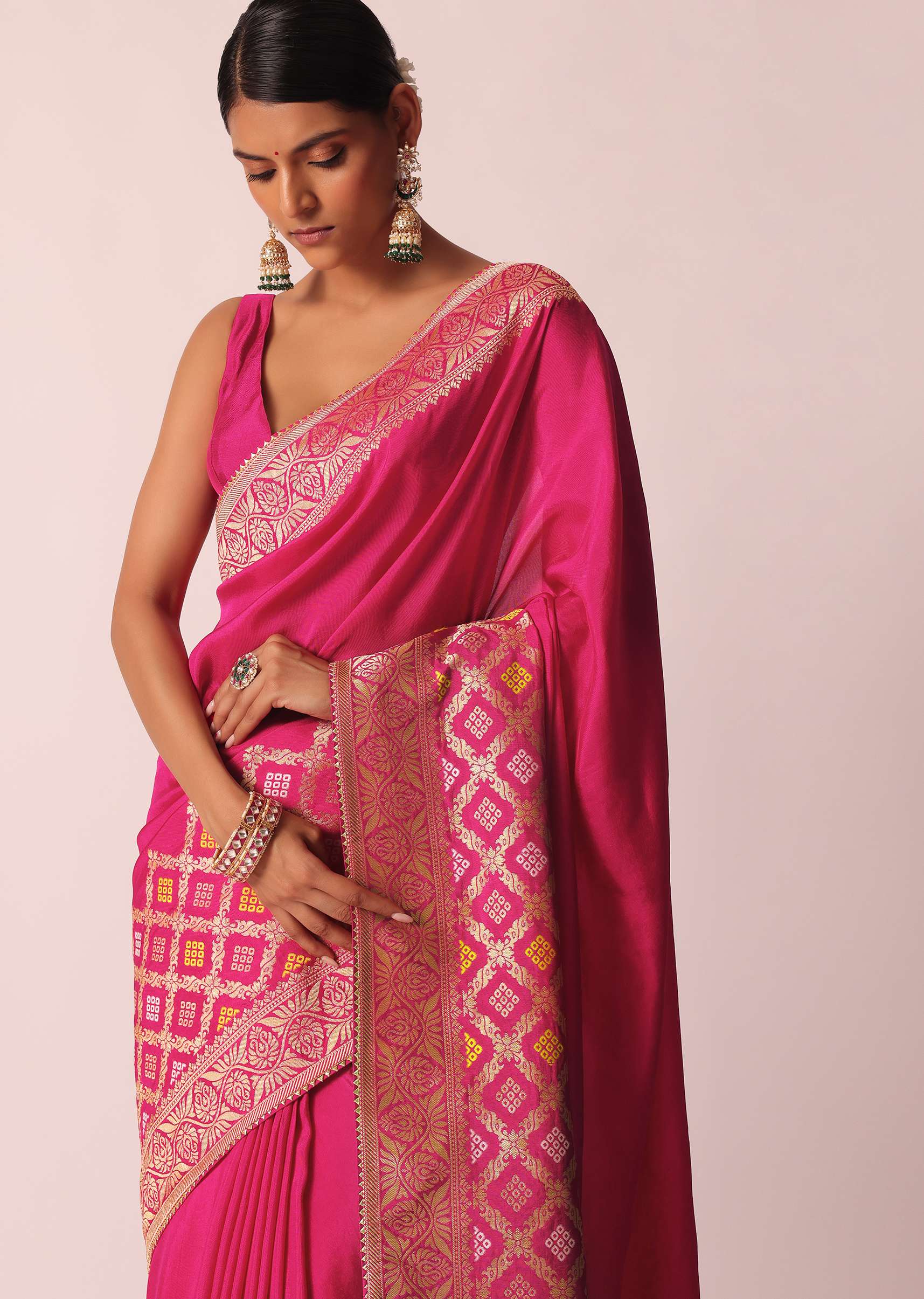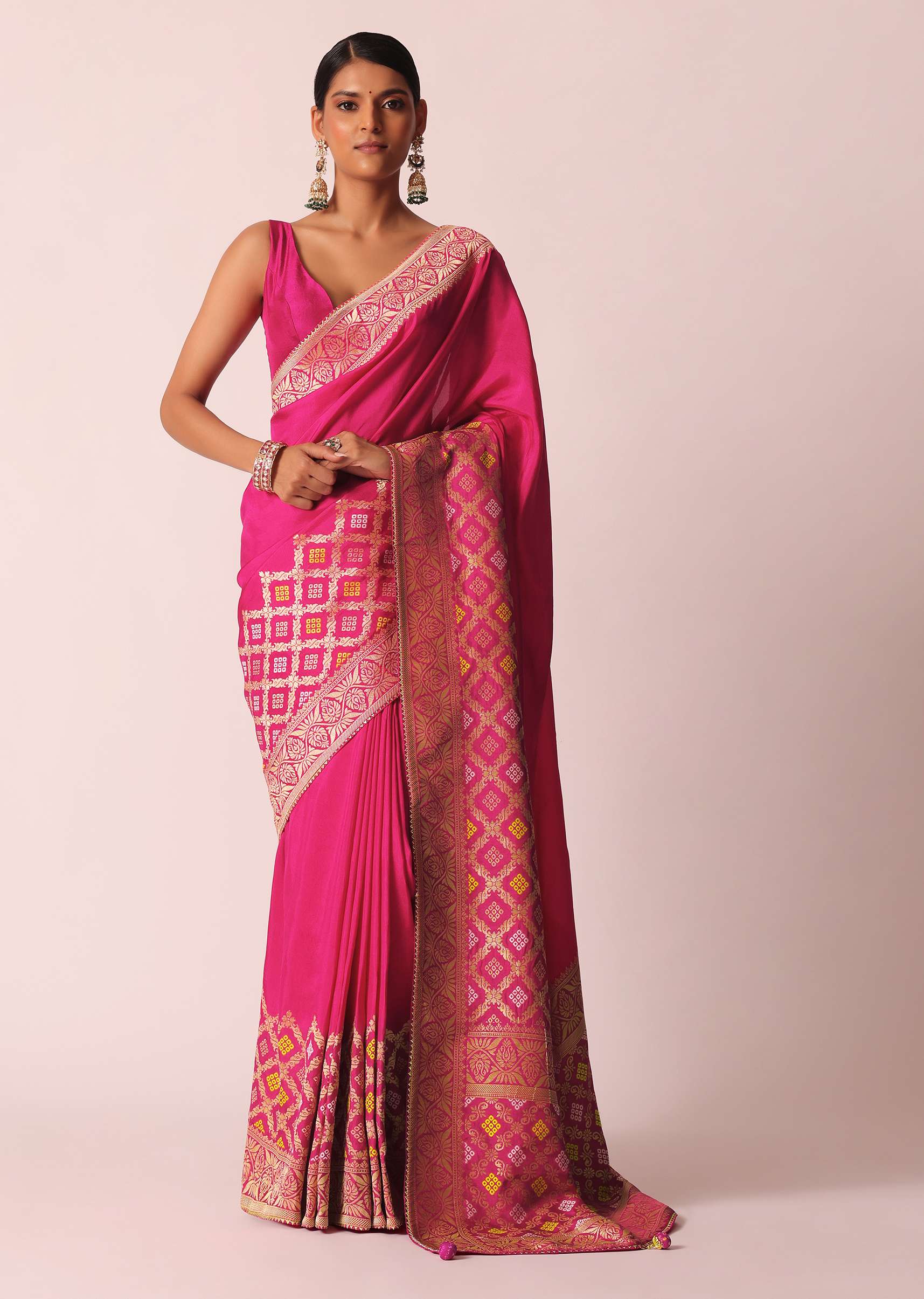 Rani Pink Silk Saree With Bandhani Detail And Unstitched Blouse Piece