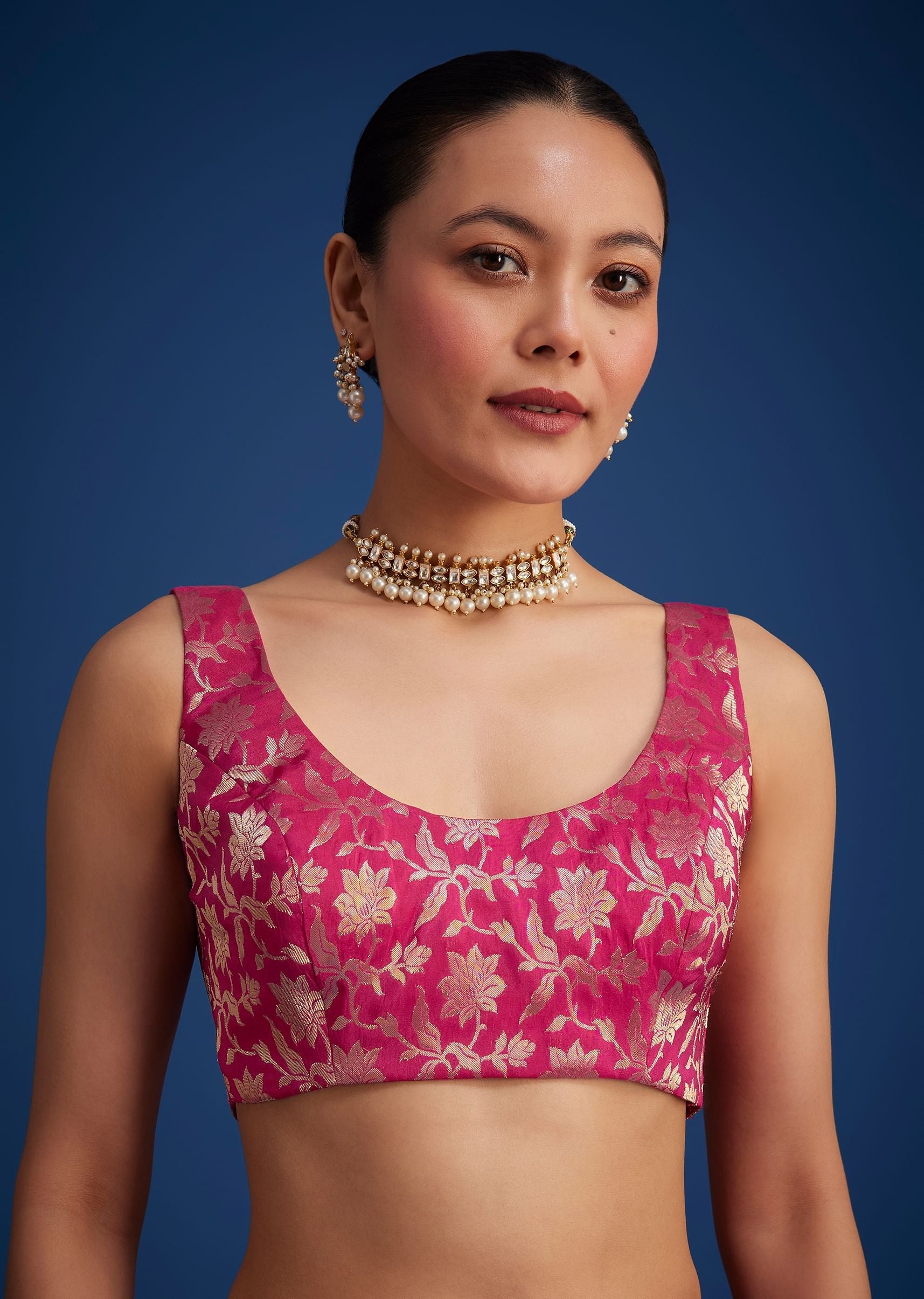 - Celebrate elegance with this rani pink tissue silk saree, adorned with intricate zari border and butti work.