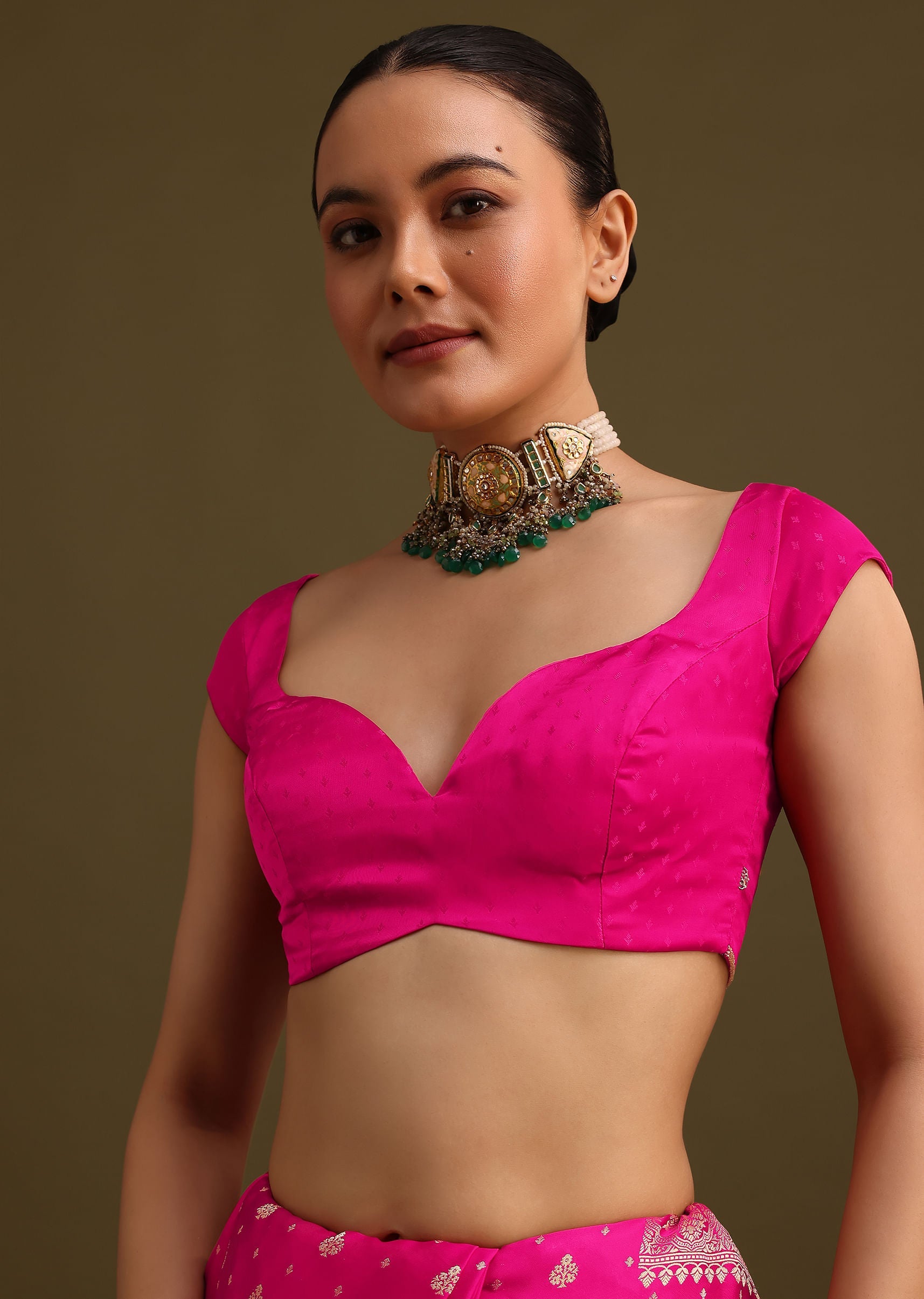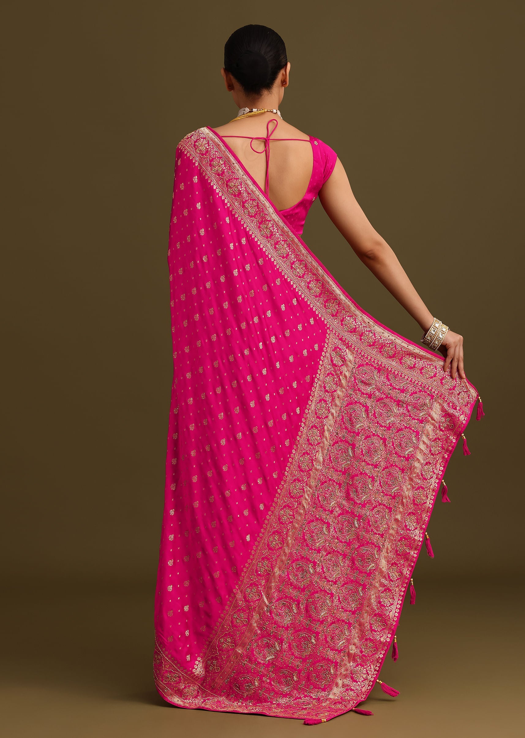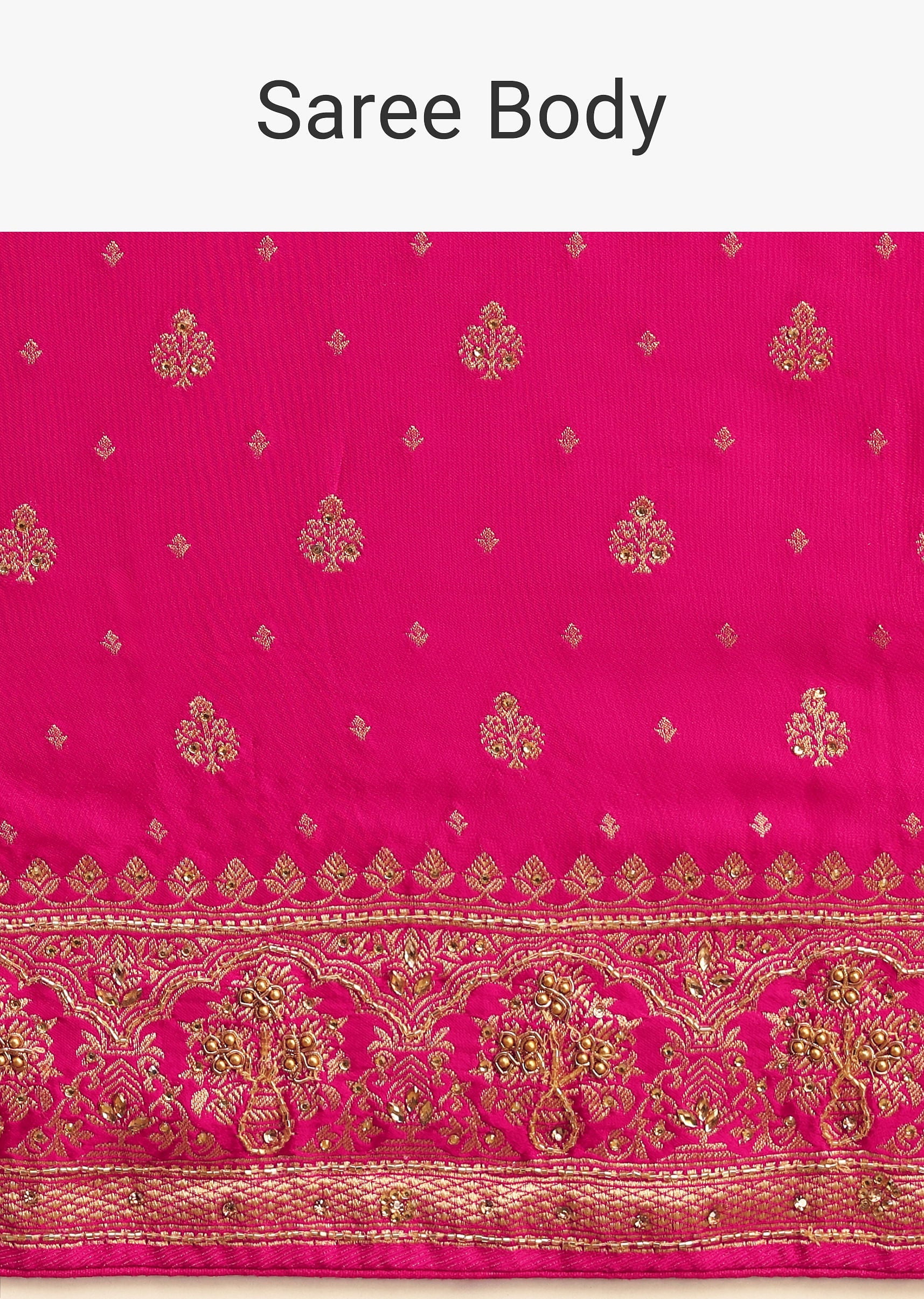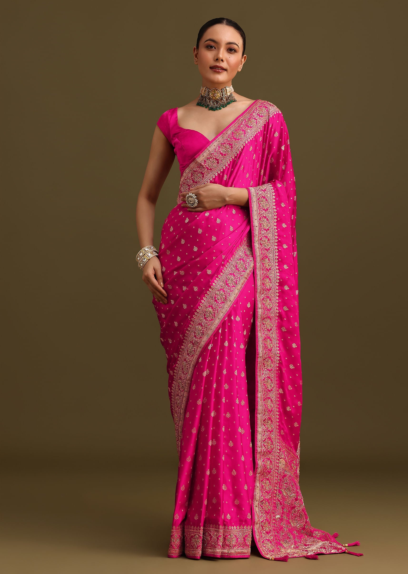 Rani Pink Zardosi Embroidered Saree With Unstitched Blouse