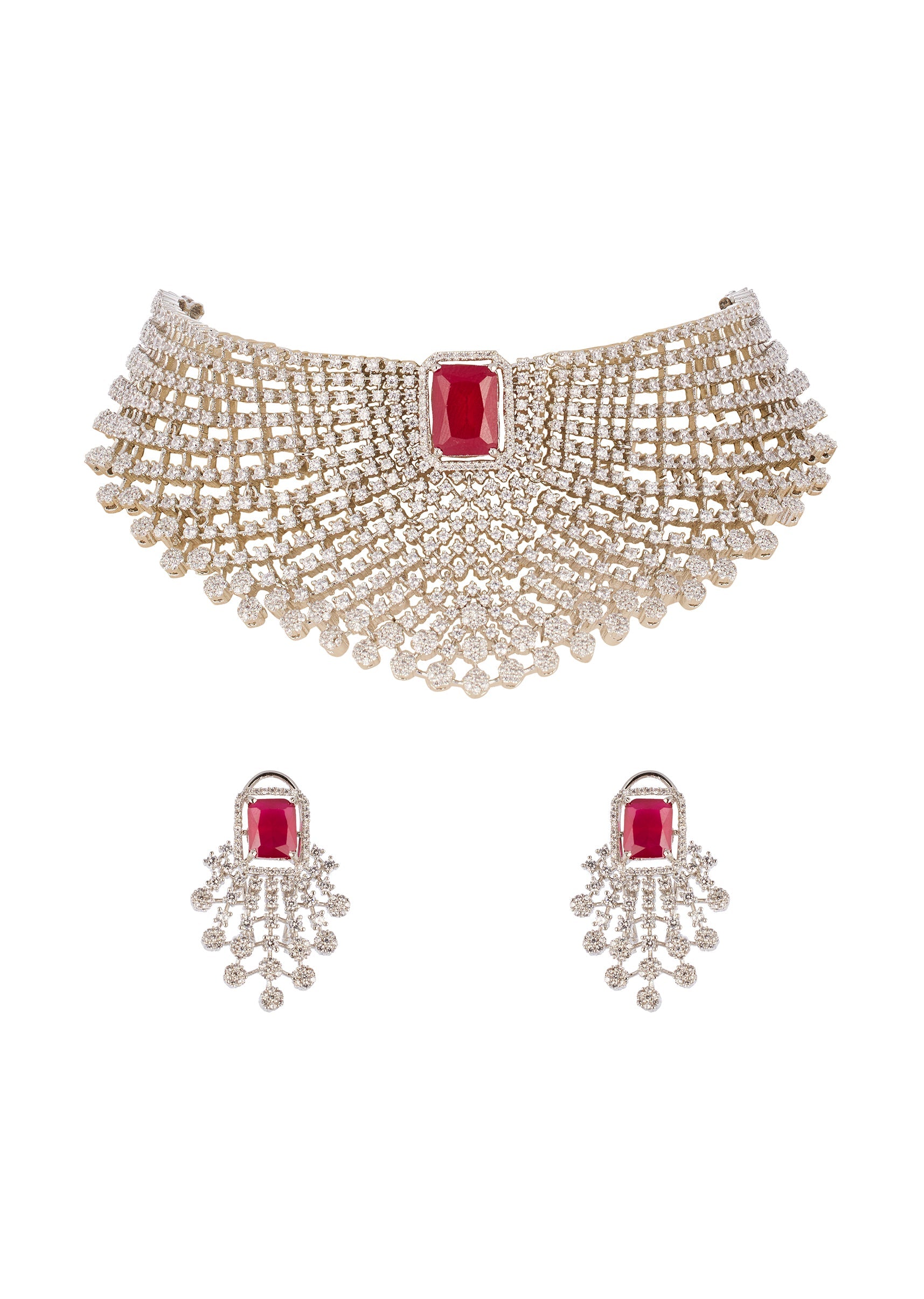 Red and Silver Anti Tarnish Rhodium Plated Necklace Set with CZ Diamond