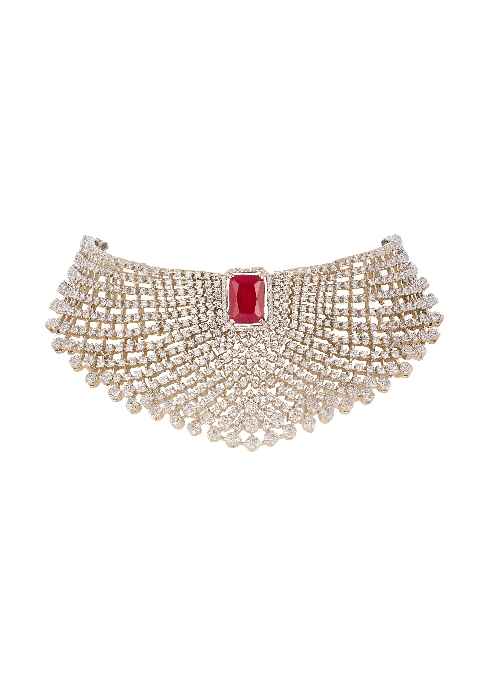 A striking blend of red and silver tones, this CZ diamond look necklace set brings refined sparkle with a touch of festive drama. Crafted in durable rhodium plated brass with... More Product Details