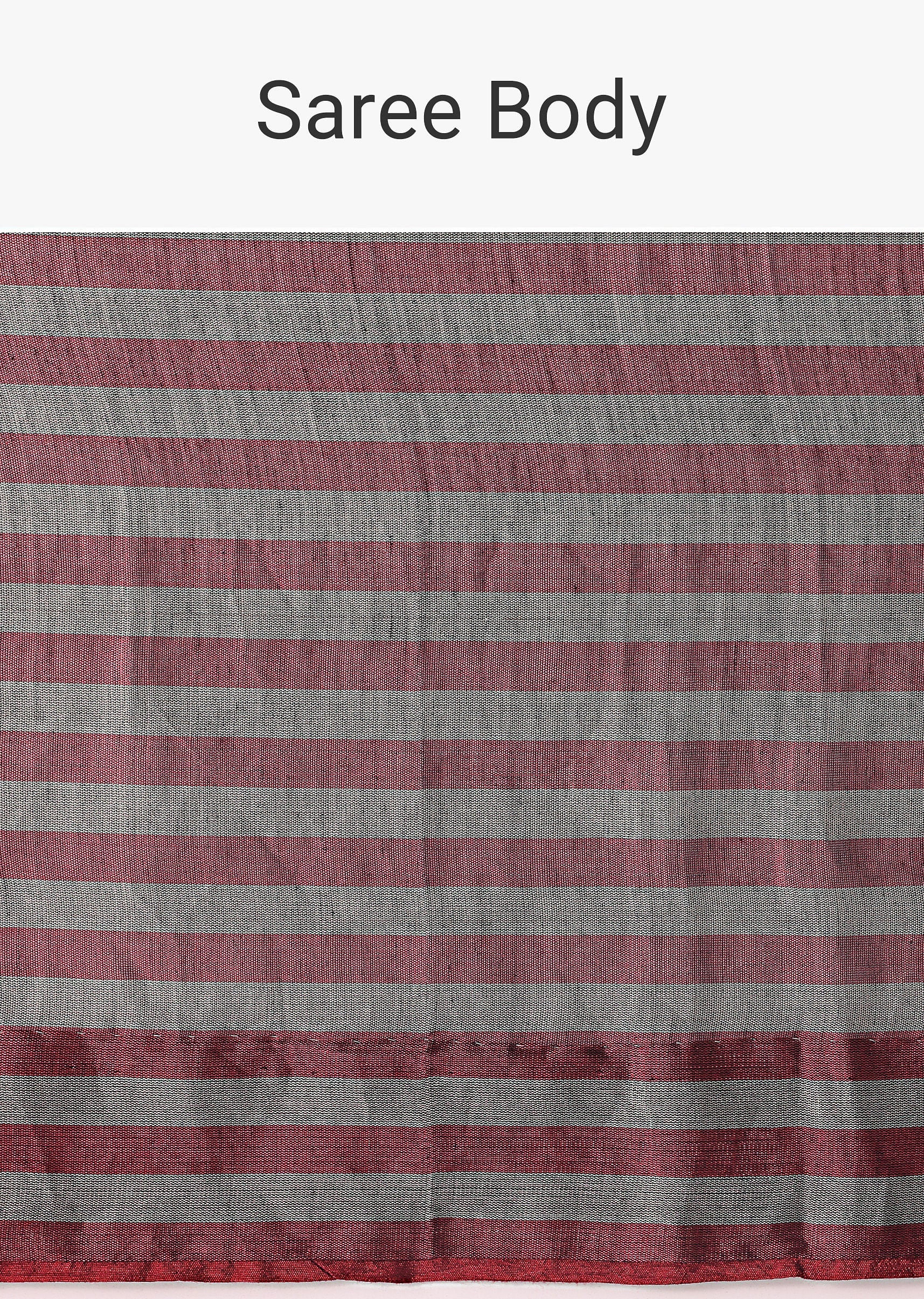 Red And Silver Striped Chanderi Tissue Saree With Pipe Finish Stitched Blouse