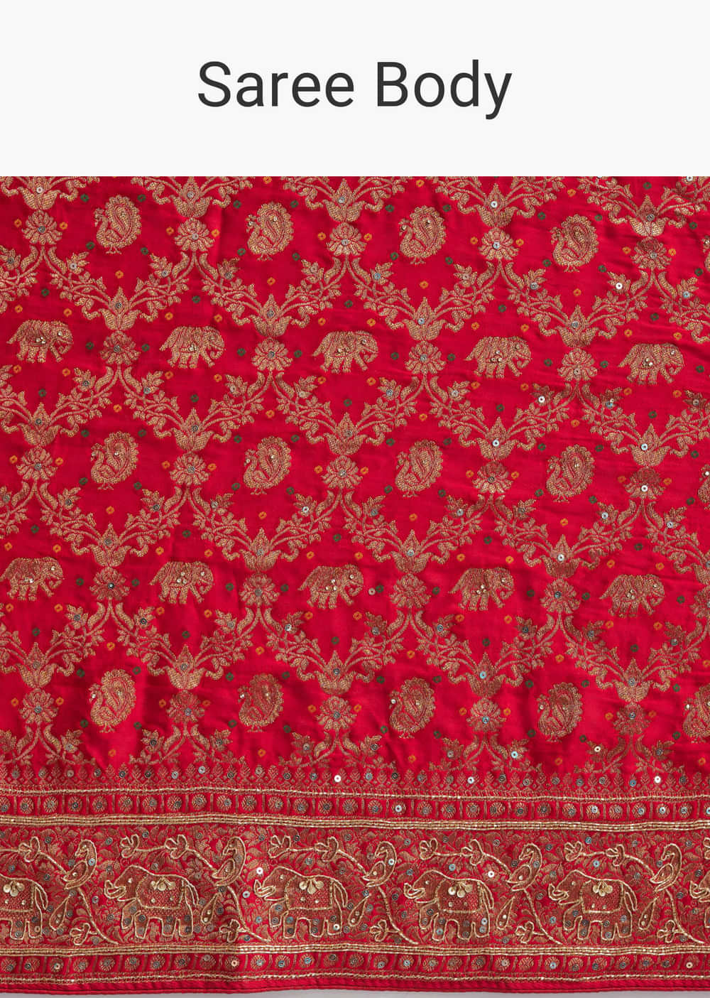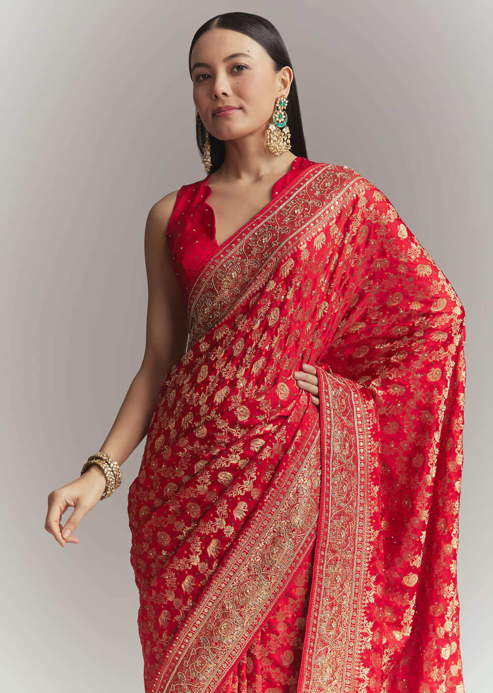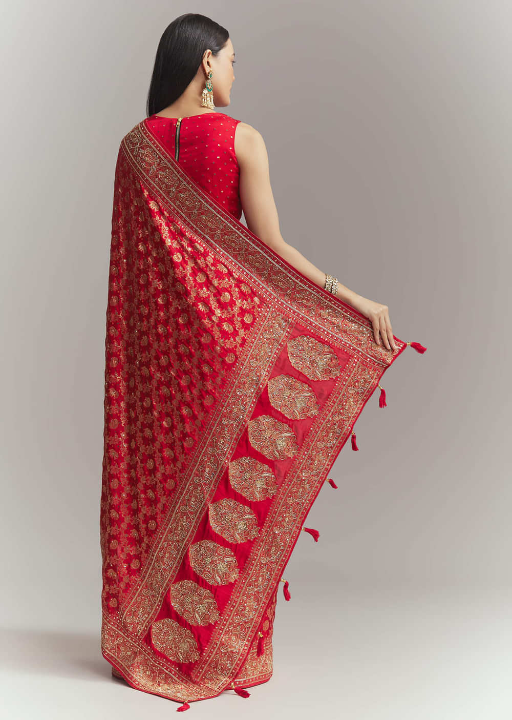 Red Banarasi Silk Embroidered Saree With Heavy Hand Embroidery