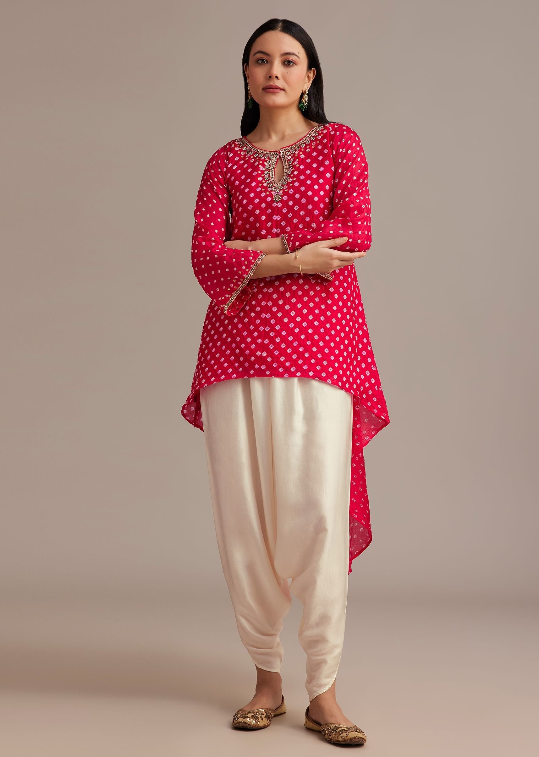 • This Red Bandhani Kurta Set Merges Classic Craftsmanship With A Modern Silhouette Featuring A Highlow Hem And Delicate Moti And Sequin Embellishments On The Neckline.