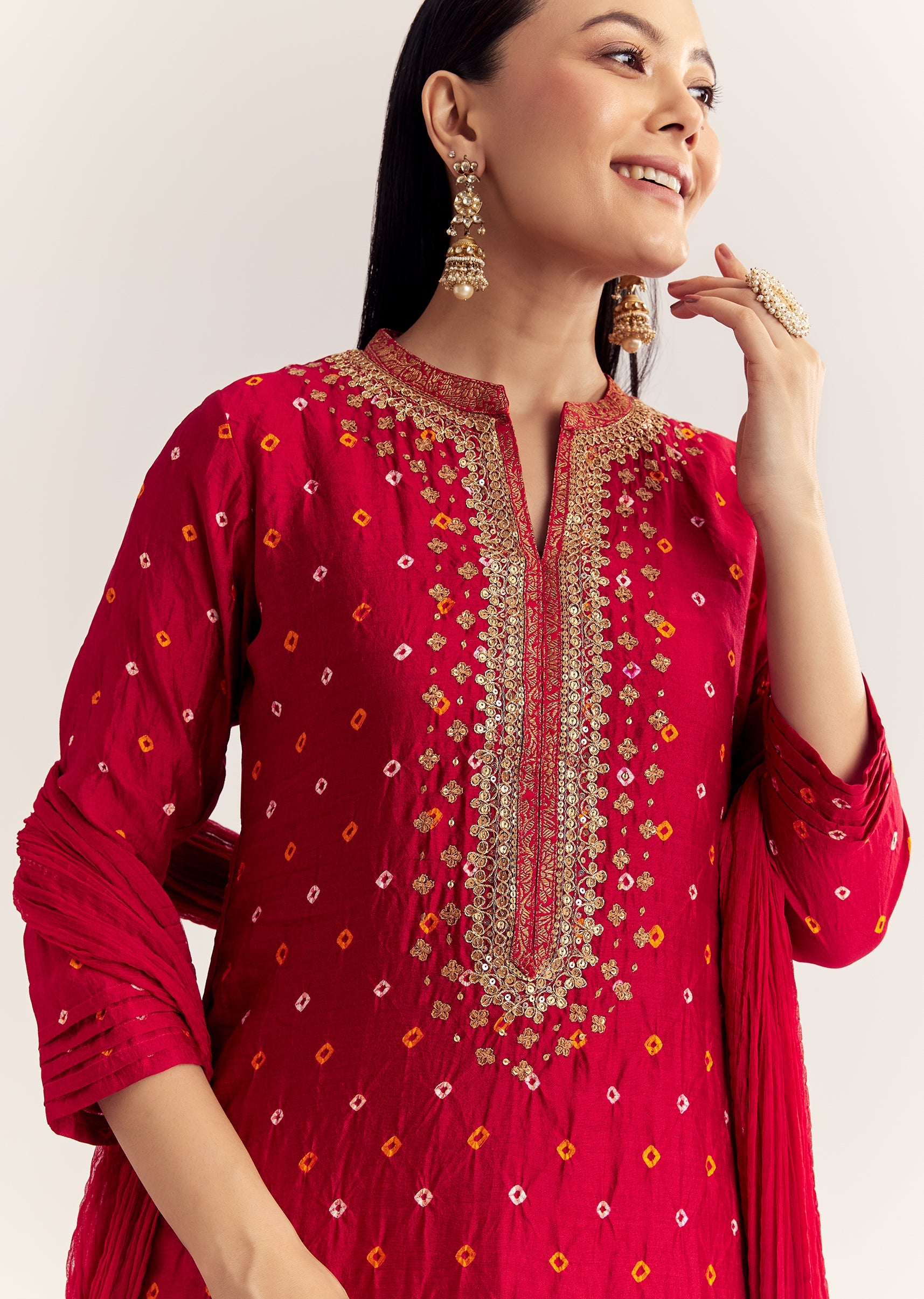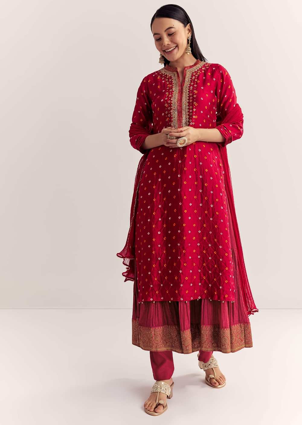 Red Bandhani Layered Silk Kurta Set With Dupatta