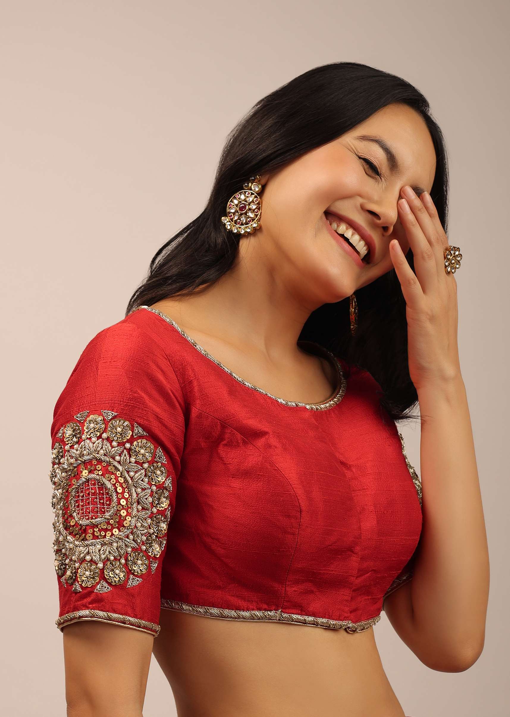 Red raw silk blouse with zardosi, moti and sequins embroidered motif on the sleeve and back. It is designed with a round neckline, half sleeves and front hook closure. The blouse is padded. Awarded As The Most Trusted Brand We'Re Delivering Styles You Love Just As Promised.