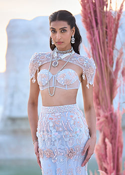 Wear one dupatta as a trail and the other pleated tightly across the torso for a sculpted bridal silhouette.