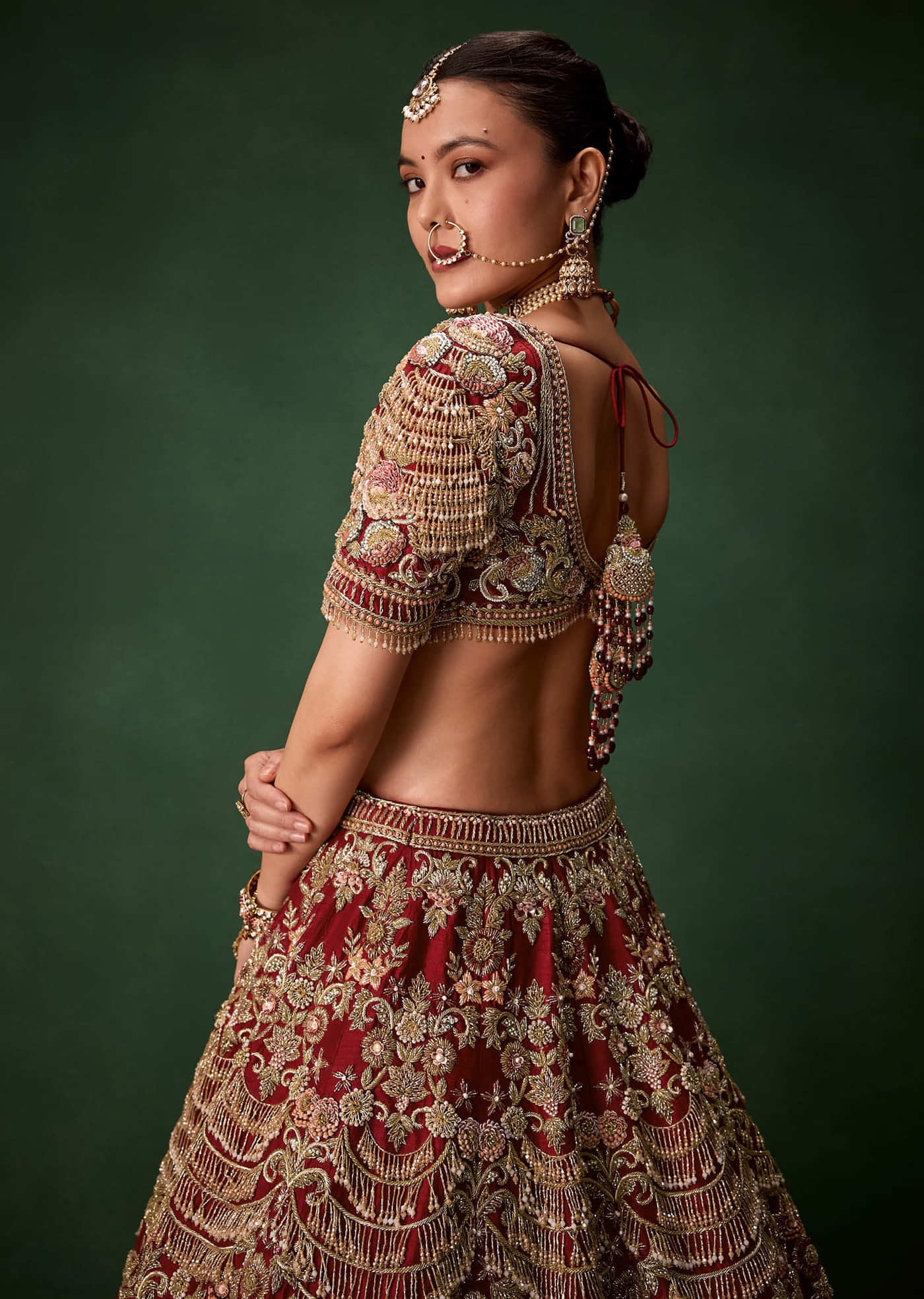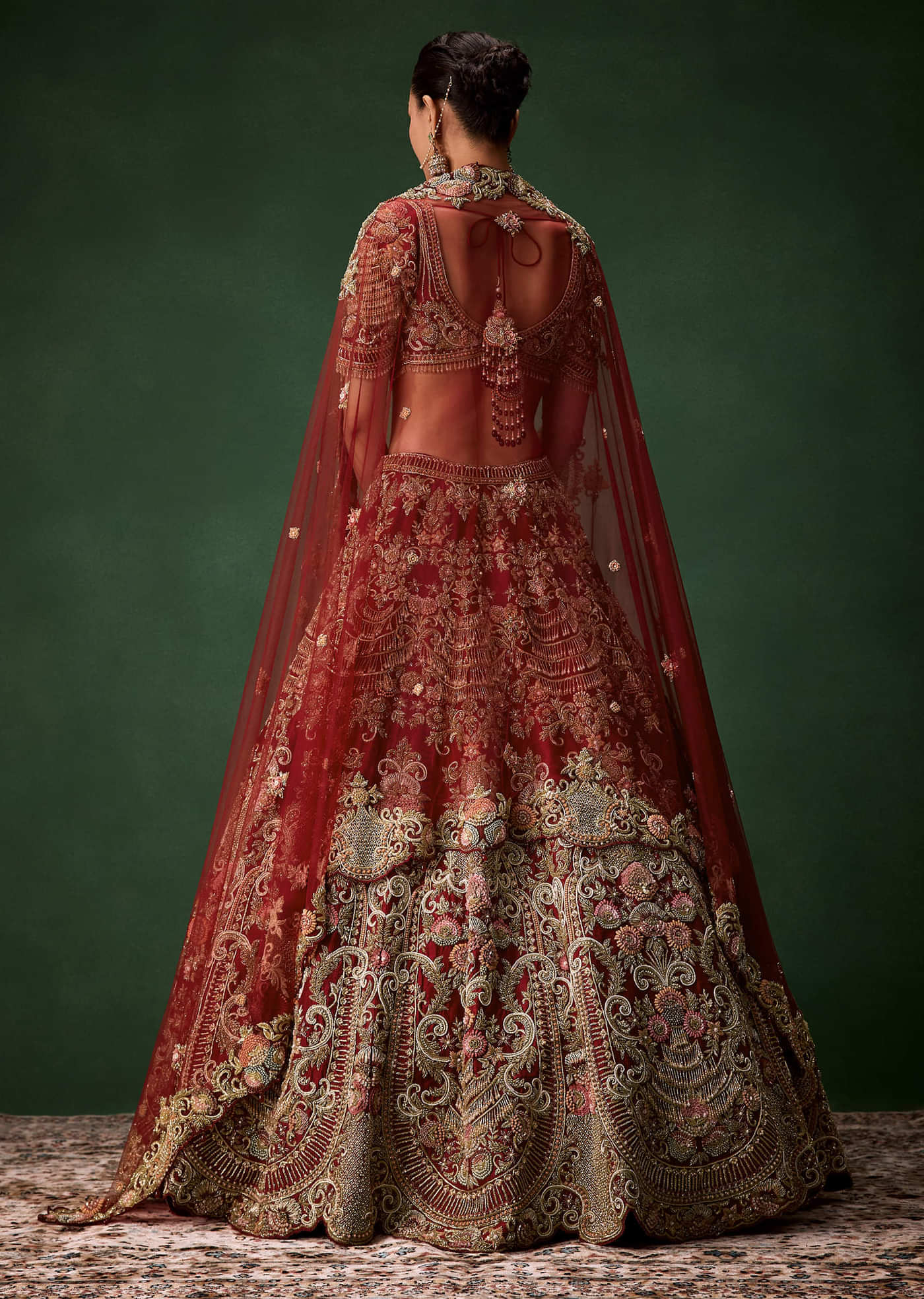 A vision of timeless bridal grandeur, this red silk lehenga set combines traditional artistry with modern refinement. The ensemble features intricate sequin, cutdana, zardozi, and patchwork detailing, creating a rich... More Product Details
