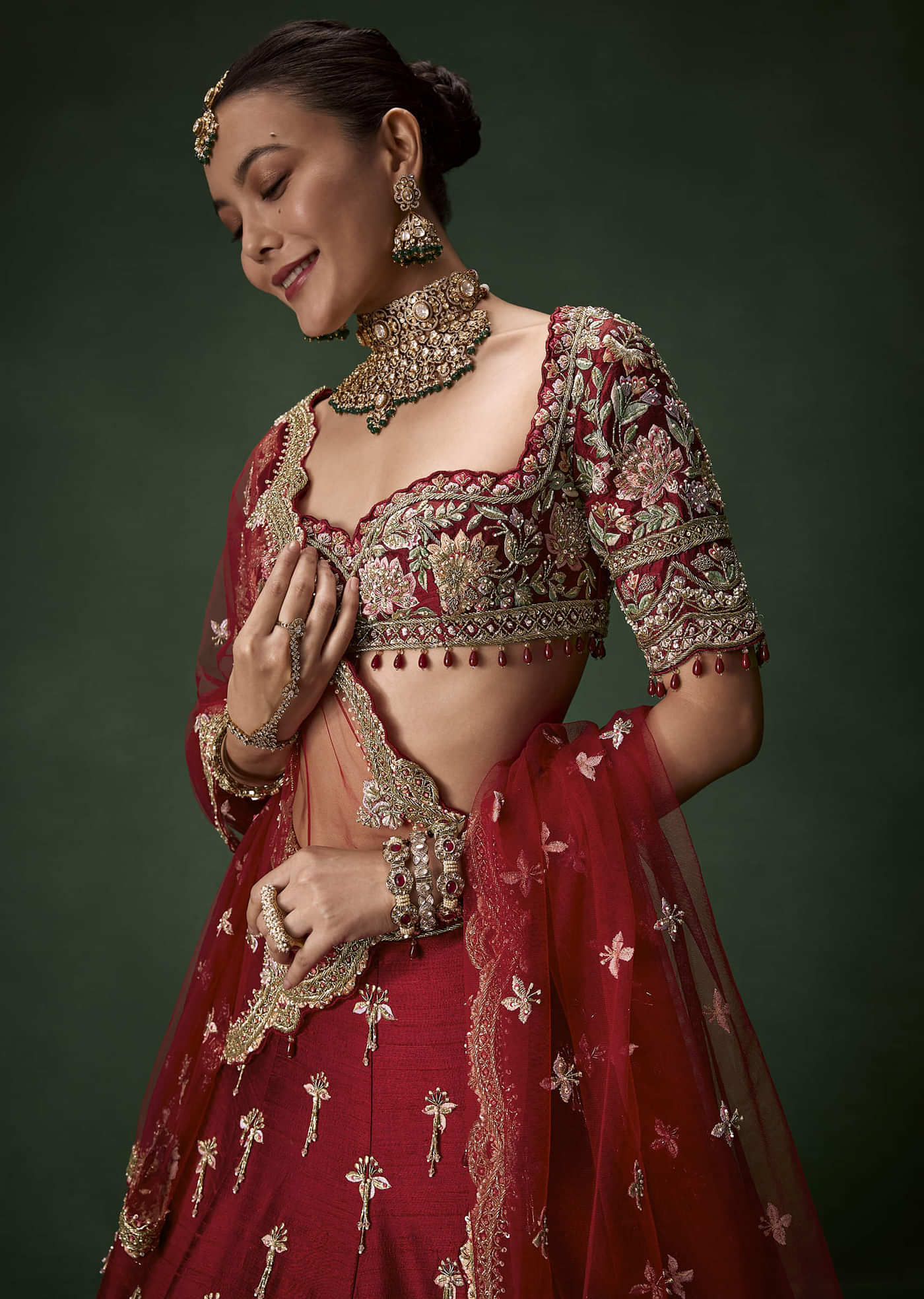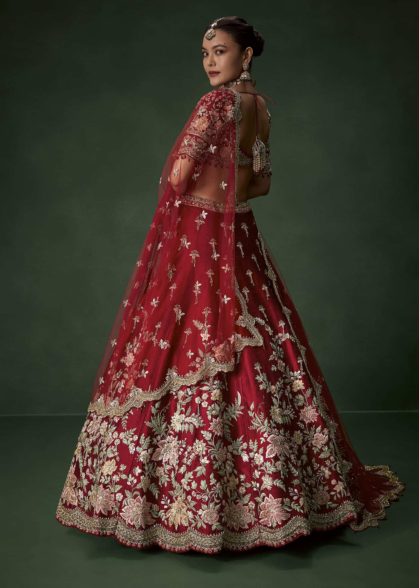 Crafted for the modern bride, this red silk lehenga set exudes regal charm and timeless allure. The rich silk base is adorned with intricate sequin and cutdana embroidery, creating a... More Product Details