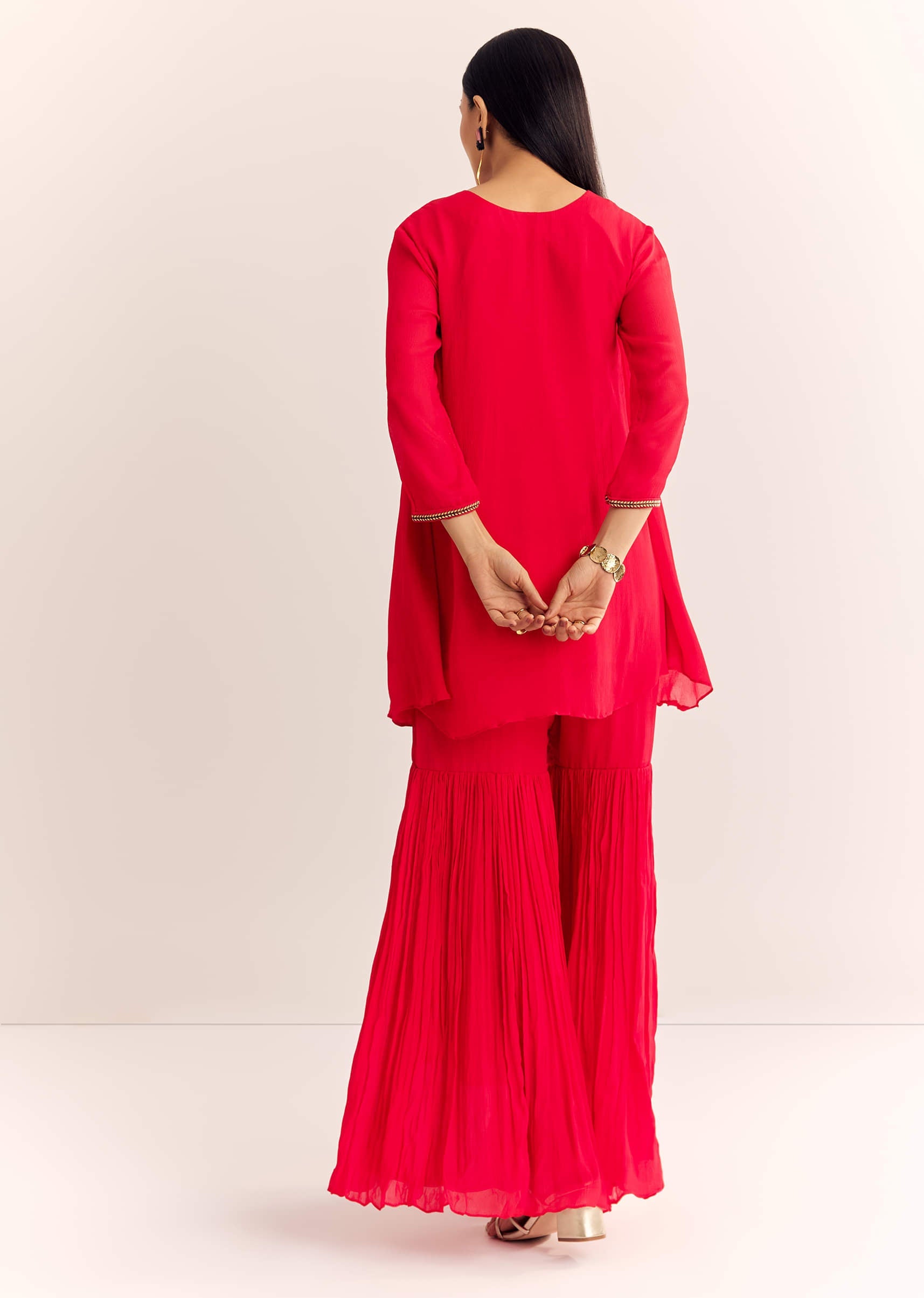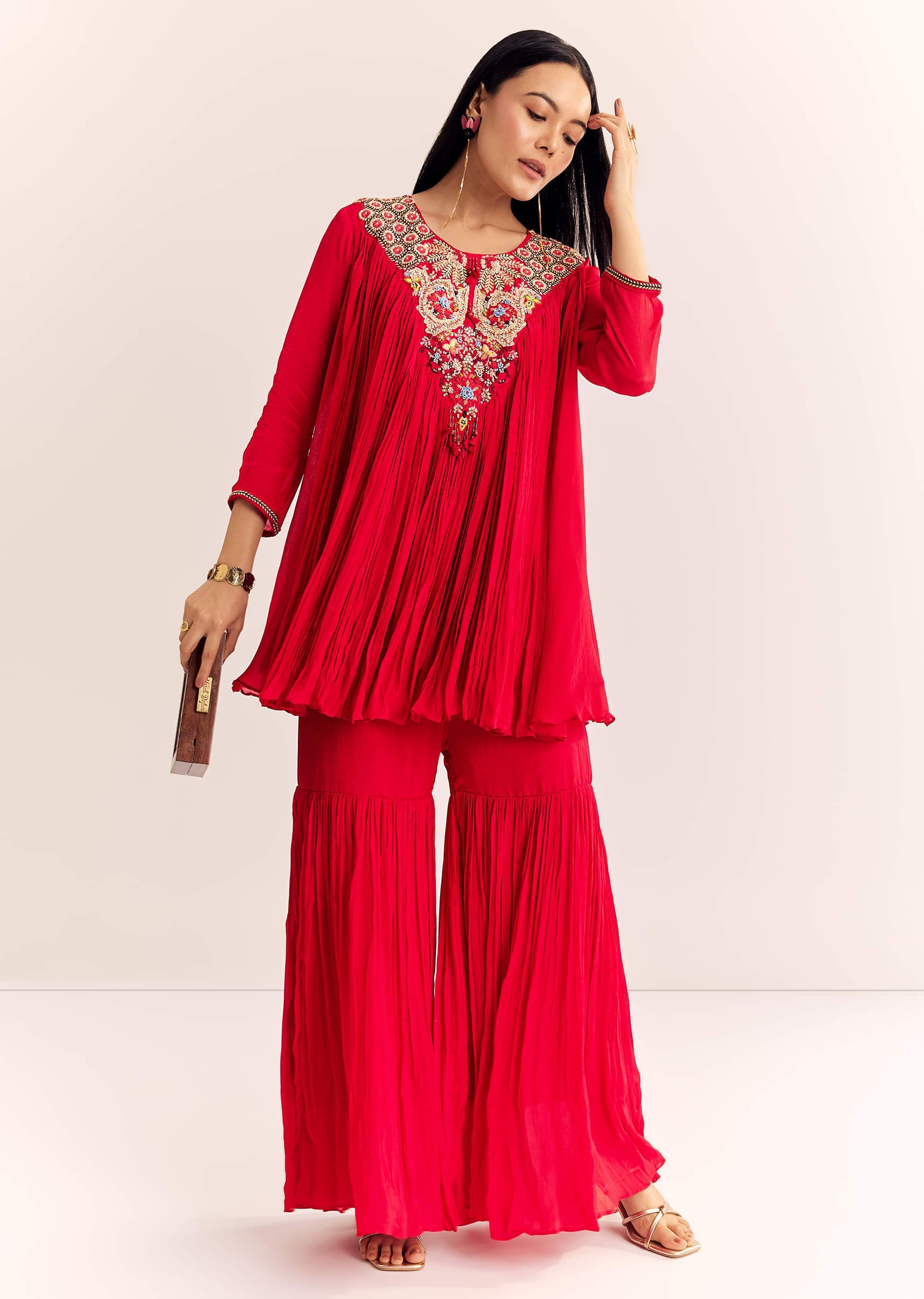 A vibrant red flared kurta in chinon fabric, beautifully embroidered with thread work. A festive-ready ensemble full of energy and style. Like the rhythm of dhol captured in cloth.Awarded as... More Product Details