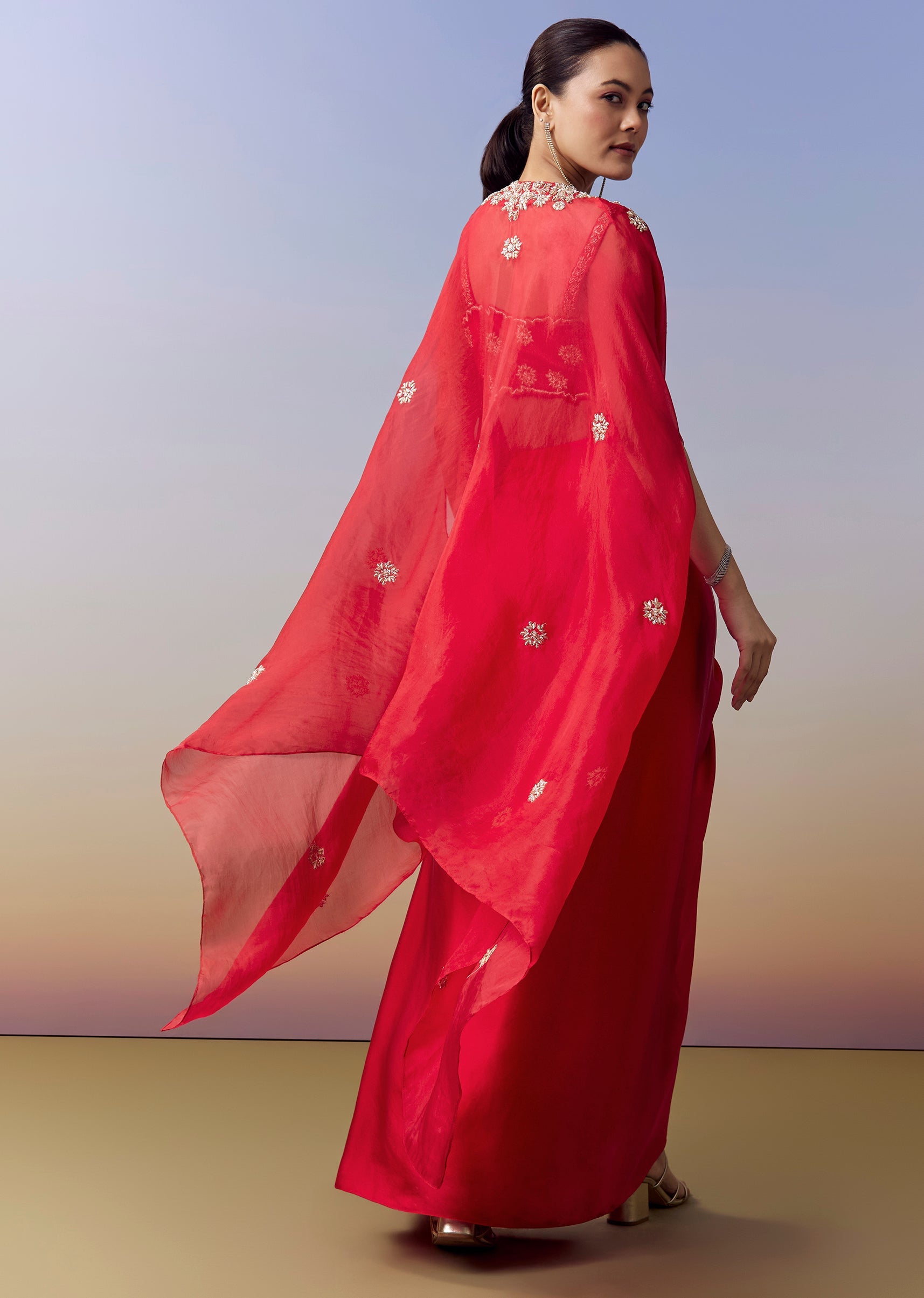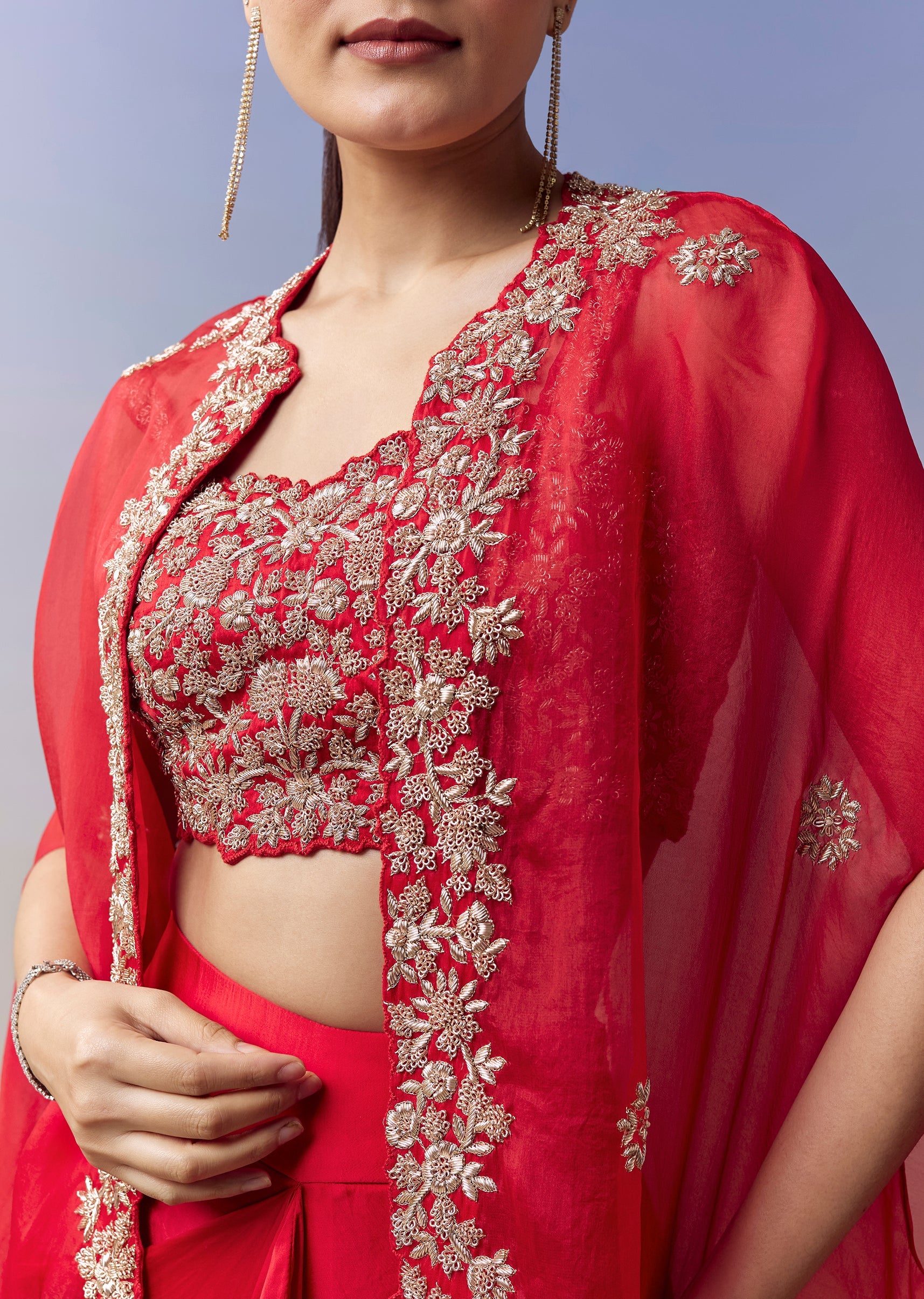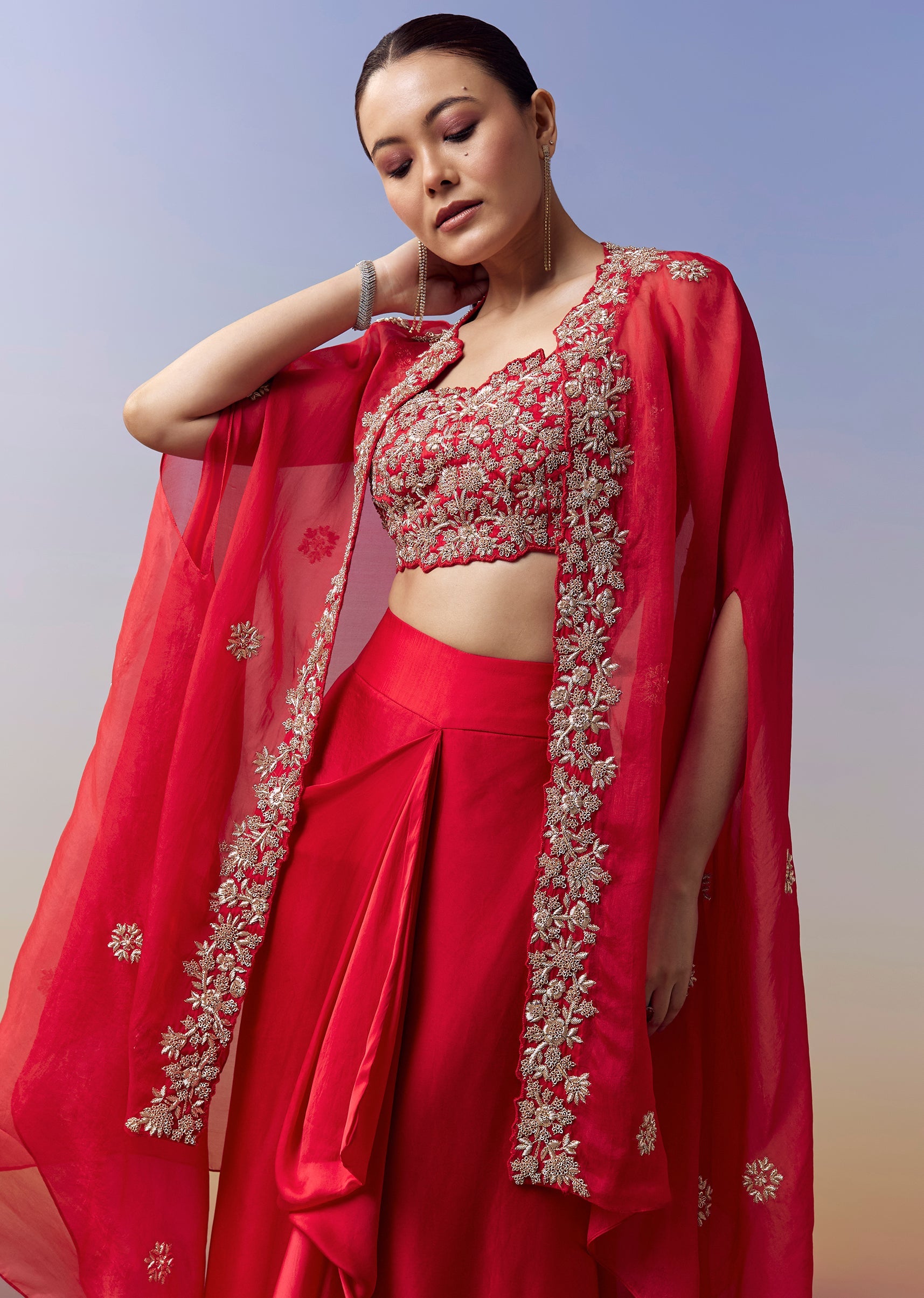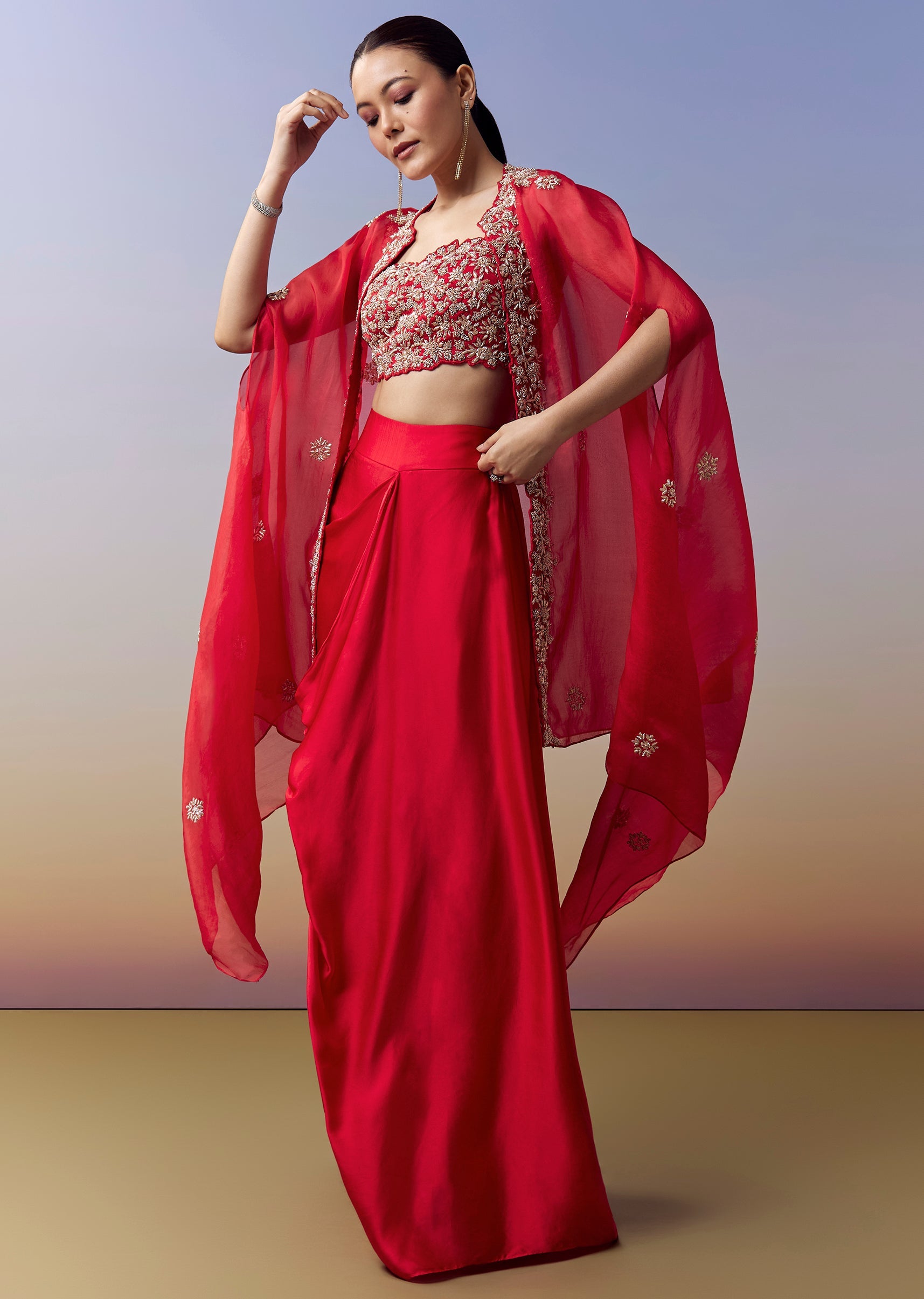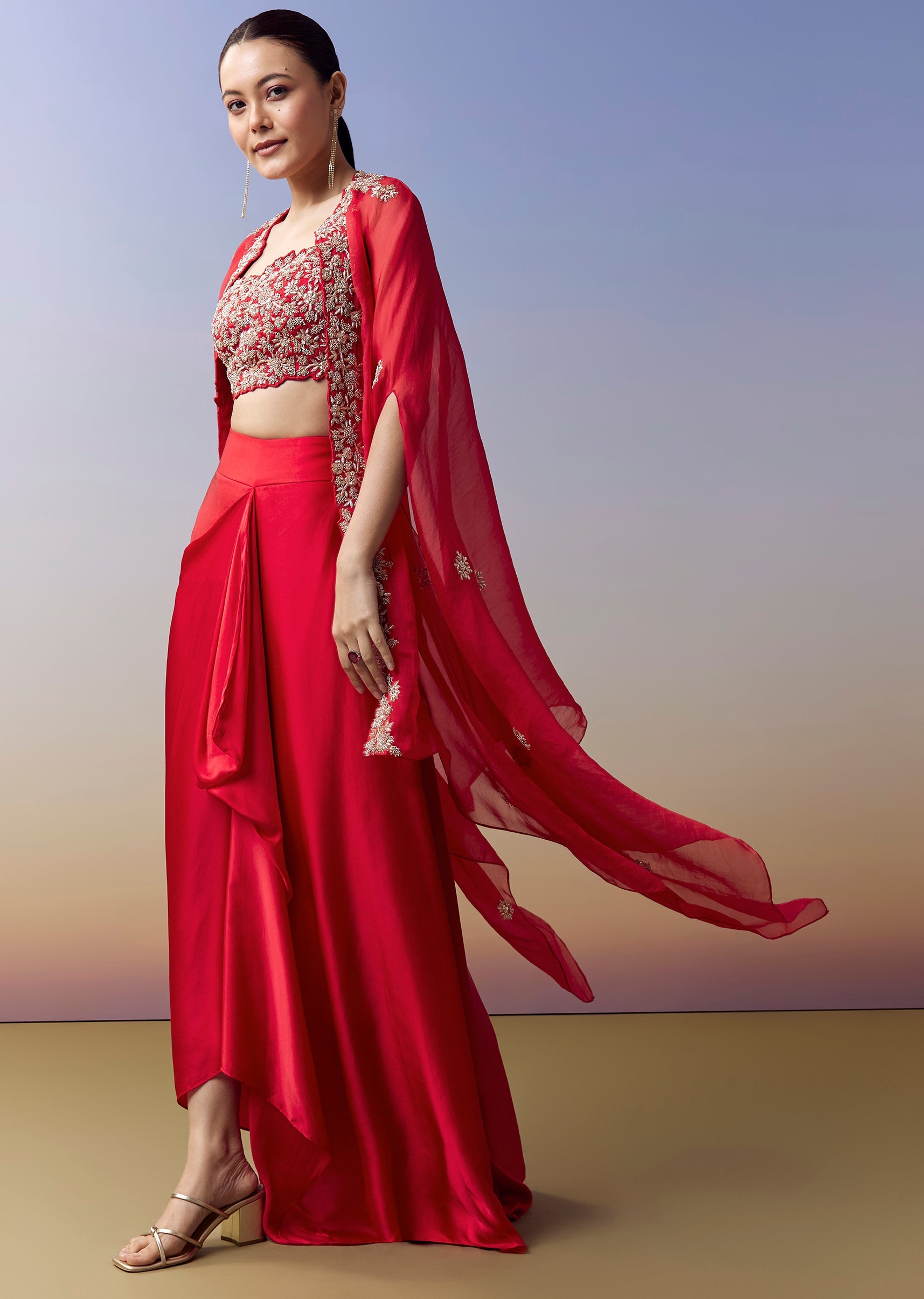 Red Contemporary Crop Top Skirt Set With Zardosi Work And Organza Cape