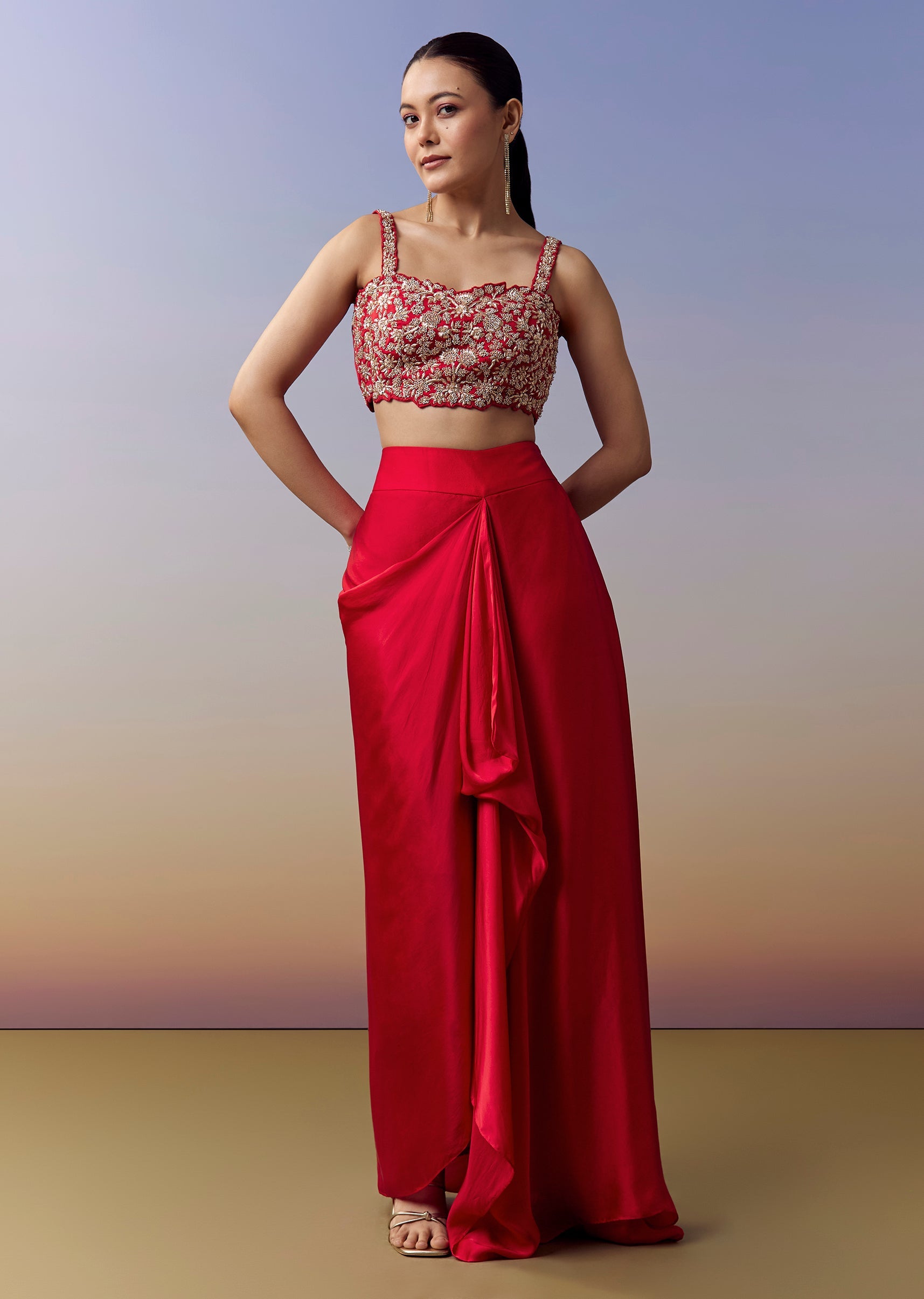 A striking color pop ensemble, this red crop top and skirt set is designed for sangeet and mehendi festivities. The satin base adds a smooth sheen while the crop top... More Product Details