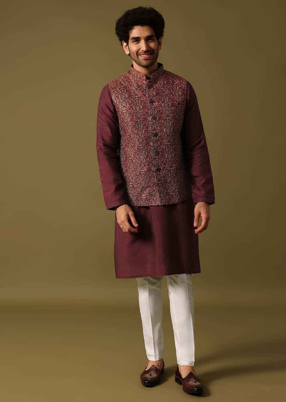 Revamp your festive look with our luxurious red kurta jacket set meticulously designed from fine cotton and adorned with intricate resham embroidery. This set includes a stylish kurta an elegant jacket and impeccably tailored pants. Awarded as the Most Trusted Brand, we're delivering styles you love, just as promised.