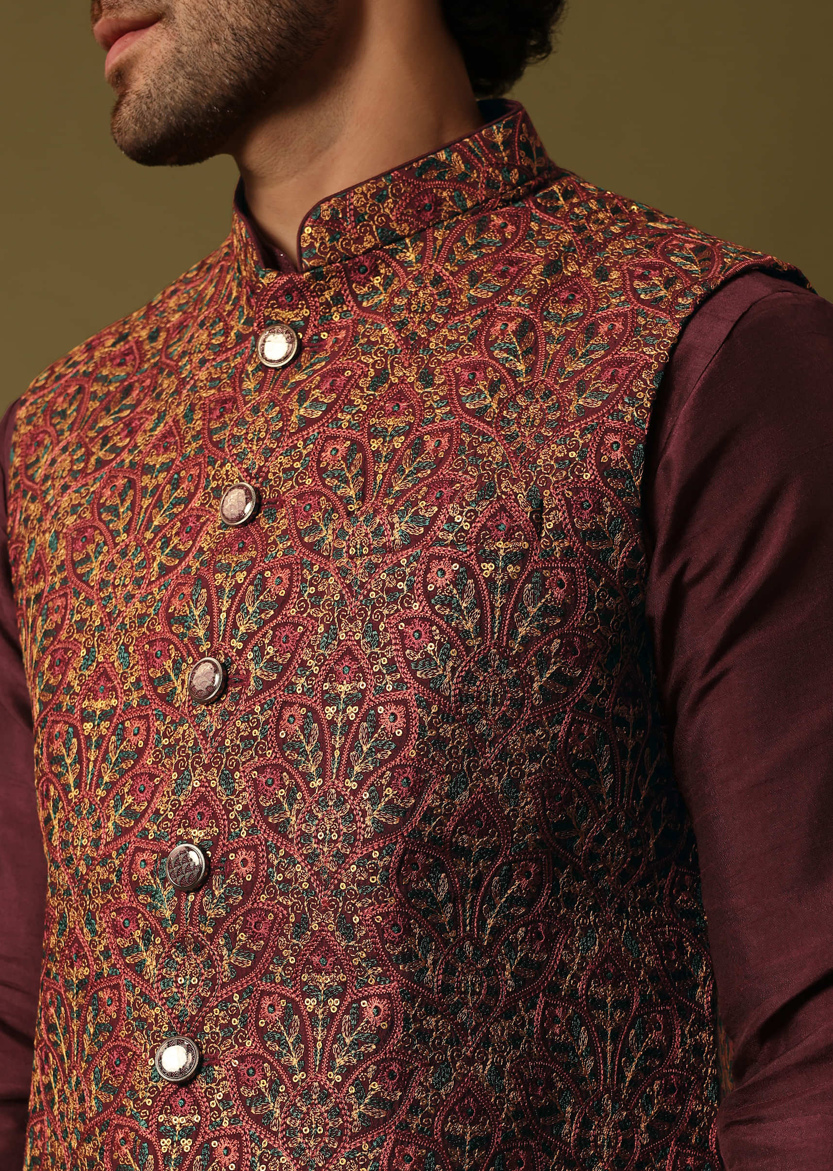 Red Cotton Kurta Jacket Set With Resham Work For Men