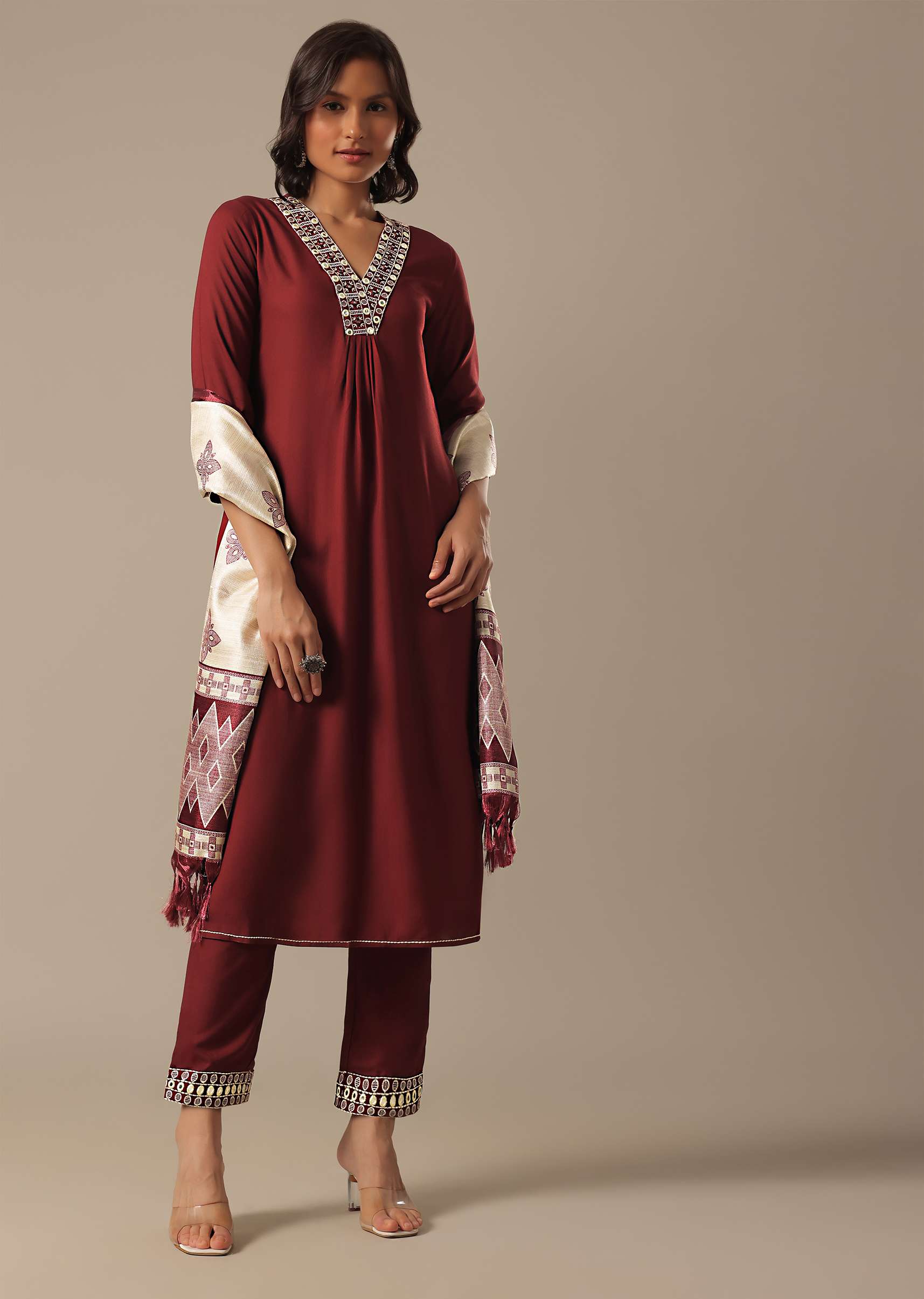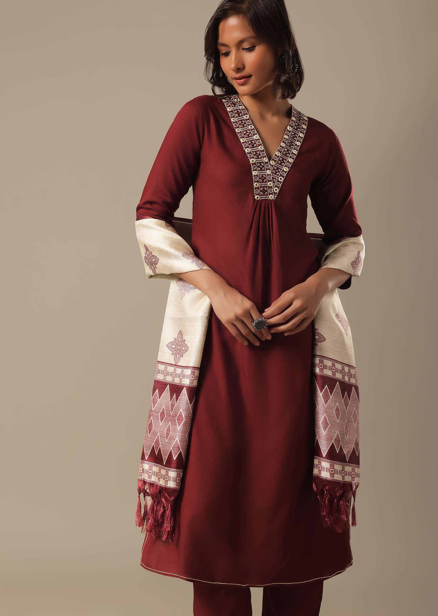 Take your look from desk to dinner with this comfortable pant set. Crafted from breathable cotton it is set on a striking red hue. Enhanced with intricate foil mirror work... More Product Details