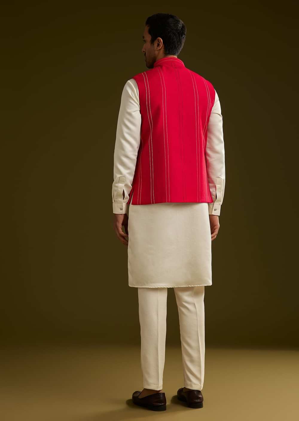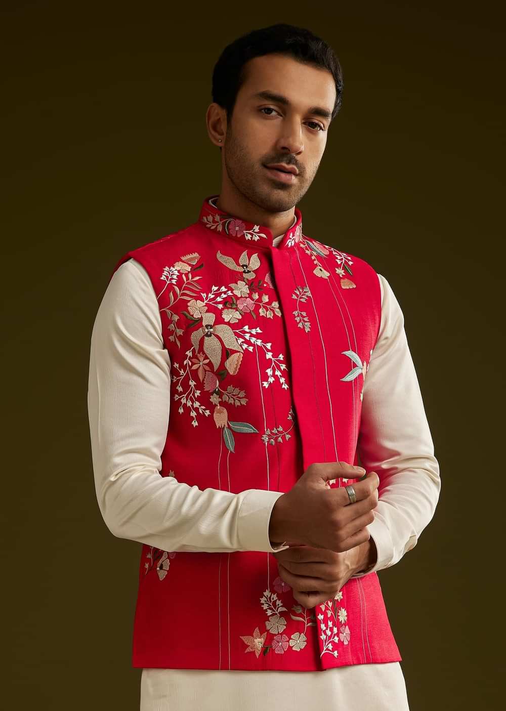 A bold red cotton silk kurta jacket set showcasing exquisite aari and thread work of floral design. Designed with a mandarin collar full sleeves and a structured fit this outfit is an ideal choice for weddings and festivities..Awarded As The Most Trusted Brand We'Re Delivering Styles You Love Just As Promised.