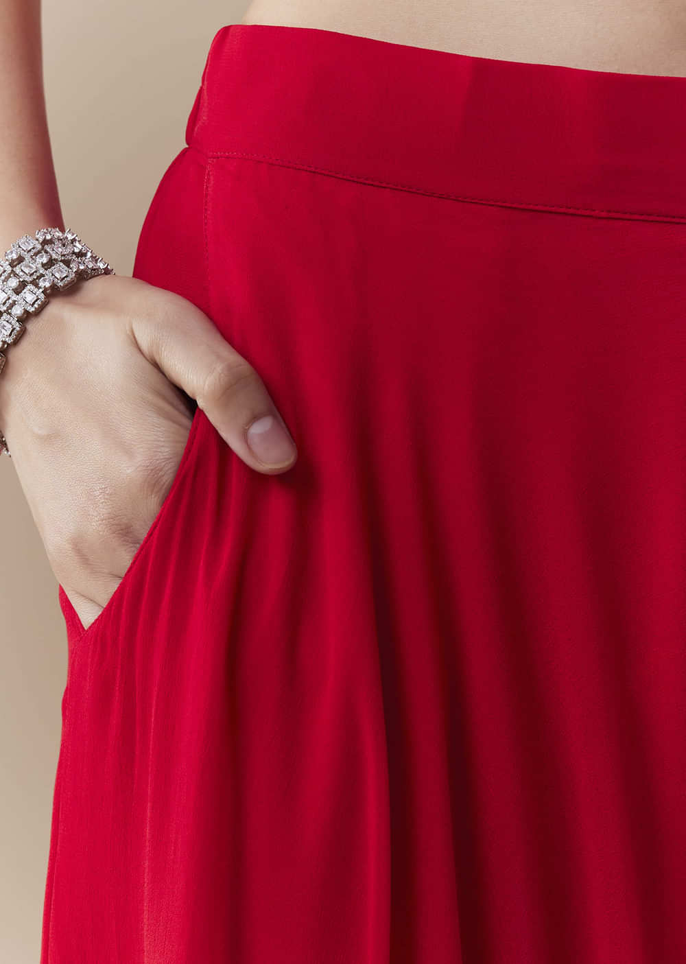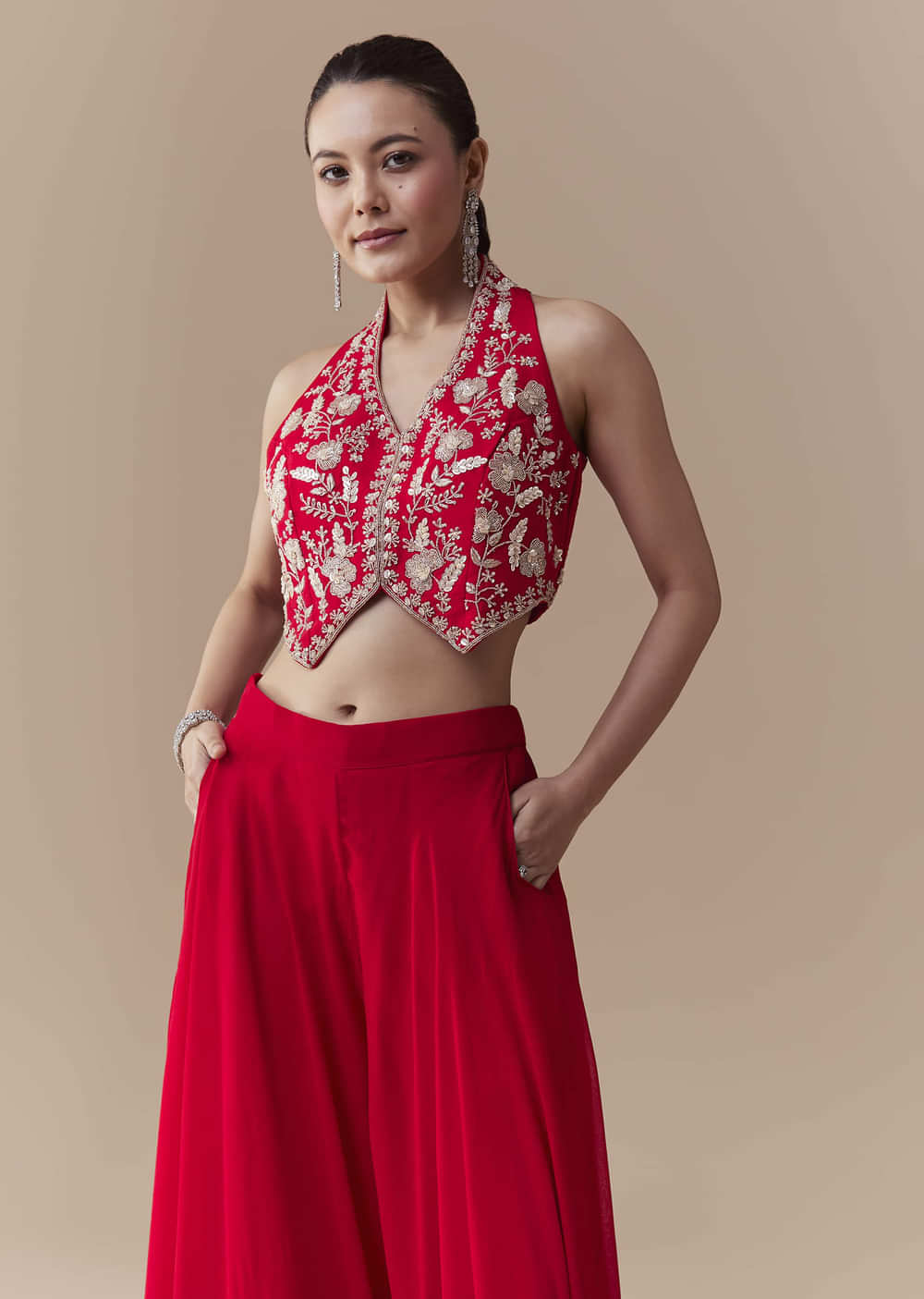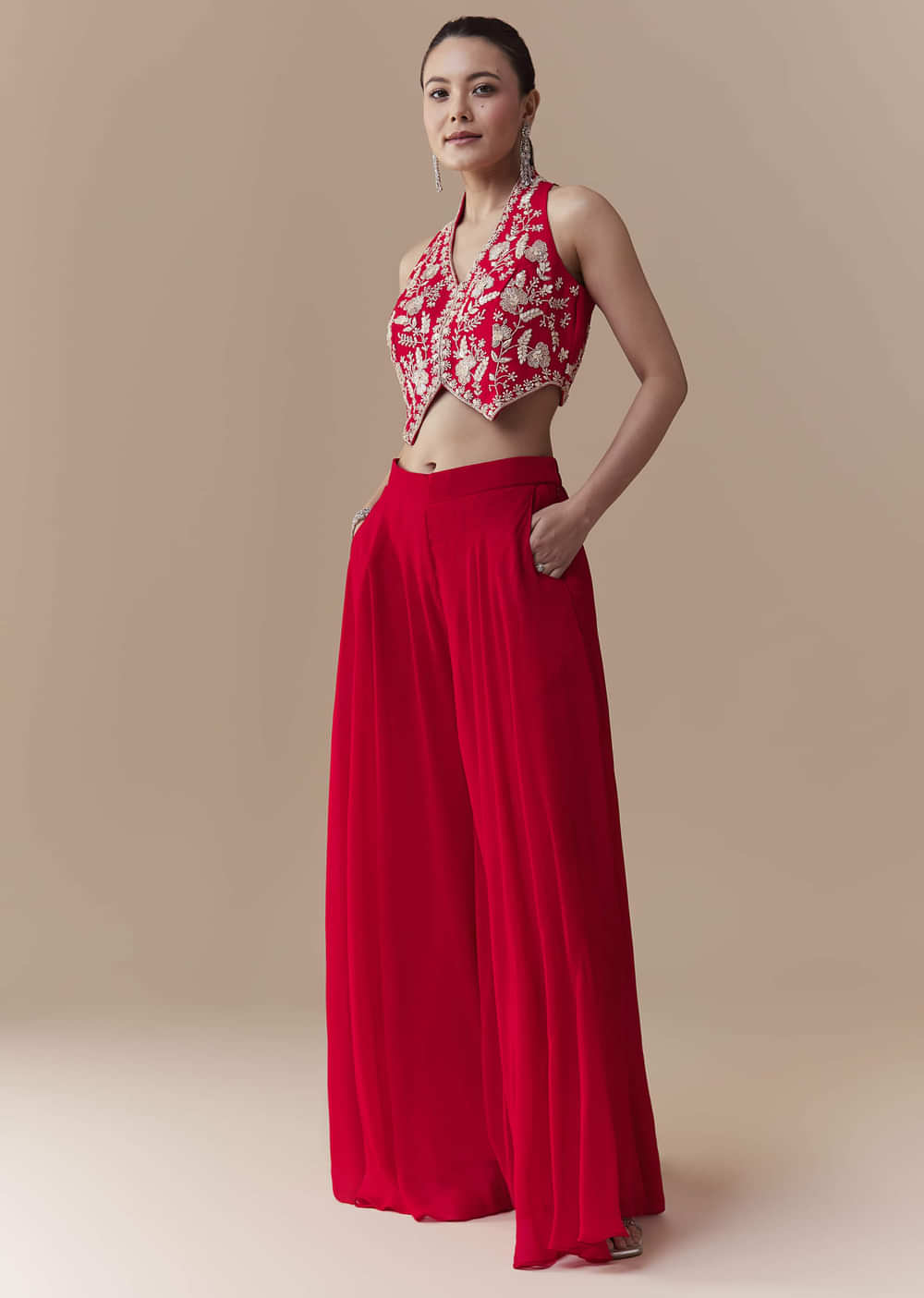 Red Crop Top Silk Palazzo Set with Cudtana Embroidery