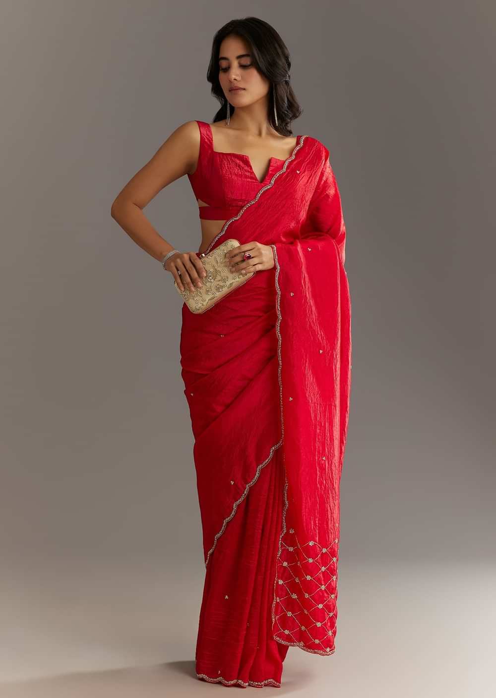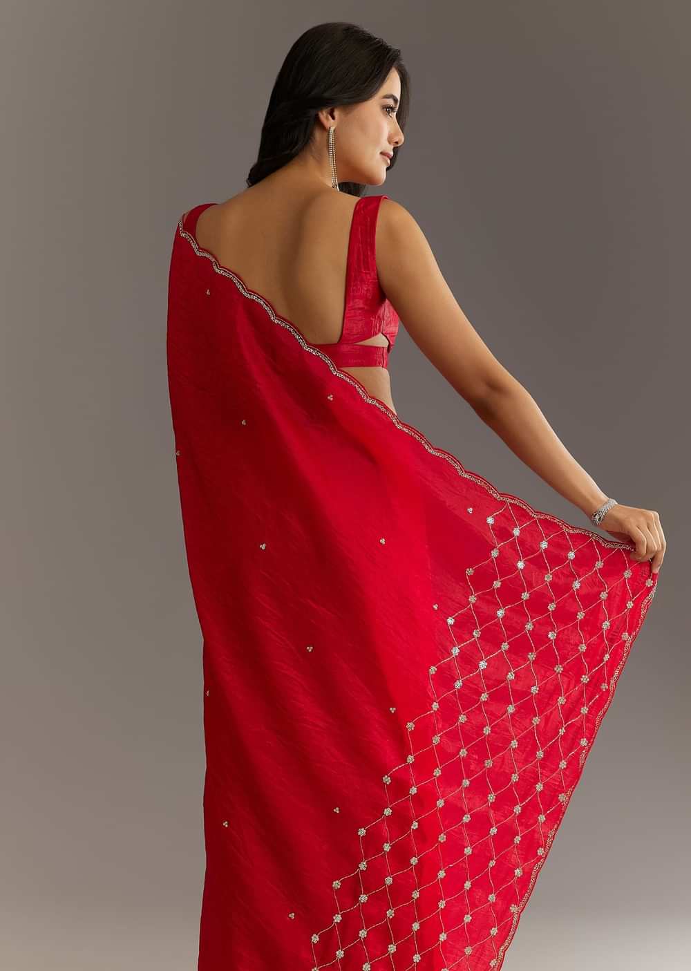 A fiery red saree from the realm of celebration this crushed tissue drape shimmers with cutdana and sequin embroidery like sparks from a festival bonfire.Awarded as the Most Trusted Brand we're delivering styles you love just as promised.