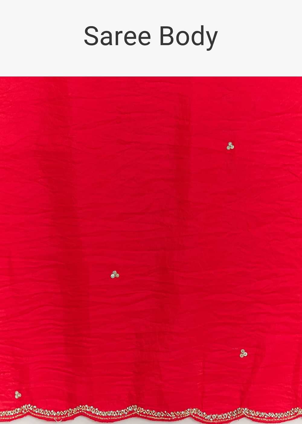 A fiery red saree from the realm of celebration this crushed tissue drape shimmers with cutdana and sequin embroidery like sparks from a festival bonfire.Awarded as the Most Trusted Brand... More Product Details