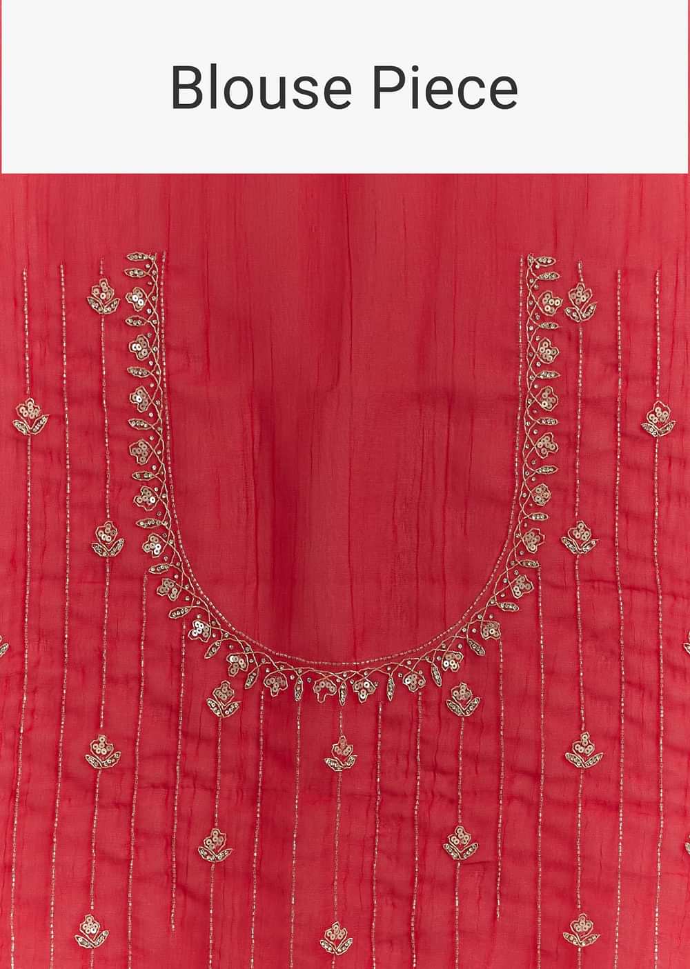 Dipped in ruby hues and kissed with scallop lace this crushed tissue saree glimmers with sequins and cutdana—crafted for the queen of twilight festivities.Awarded as the Most Trusted Brand we're delivering styles you love just as promised.
