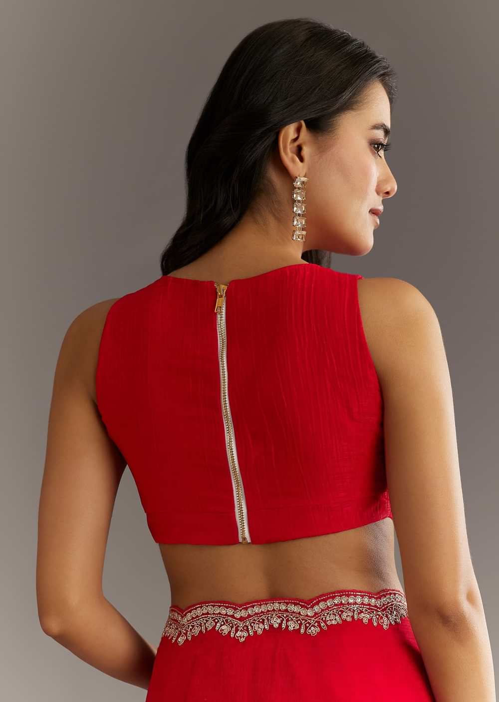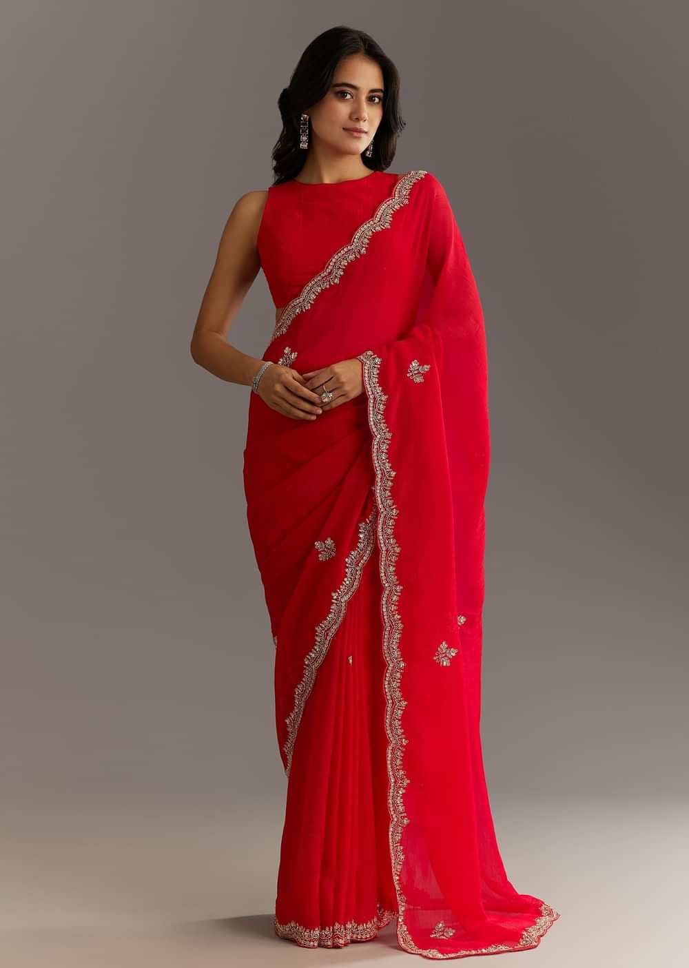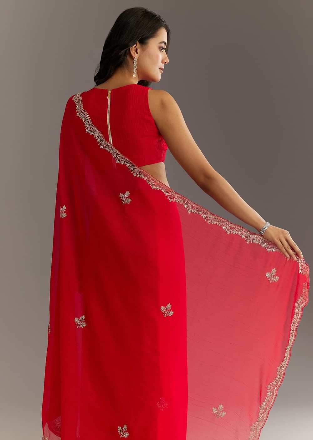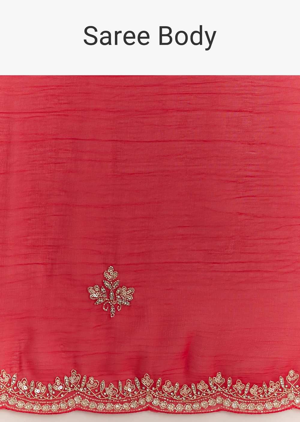 Red Crushed Tissue Embroidered Saree With Scallop Border