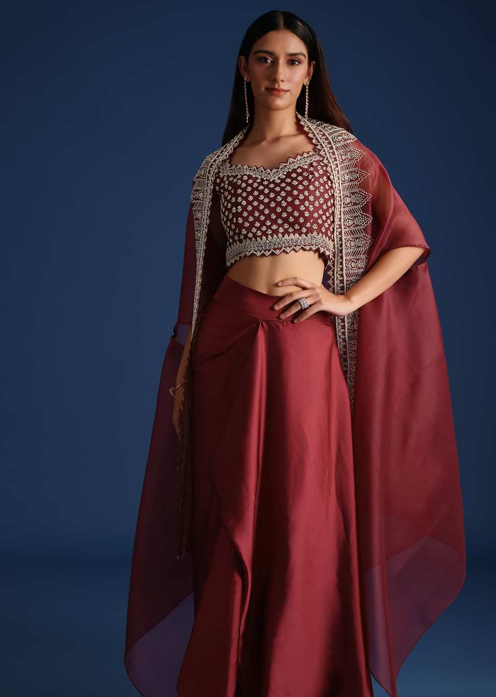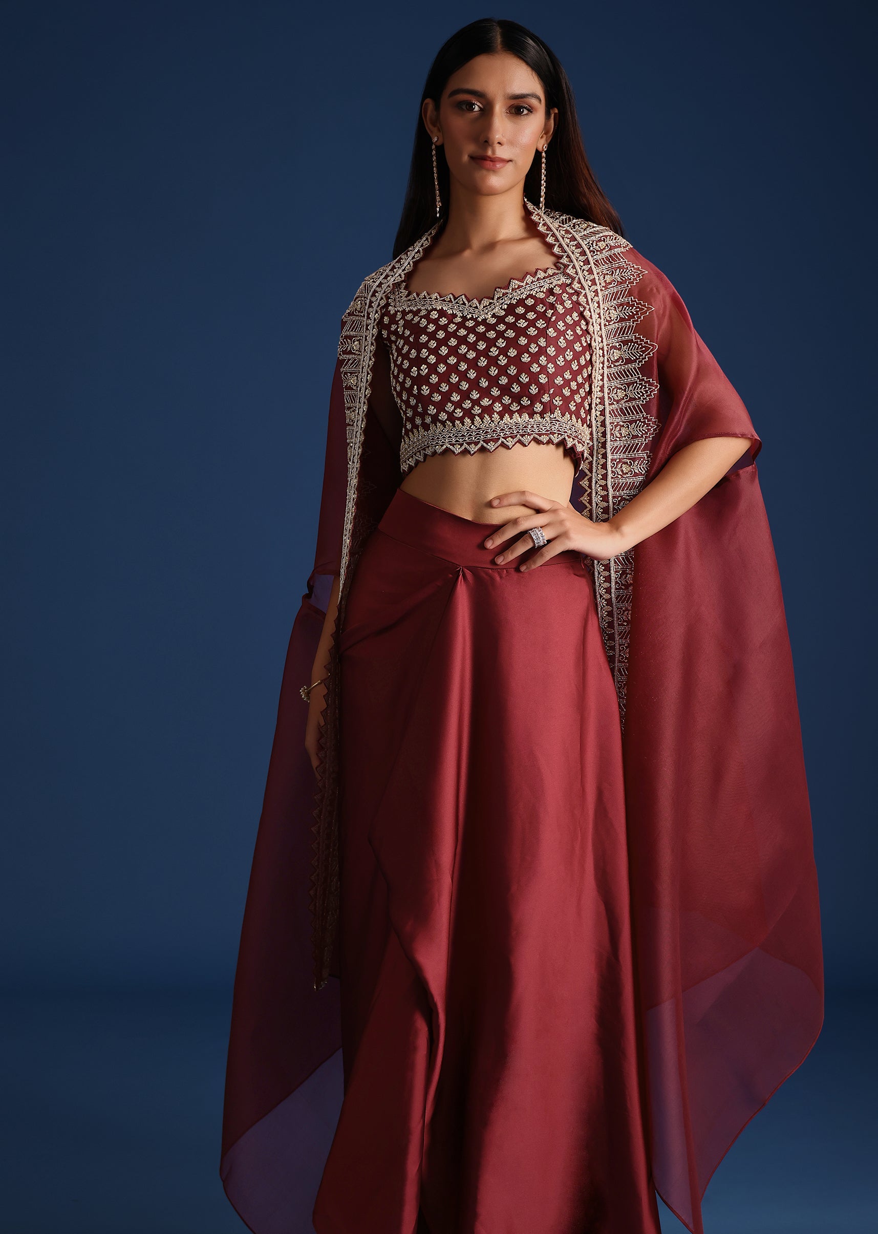 Red Cutdana Work Jacket With Draped Skirt And Crop Top