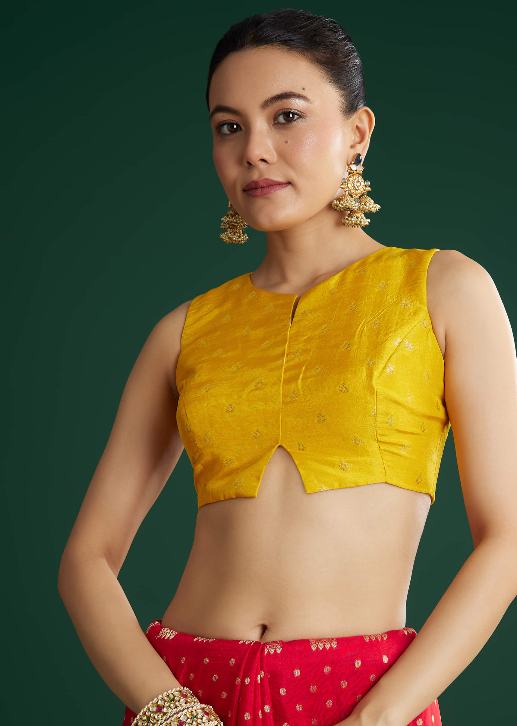 Complement this red saree with mustard blouse using kundan jhumkas for a rich ethnic charm, or add contrast with green stone studs for a vibrant twist.