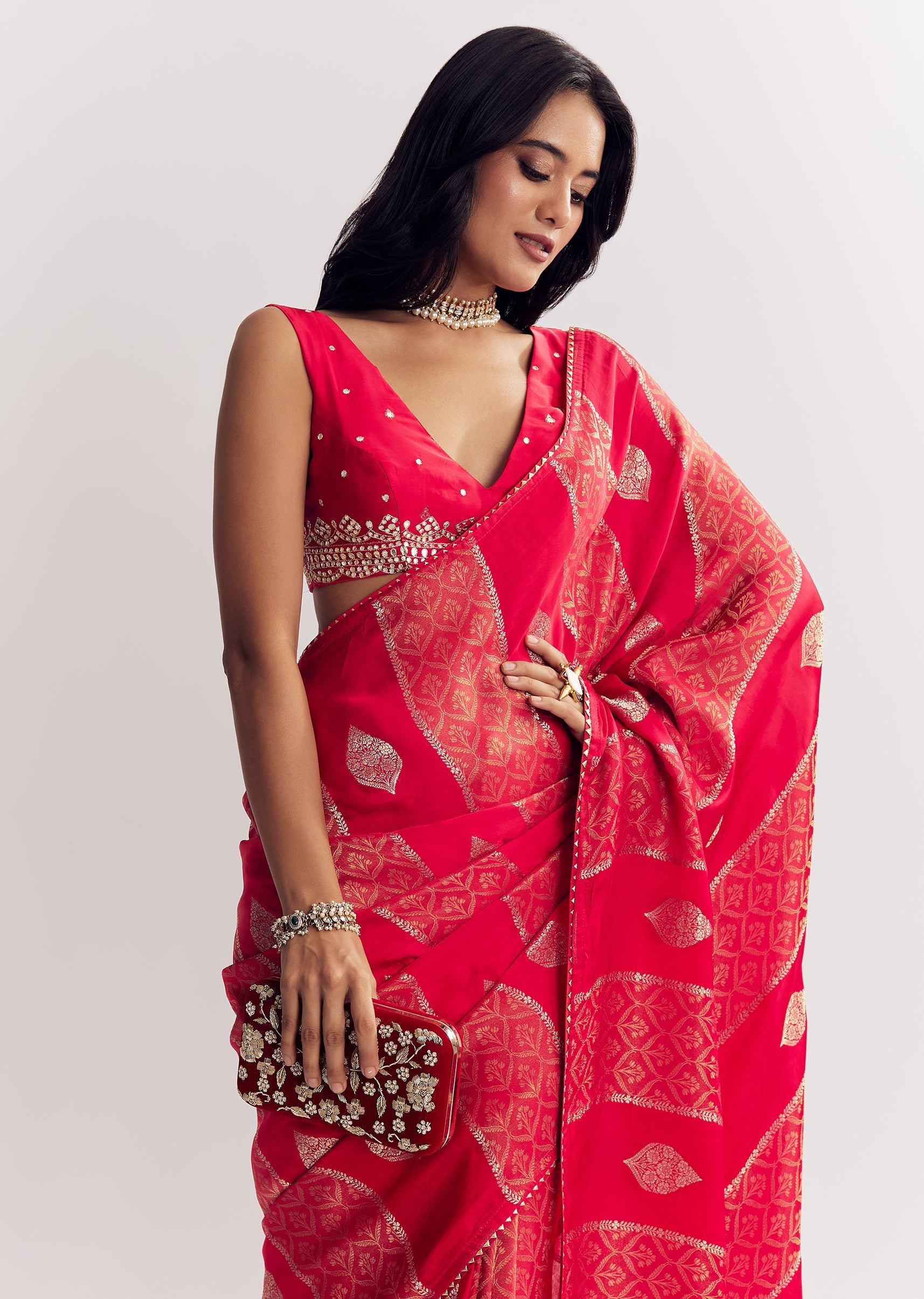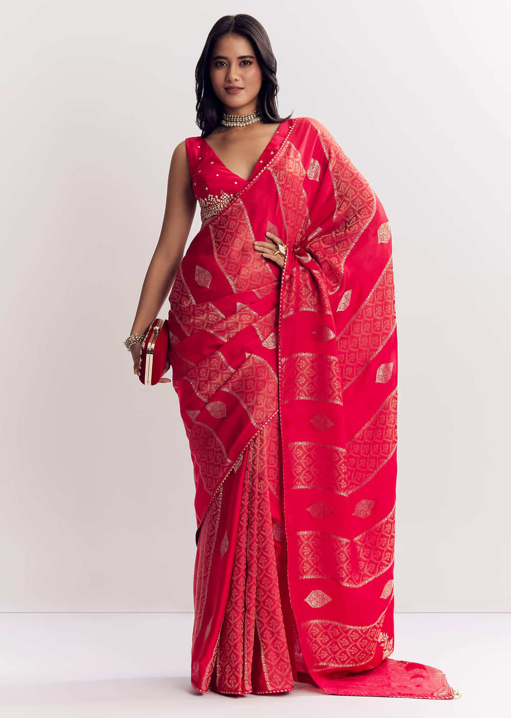 This red dola silk saree brings tradition alive with its gota patti bordered motifs and a regal woven texture. Awarded as the Most Trusted Brand, we're delivering styles you love, just as promised.