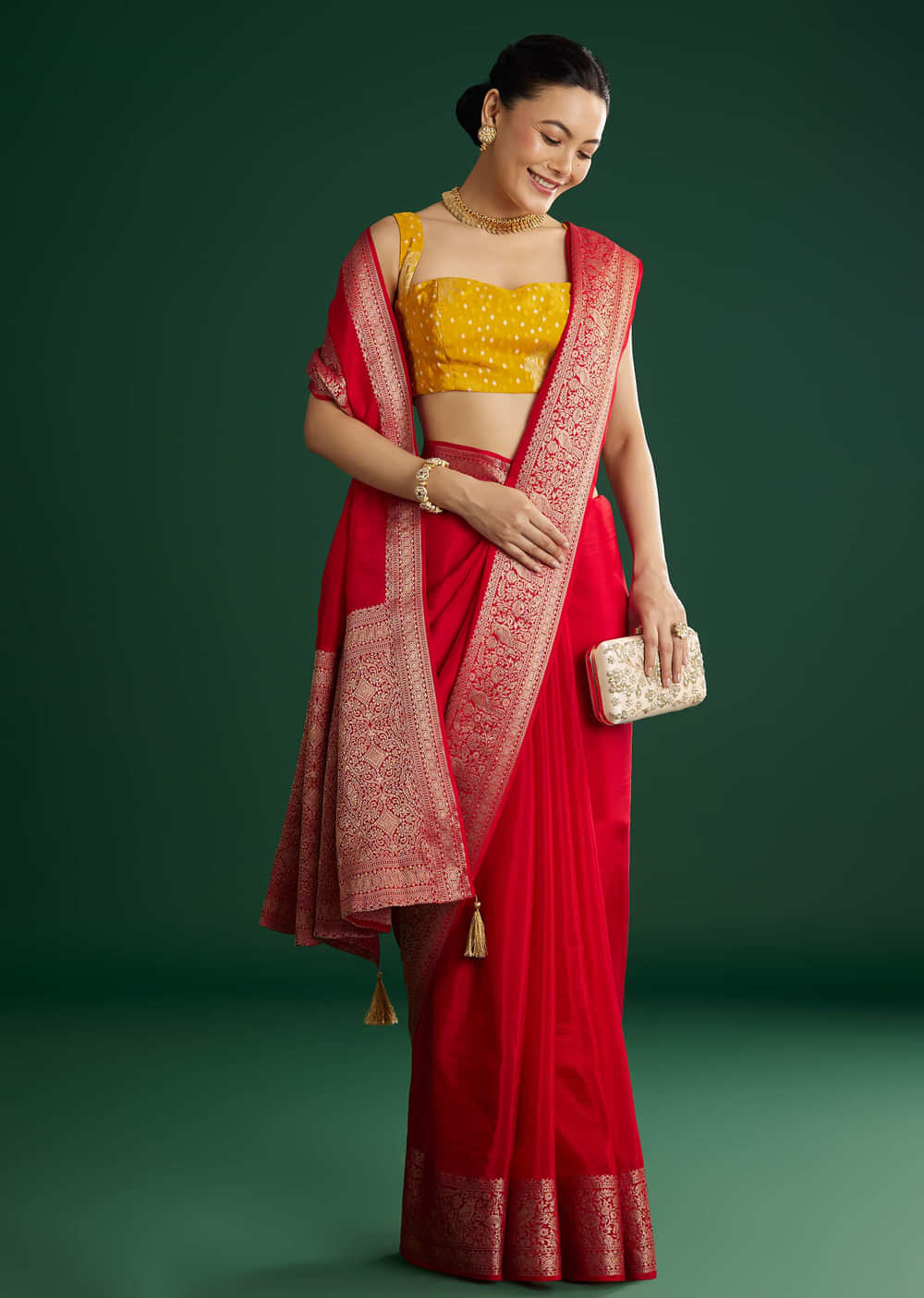 Style this red and mustard saree with a polki set, temple jewelry and studs.