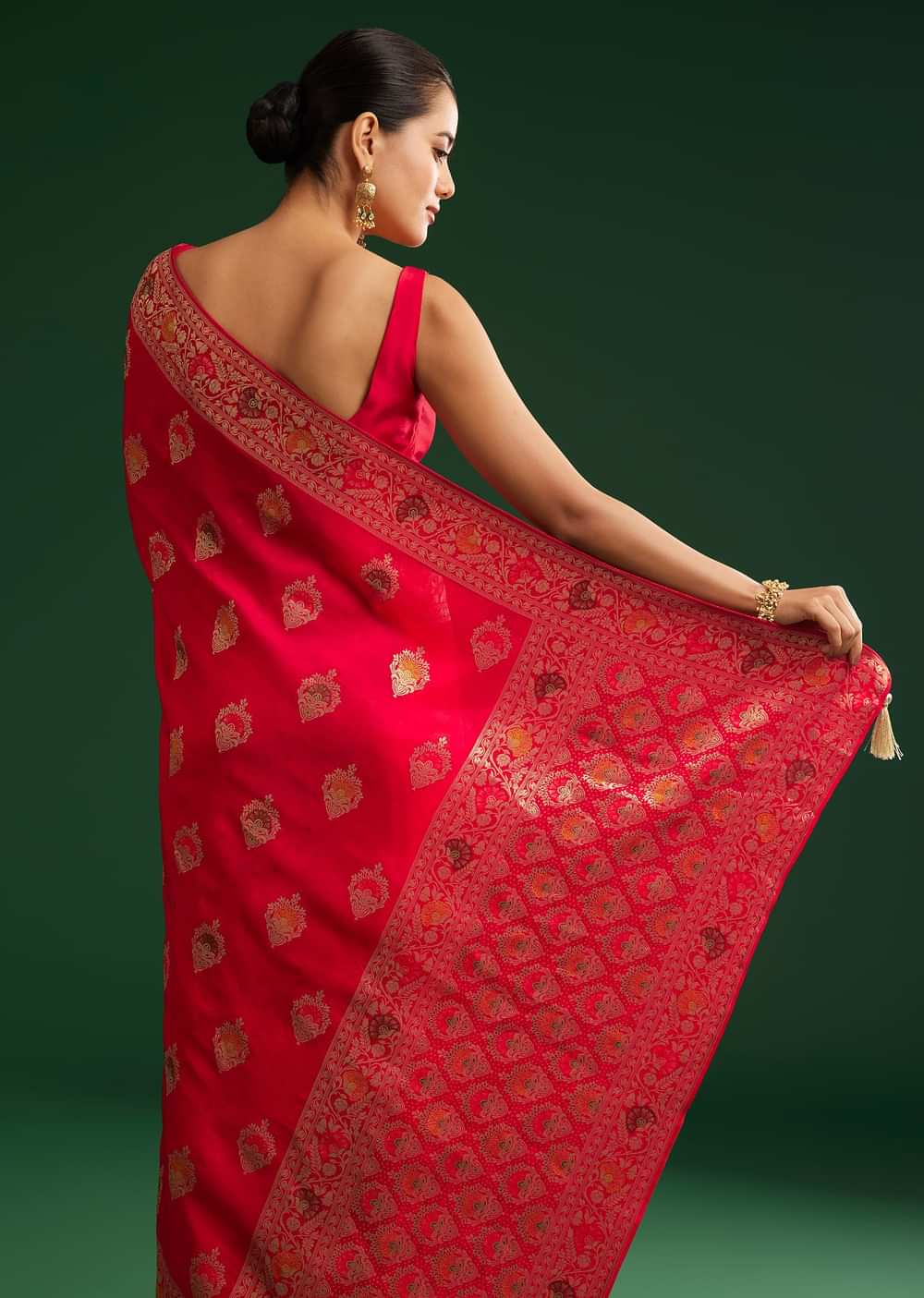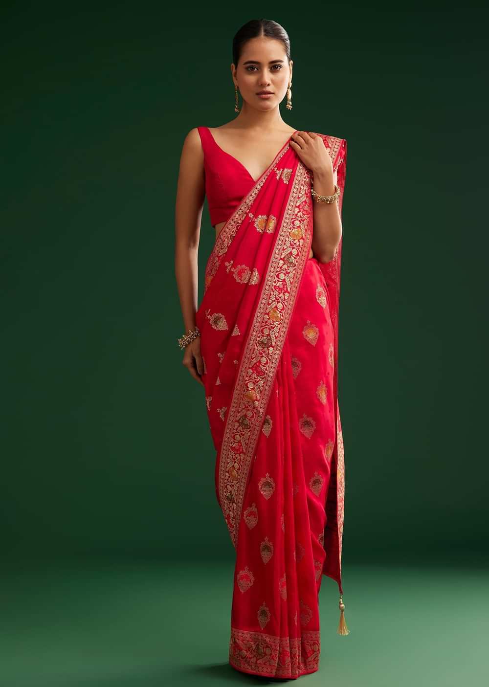 Bold and vibrant, this red Dola silk saree is beautifully enhanced by intricate zari weaving. Its striking color and graceful style make it ideal for weddings, festivals, and grand celebrations.... More Product Details