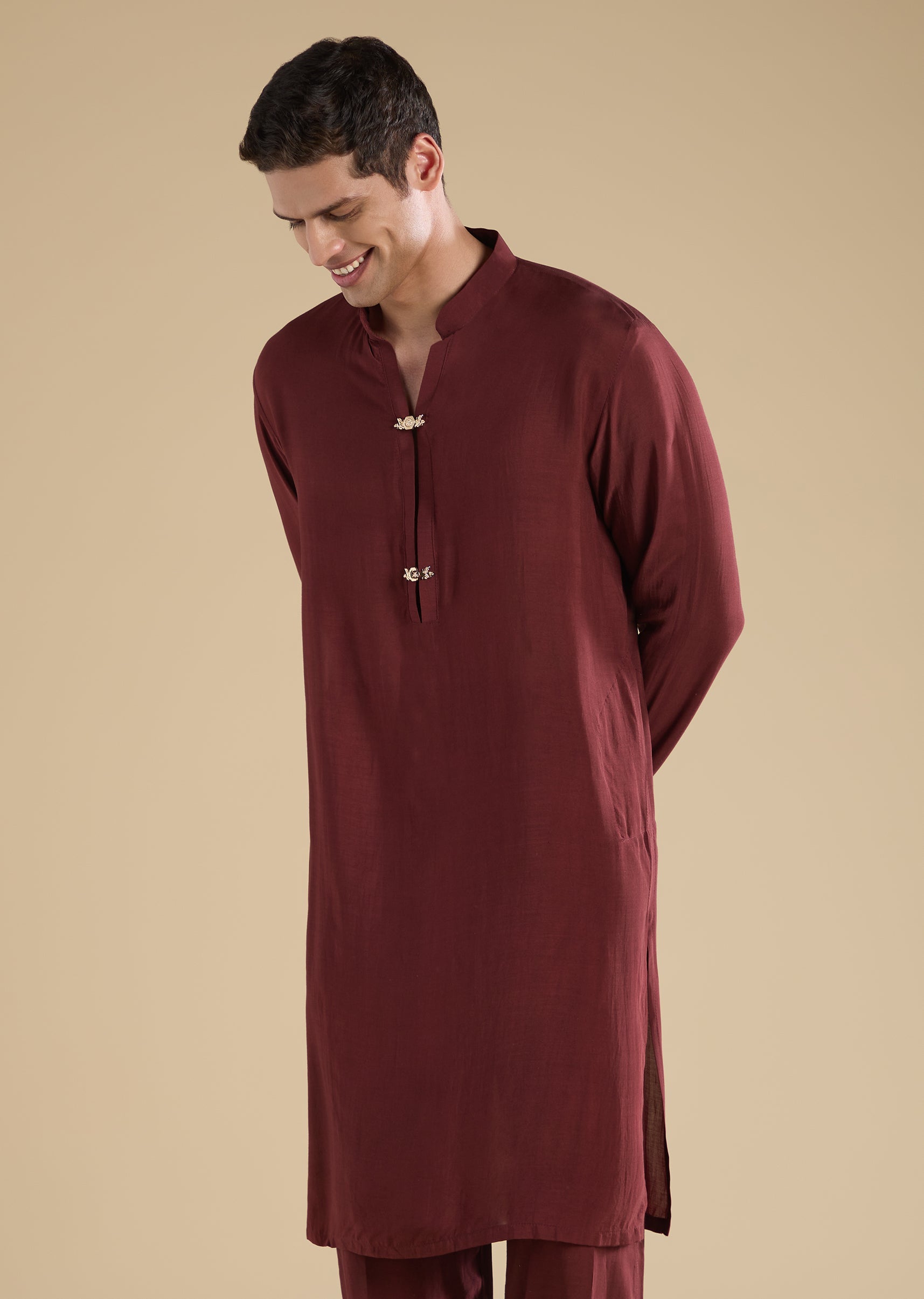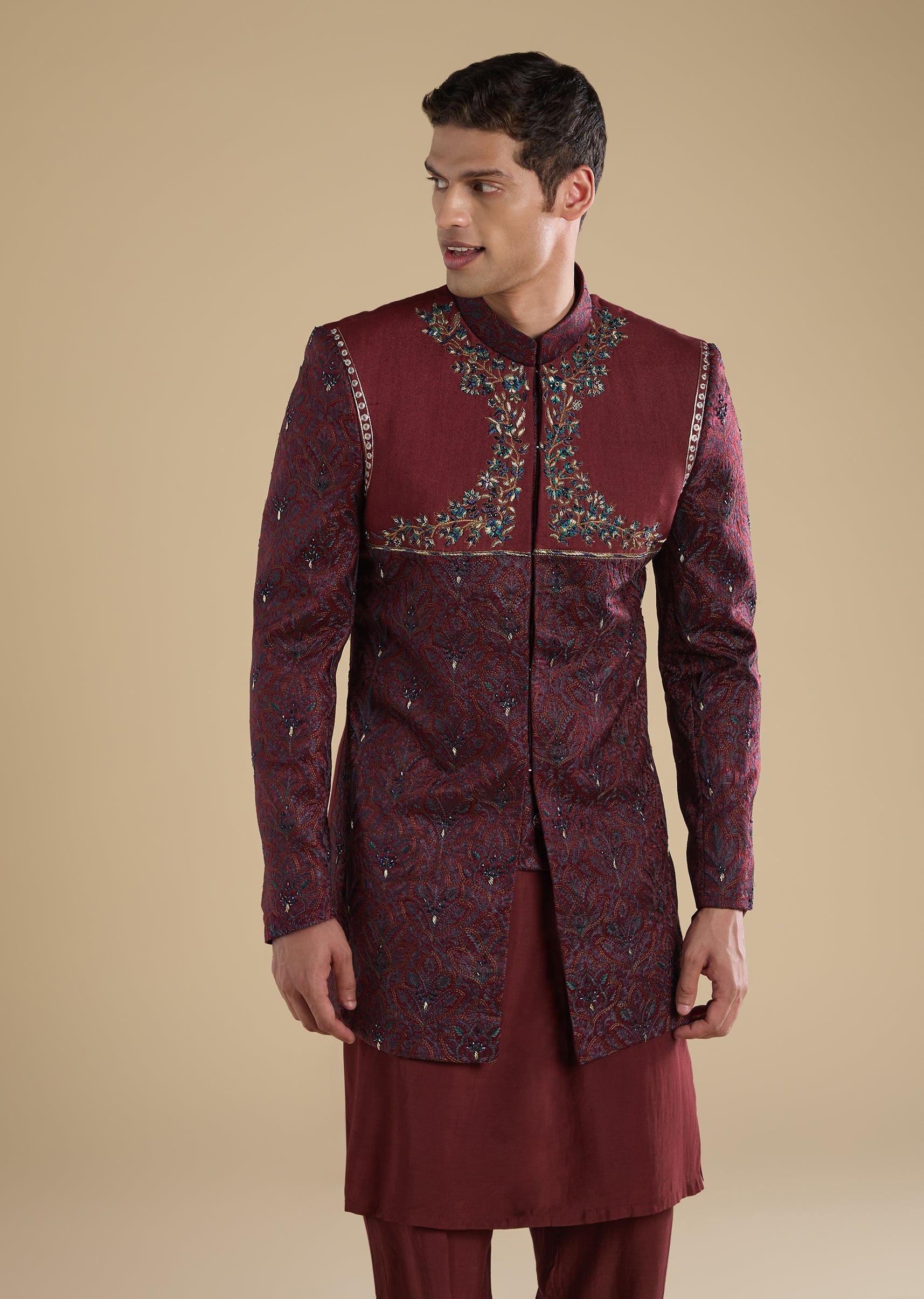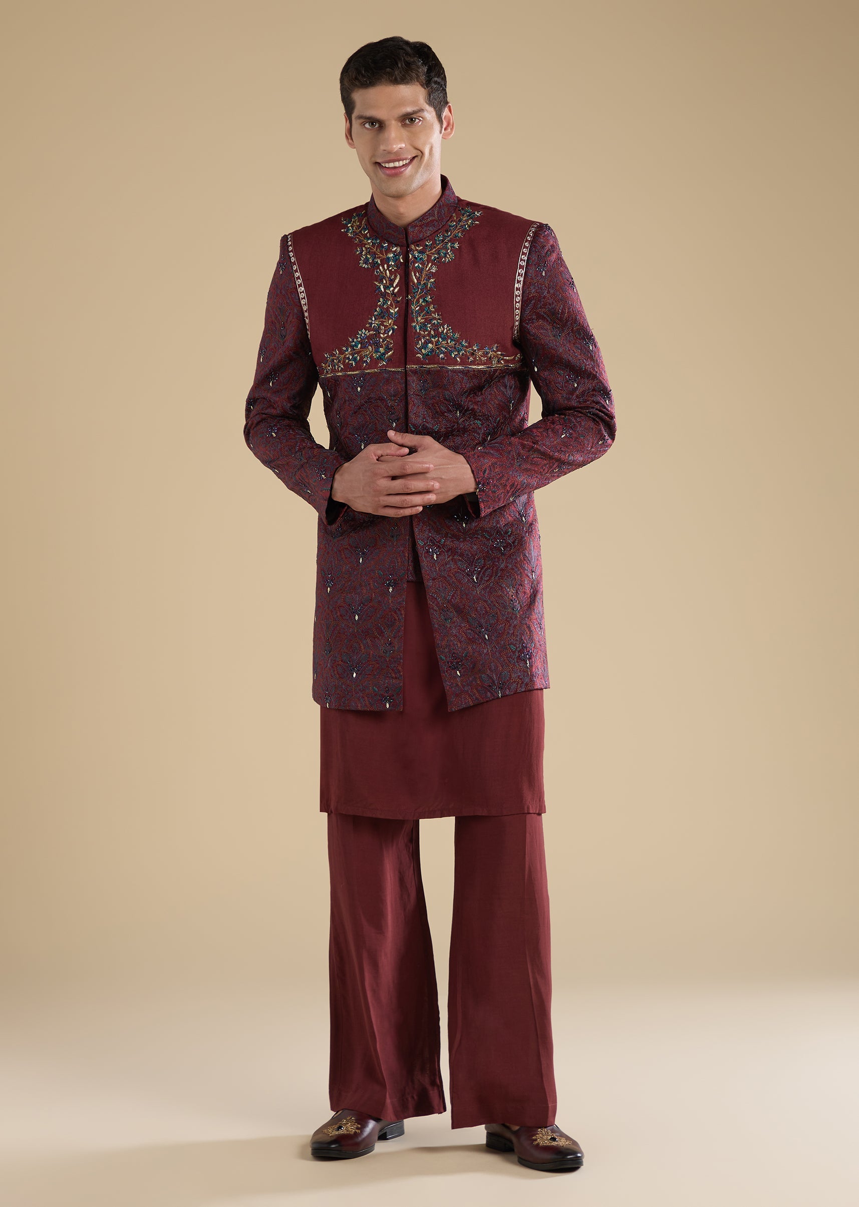 Crafted in muslin, this red indo-western set features thread embroidery with cut dana and zari detailing. Designed with a mandarin collar, full sleeves and front hook-eye and button closure, it is paired with a matching kurta and straight-fit mid-waist pants—ideal for mehendi and wedding occasions. Awarded as the Most Trusted Brand, we're delivering styles you love, just as promised.