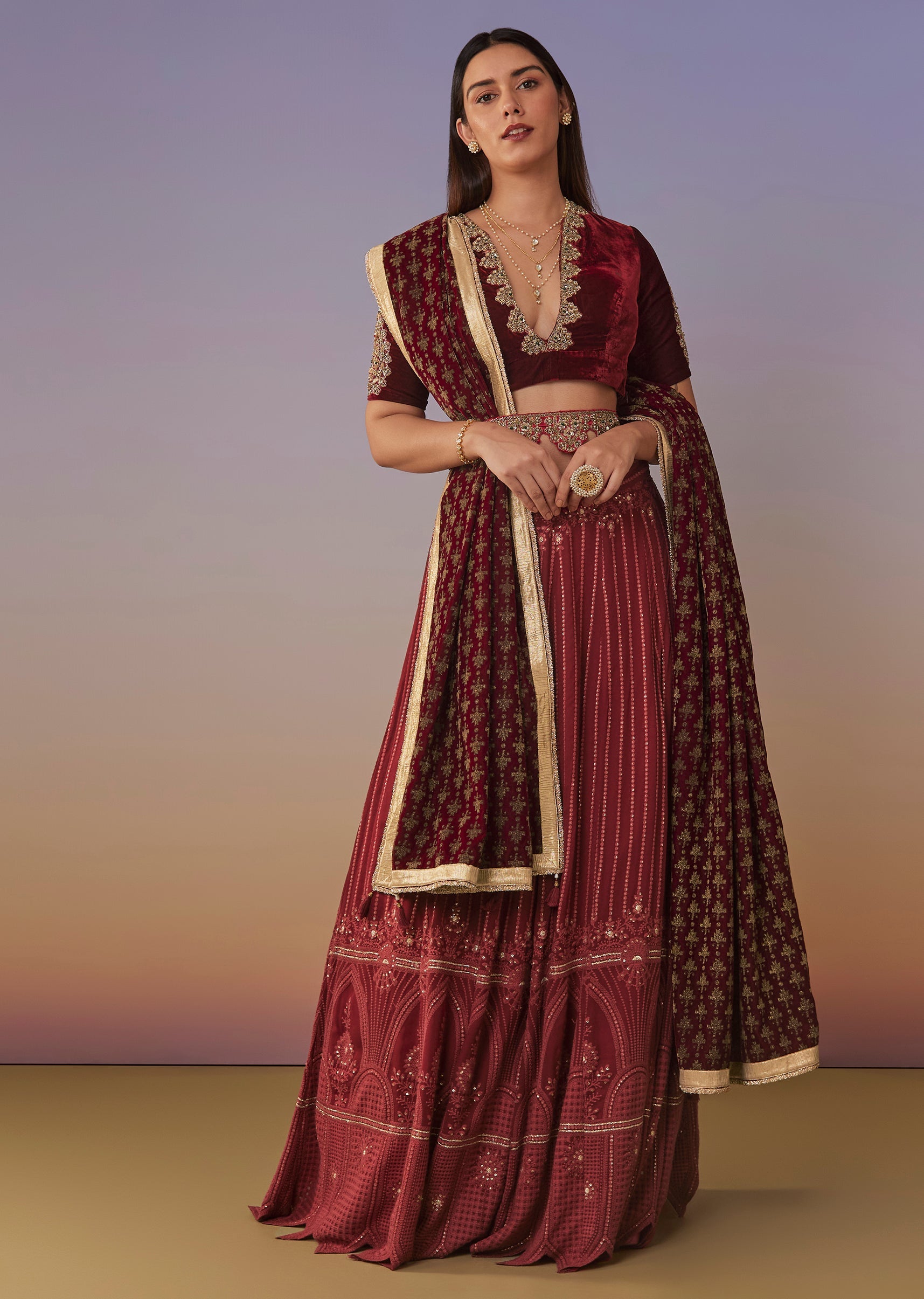 A bold red bridesmaid lehenga set featuring a Lucknowi-inspired embroidered lehenga paired with a rich velvet half-sleeve V-neck blouse. Finished with bead and stone work and styled with a matching belt for definition, this set is made for sangeet and wedding nights. Awarded as the Most Trusted Brand, we're delivering styles you love, just as promised.