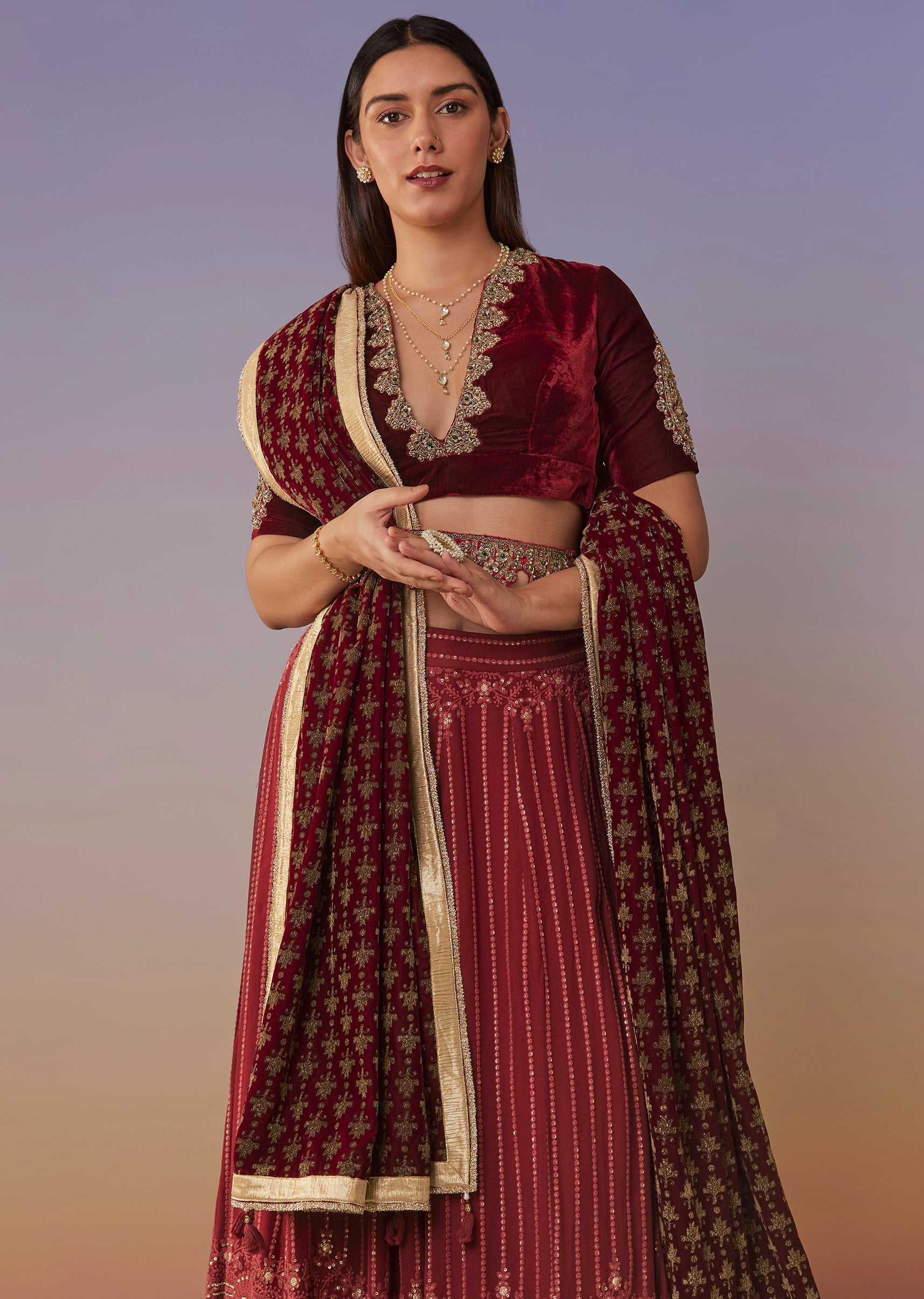 Fit Tips:Velvet blouses fit snug—if you’re between sizes, size up for comfort; belt helps cinch the waist so the lehenga sits secure and defined.