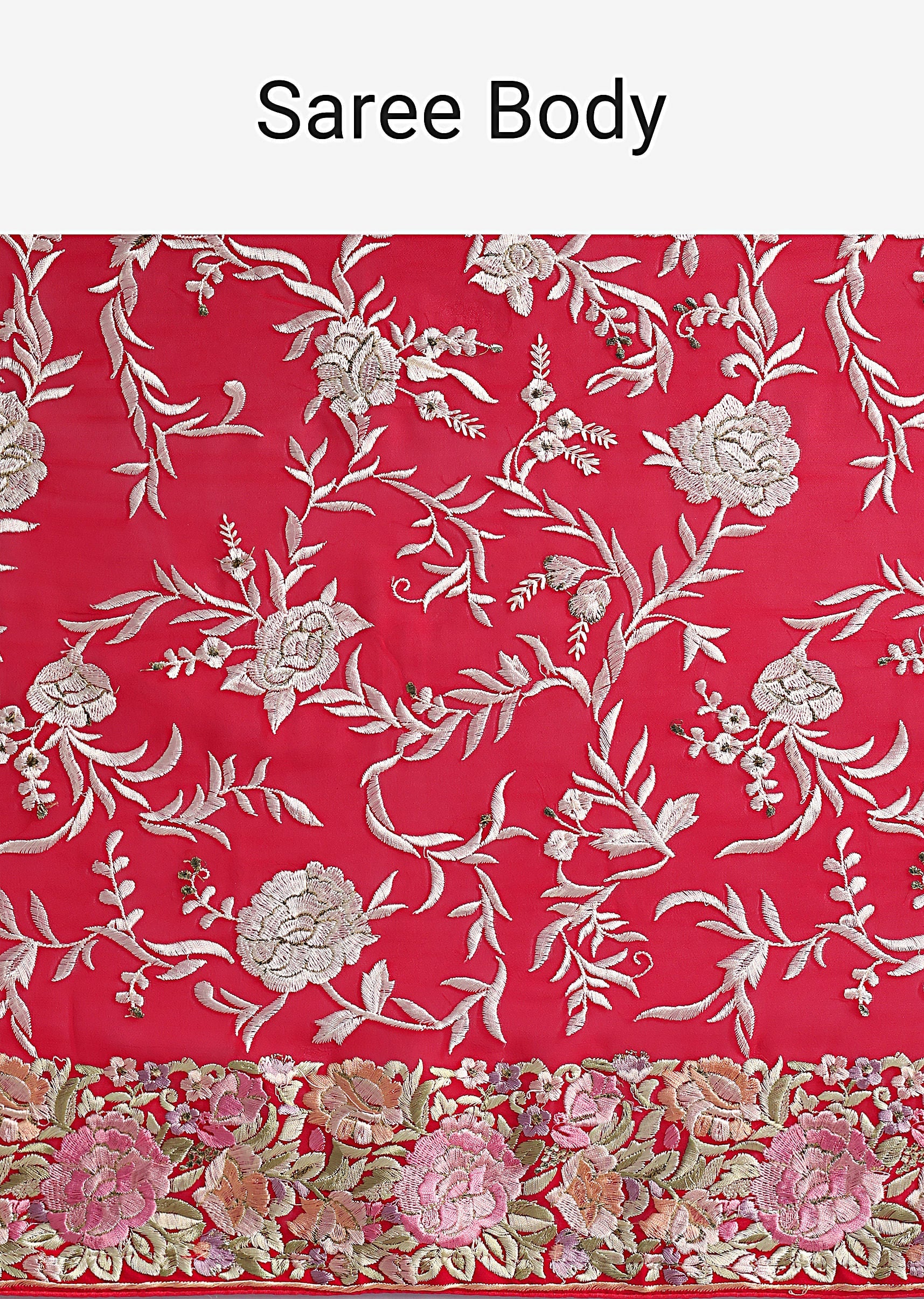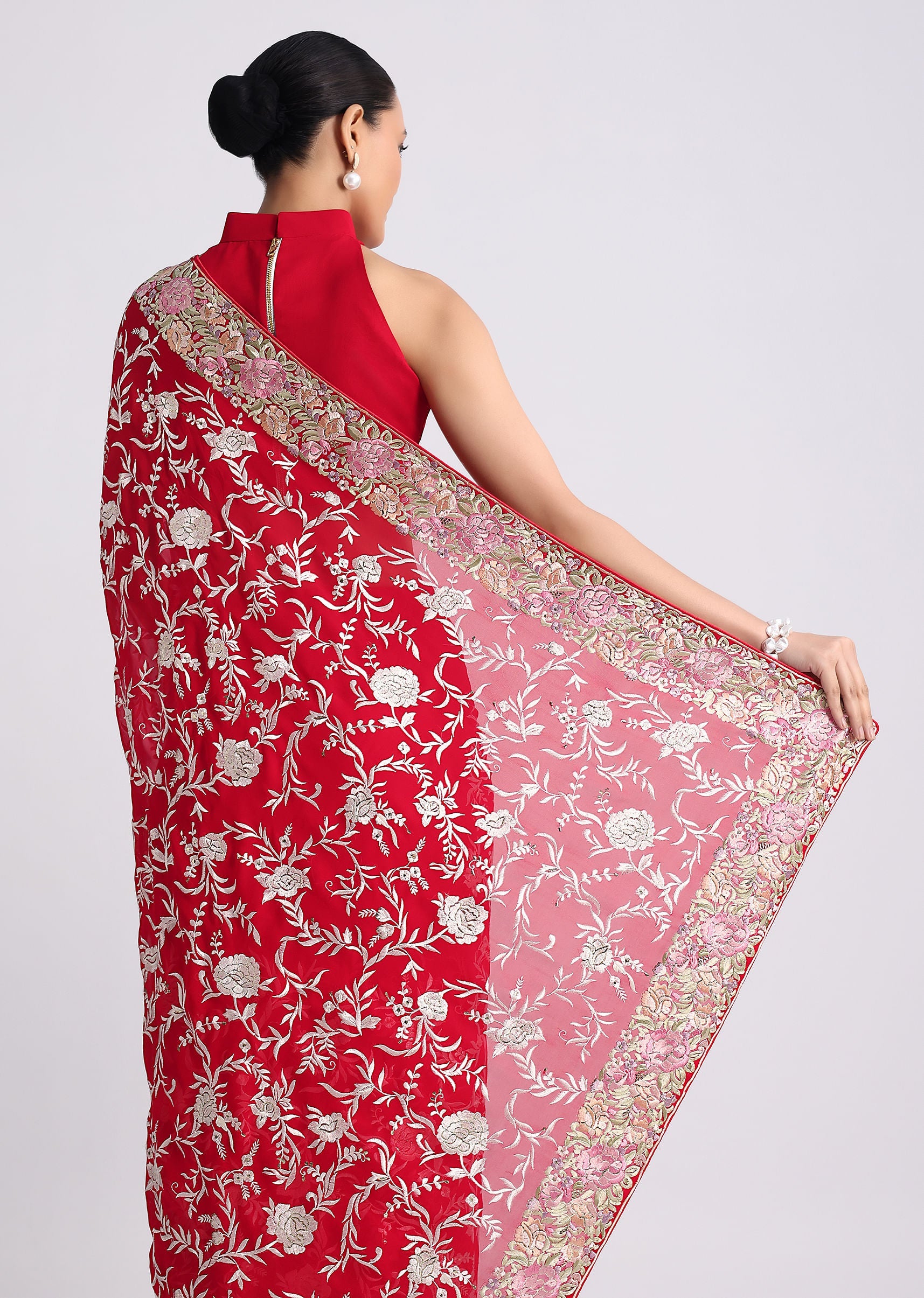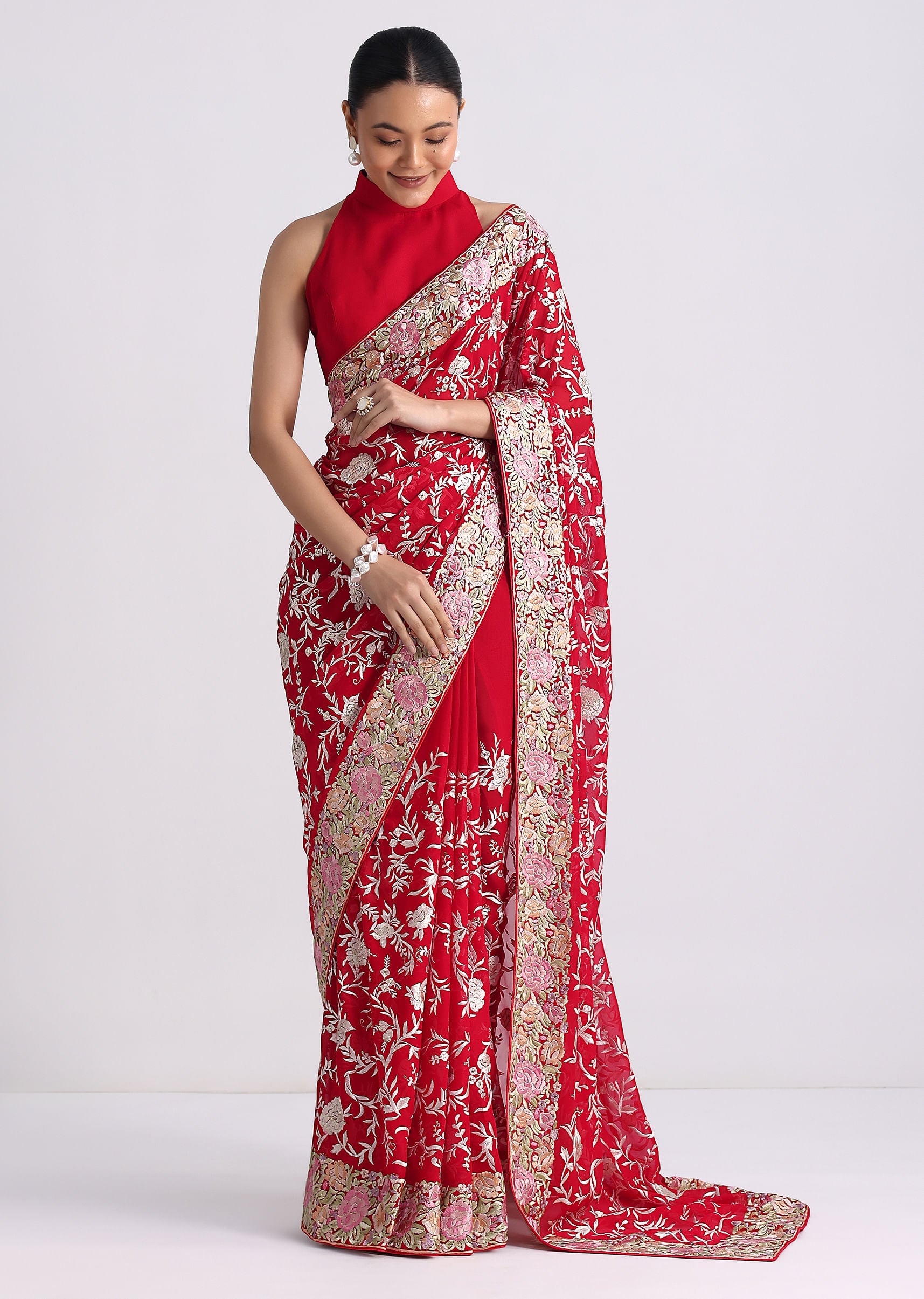Celebrate your love for traditions and new-age designs by donning this captivating georgette saree. Detailed with exquisite parsi gara embroidery, the jaal pattern motifs add to beauty of the silhouette. Crafted in a vibrant red hue, the detailed multi-colored resham thread embroidery enhance your picture-perfect festive look. Awarded as the Most Trusted Brand, we're delivering styles you love, just as promised.