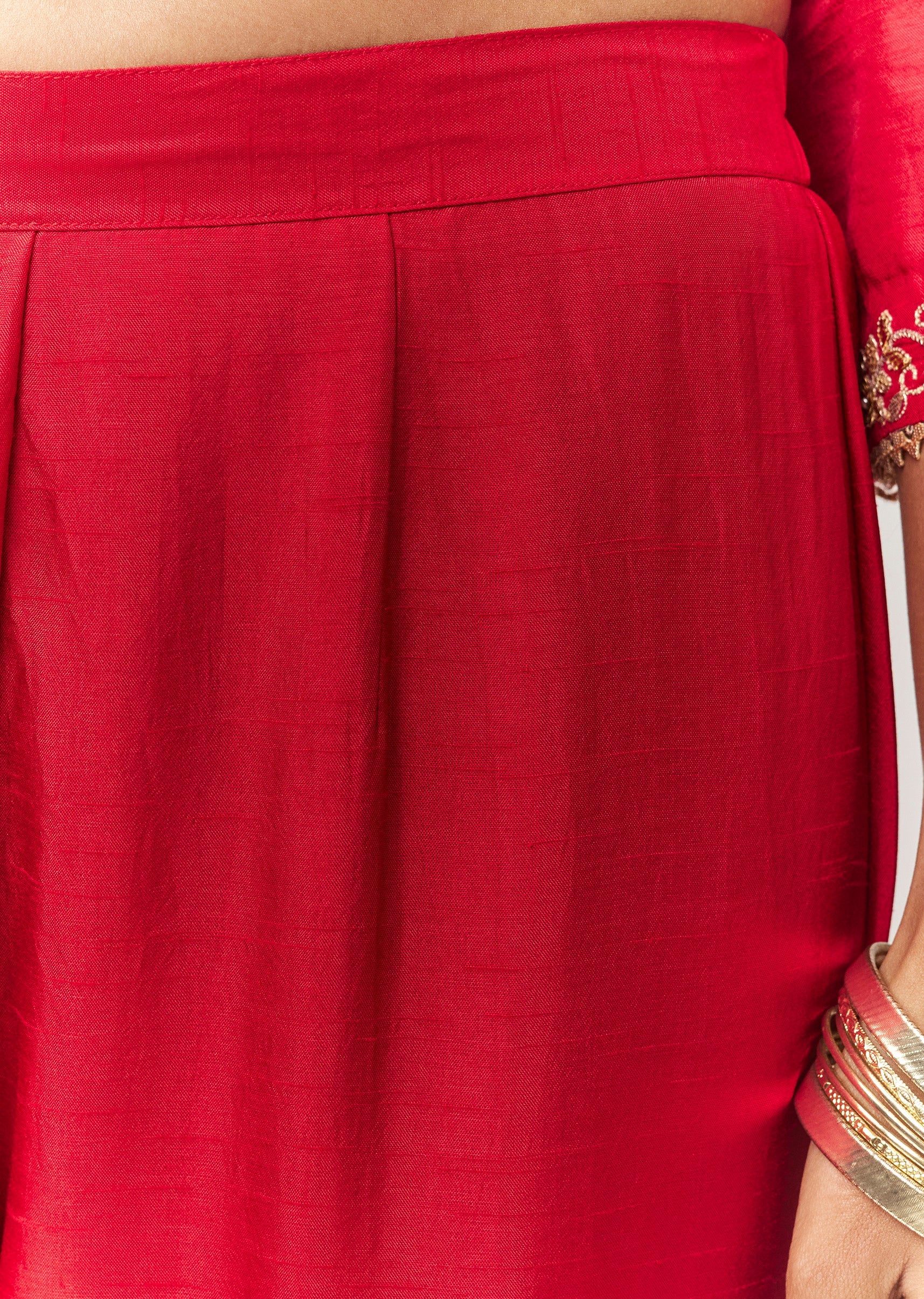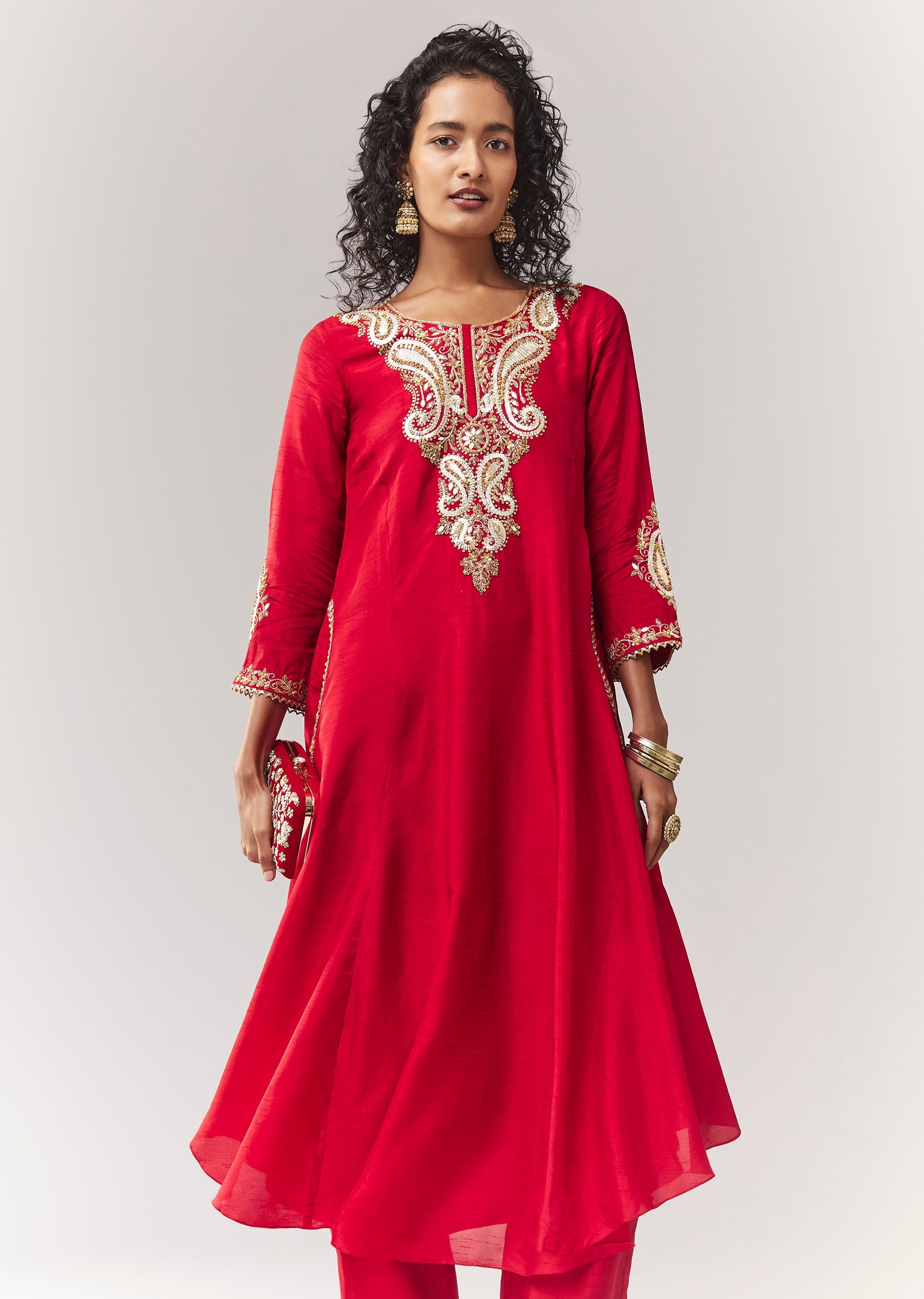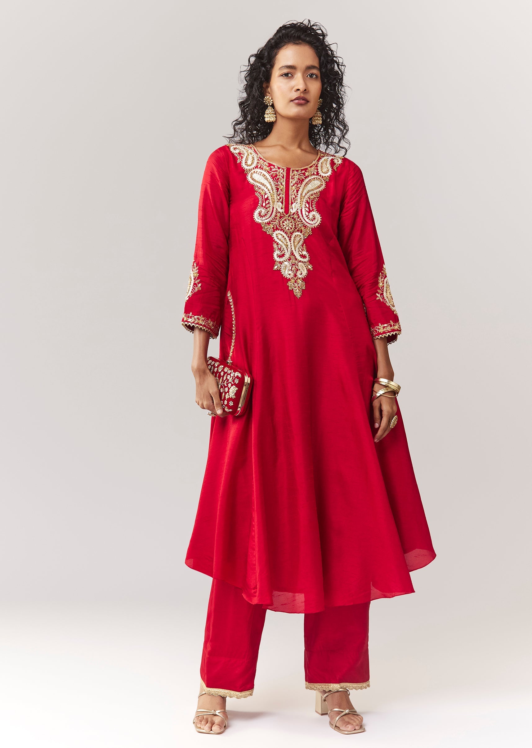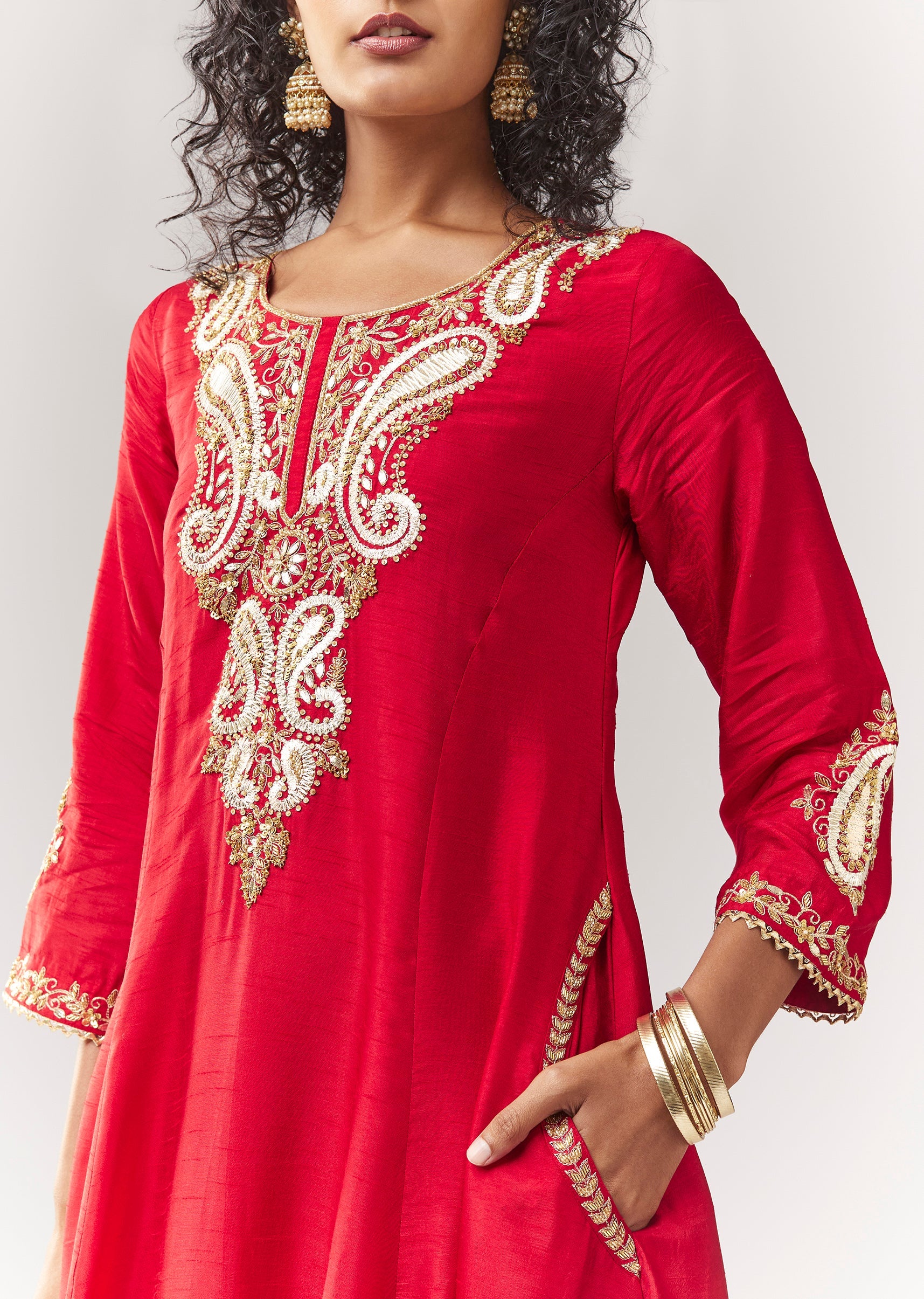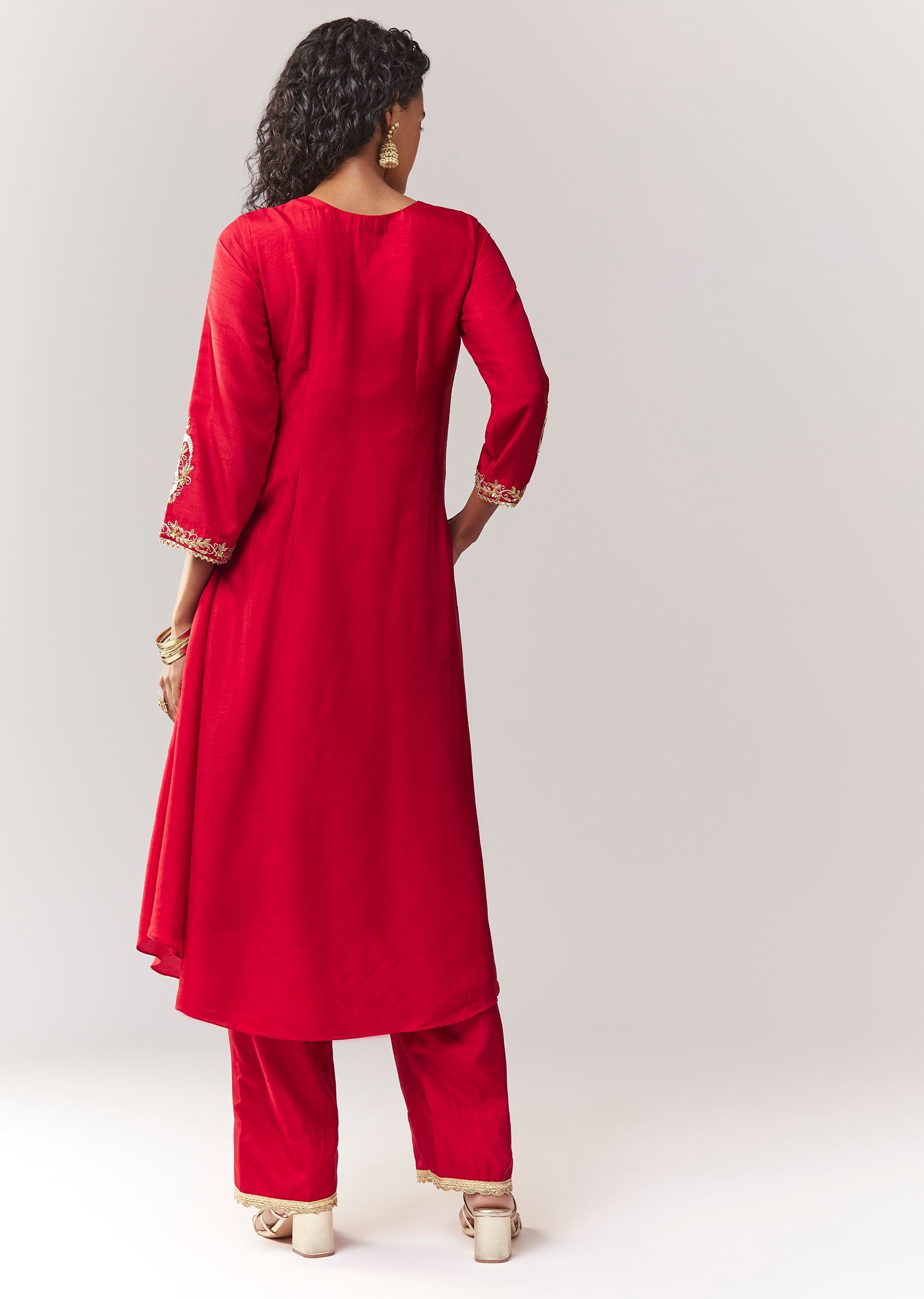 A festive minimal A-line anarkali set in dola silk featuring gotta patti and sequin work, plus functional side pockets. Comes with a mid-waist pant (partially elasticated) for comfort and movement.... More Product Details