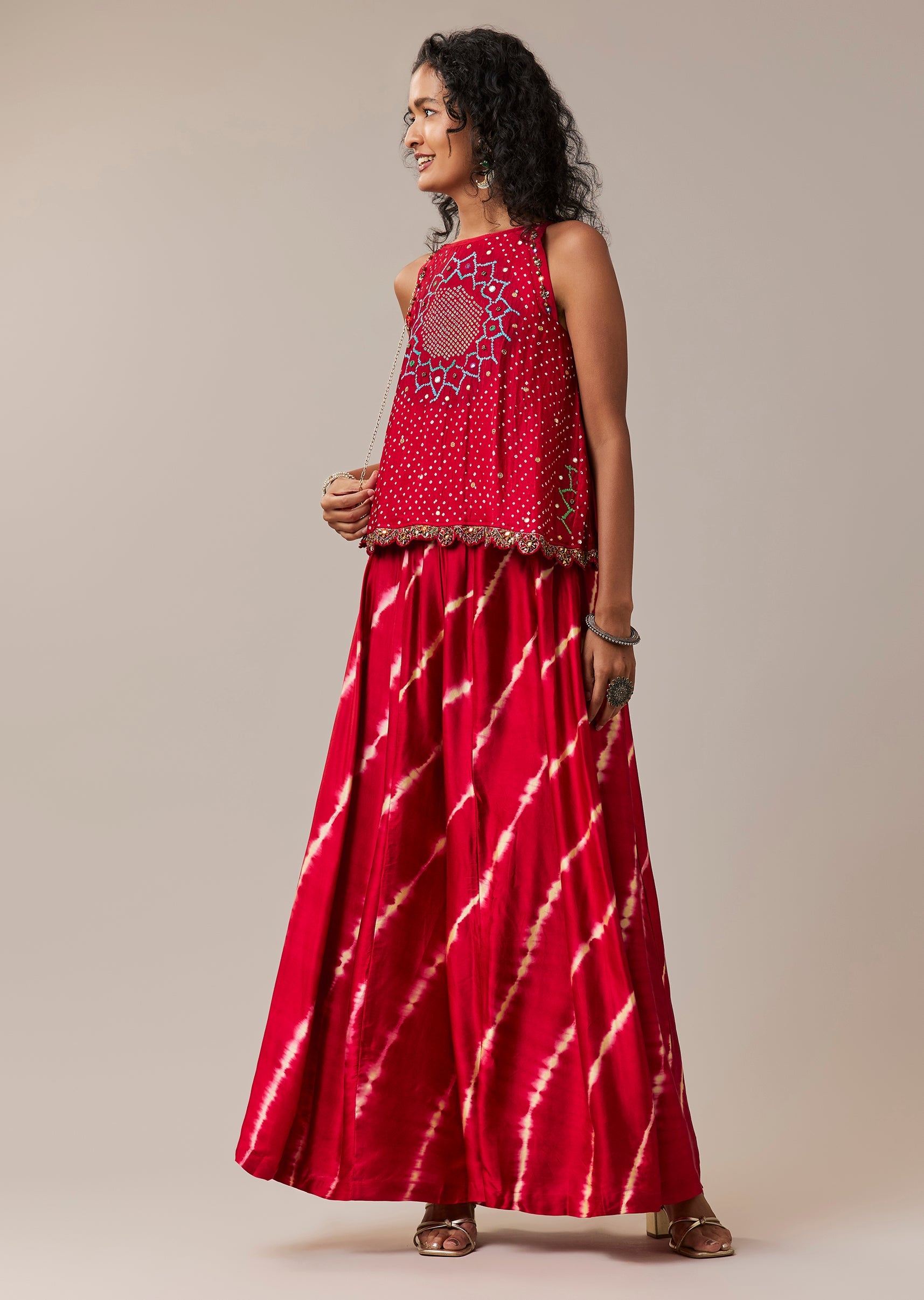Rooted in artisanal charm, this hand dyed bandhani set brings together traditional craft and effortless comfort. Crafted in soft modal, the sleeveless top is highlighted with delicate mirror and sequin... More Product Details