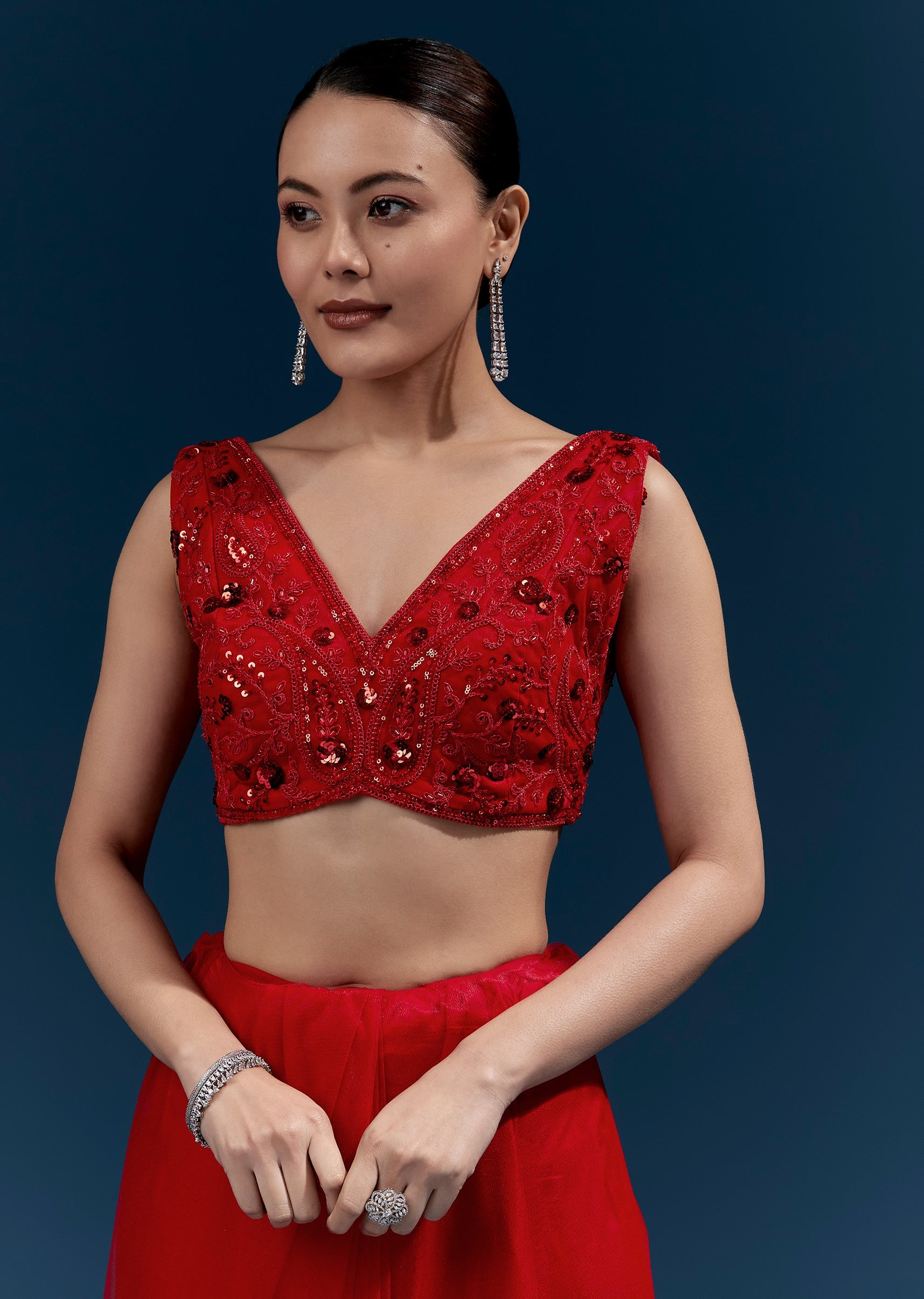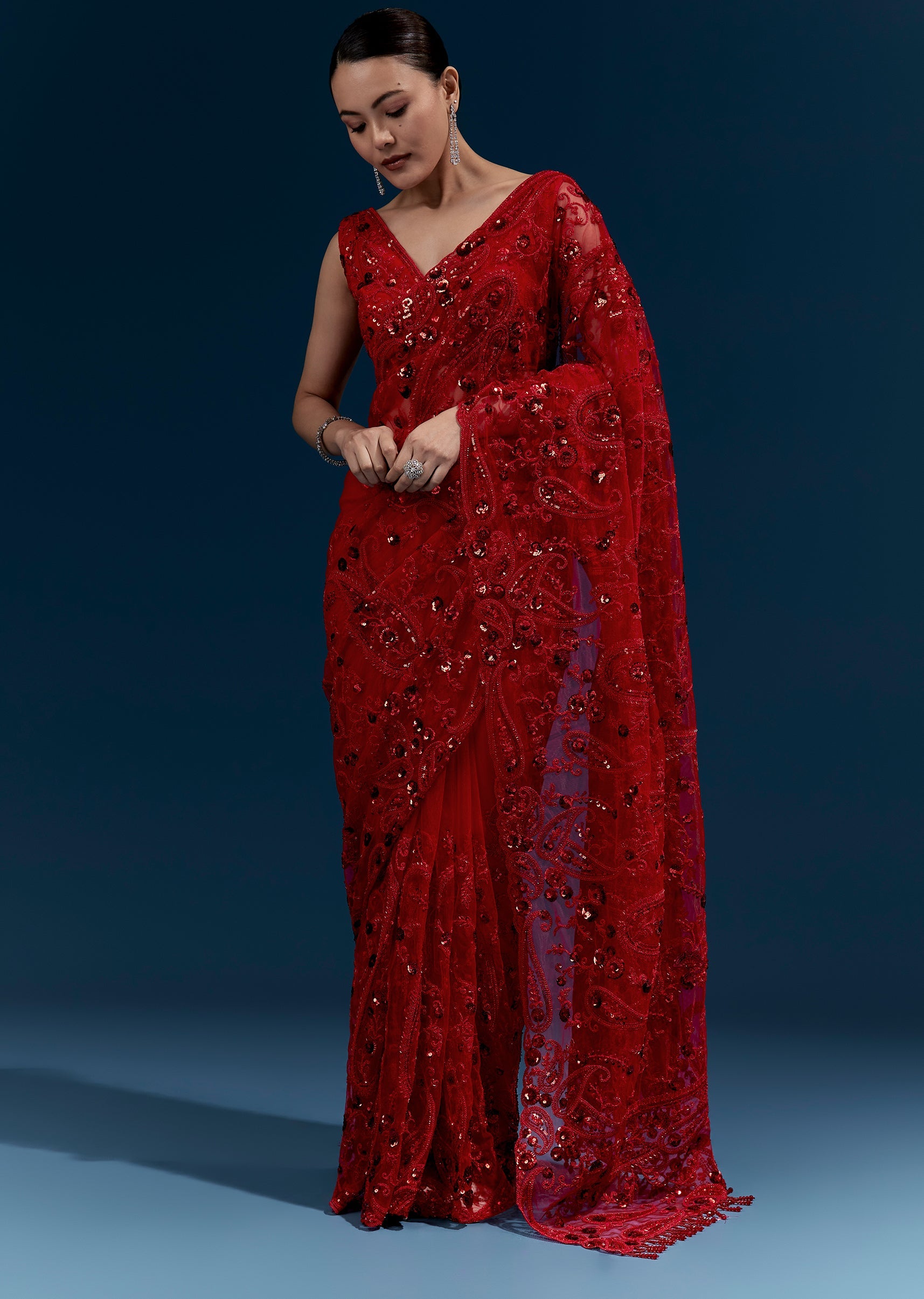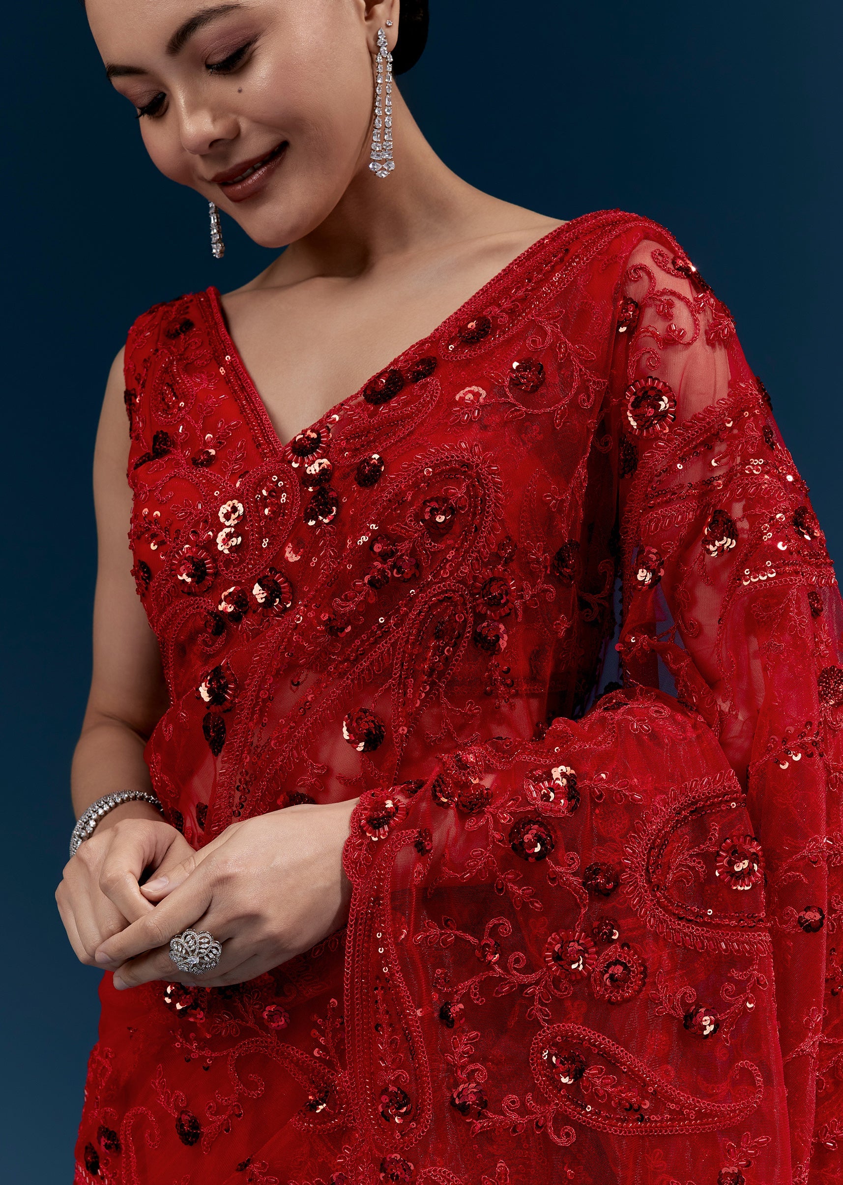 This red net saree features heavy floral embroidery with cutdana, sequins and beads all over for a statement finish. Tassels at the pallu end add a festive touch, making it perfect for cocktail parties, receptions and wedding celebrations. Awarded as the Most Trusted Brand, we're delivering styles you love, just as promised.