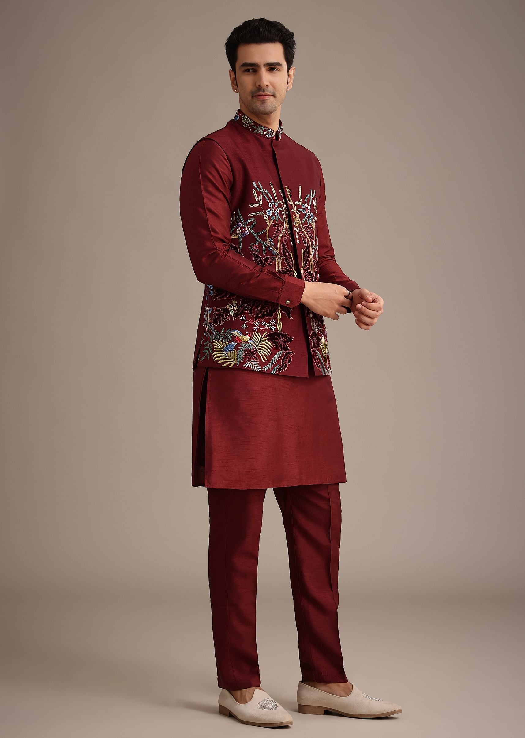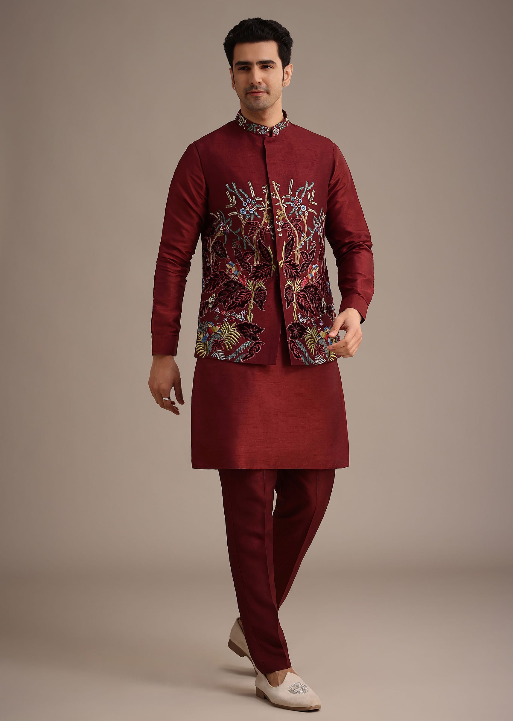 Showcase your unique and exquiste style with this striking red kurta and jacket set. The jacket features a mandarin collar and full sleeve design offering a luxe appeal. Embroidered with thread work and captivating motifs this set is completed with a kurta and coordinating bottoms. A beautiful choice for joyous festivities. Awarded As The Most Trusted Brand We'Re Delivering Styles You Love Just As Promised.