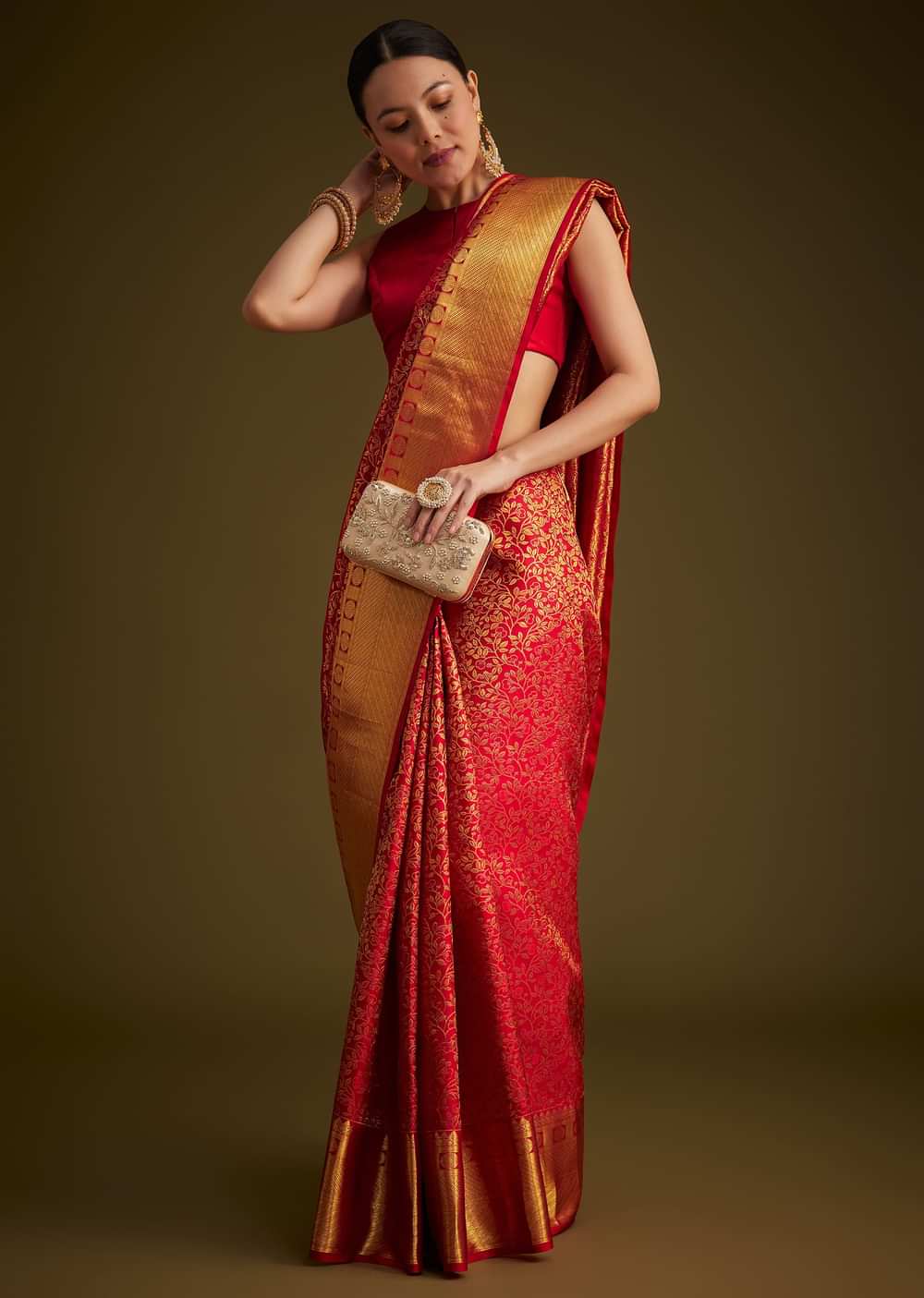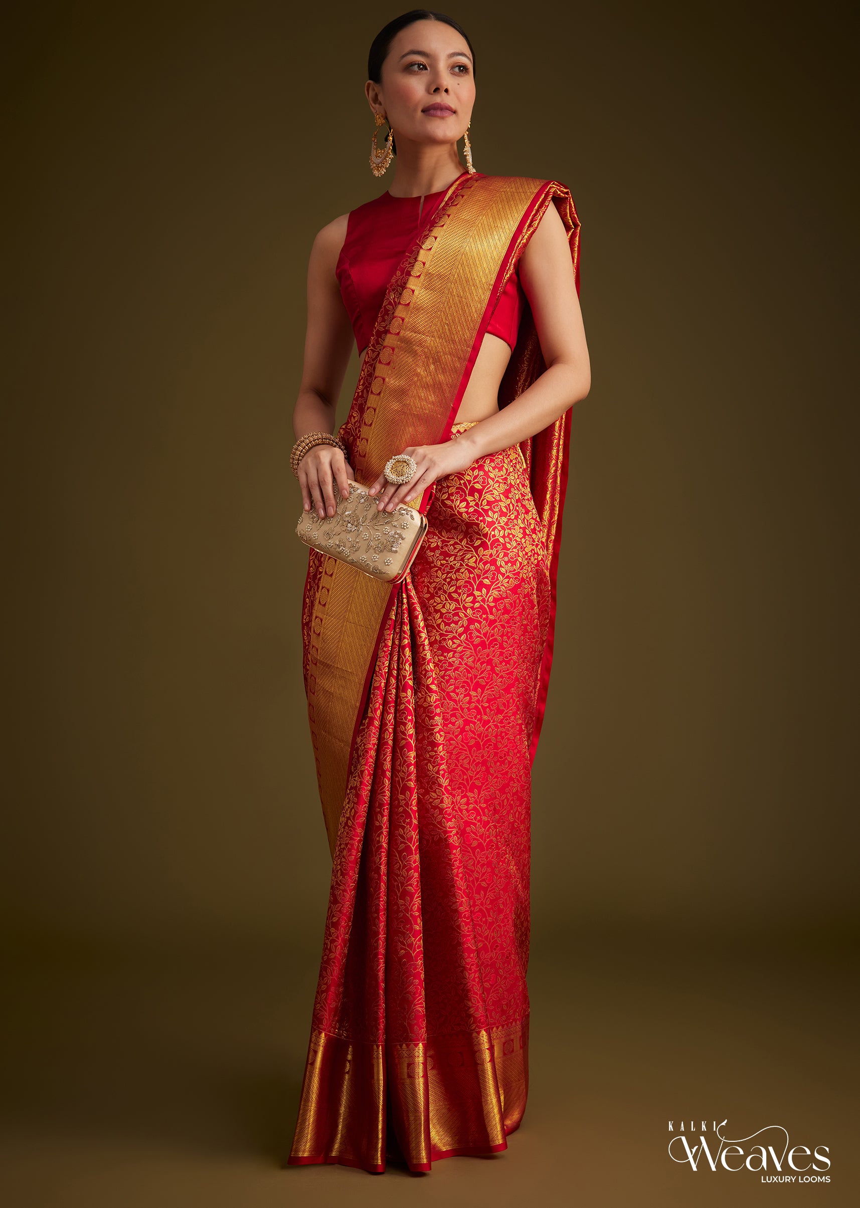Red Kanjivaram Silk Saree With Golden Zari Woven Border