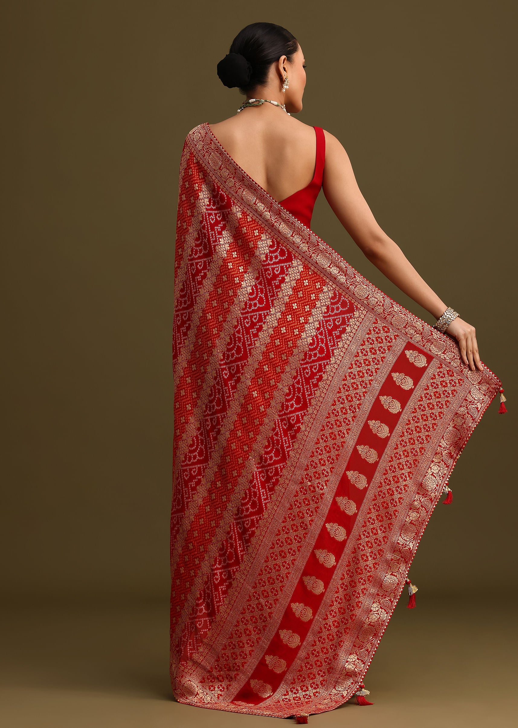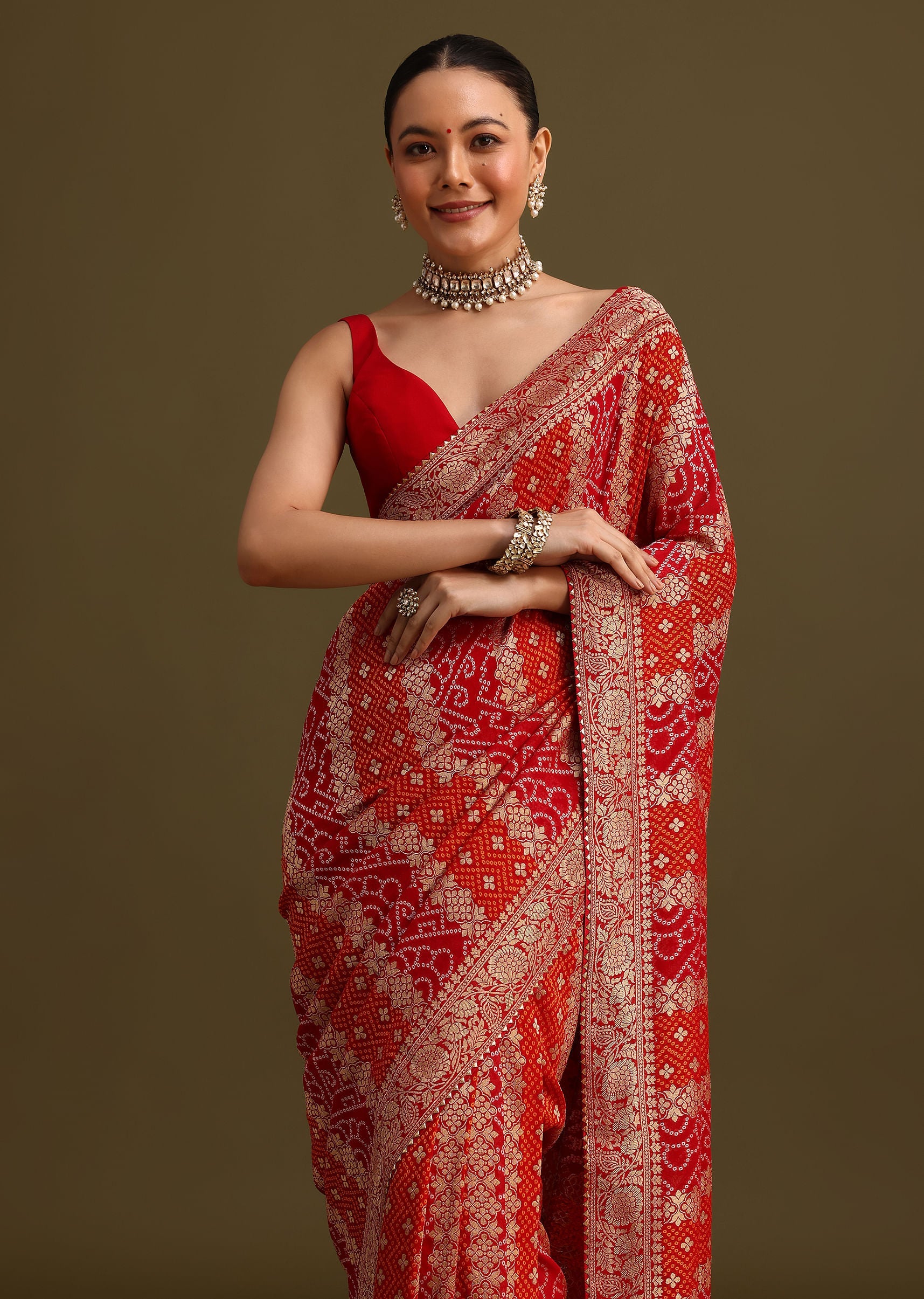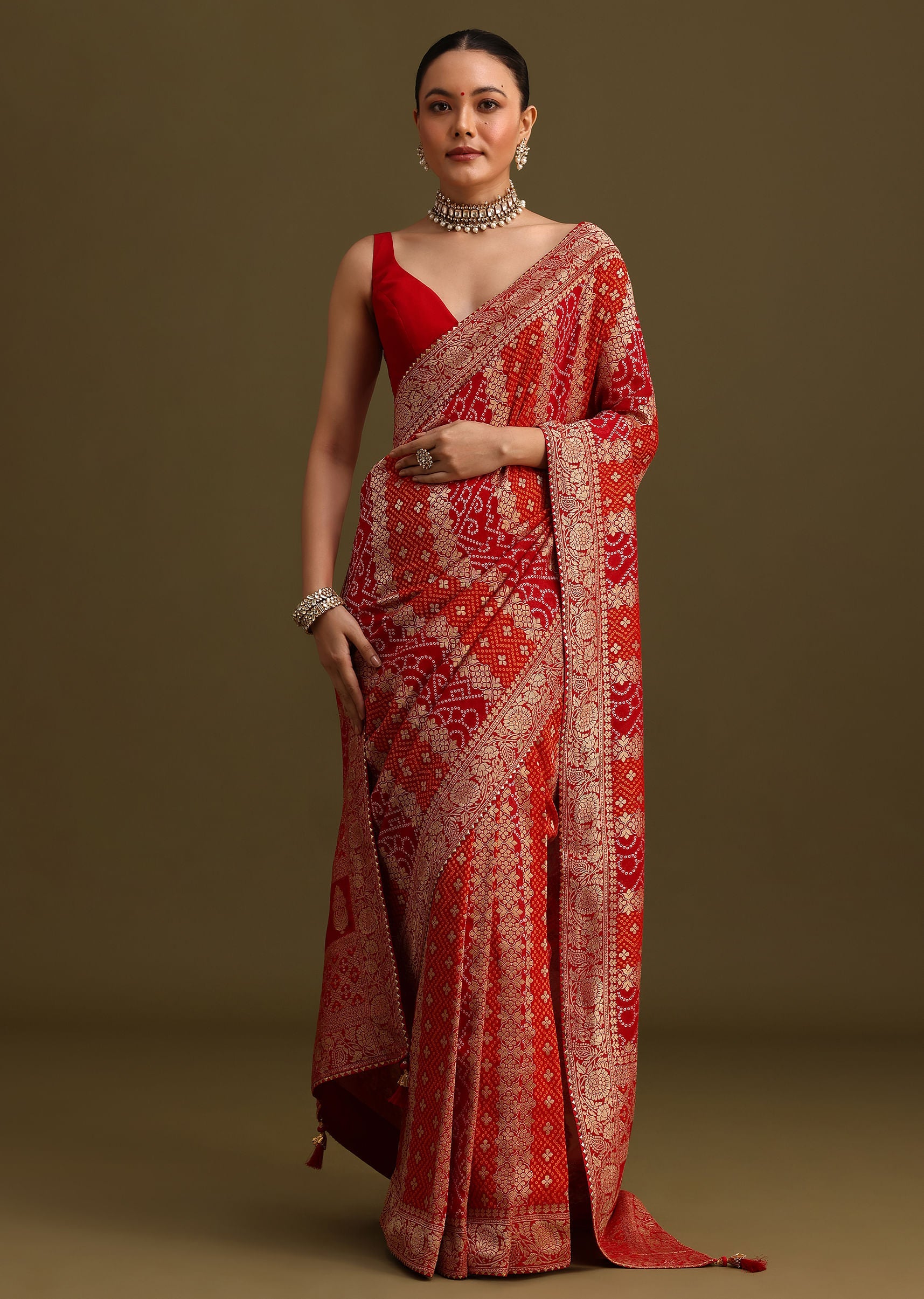 This red saree with gota patti border is a timeless piece that can be styled in countless ways. Whether you choose a simple blouse or a more elaborate design, the saree will always be a statement piece. It's perfect for festivals, or any special occasion where you want to make a lasting impression. Awarded as the Most Trusted Brand, we're delivering styles you love, just as promised.