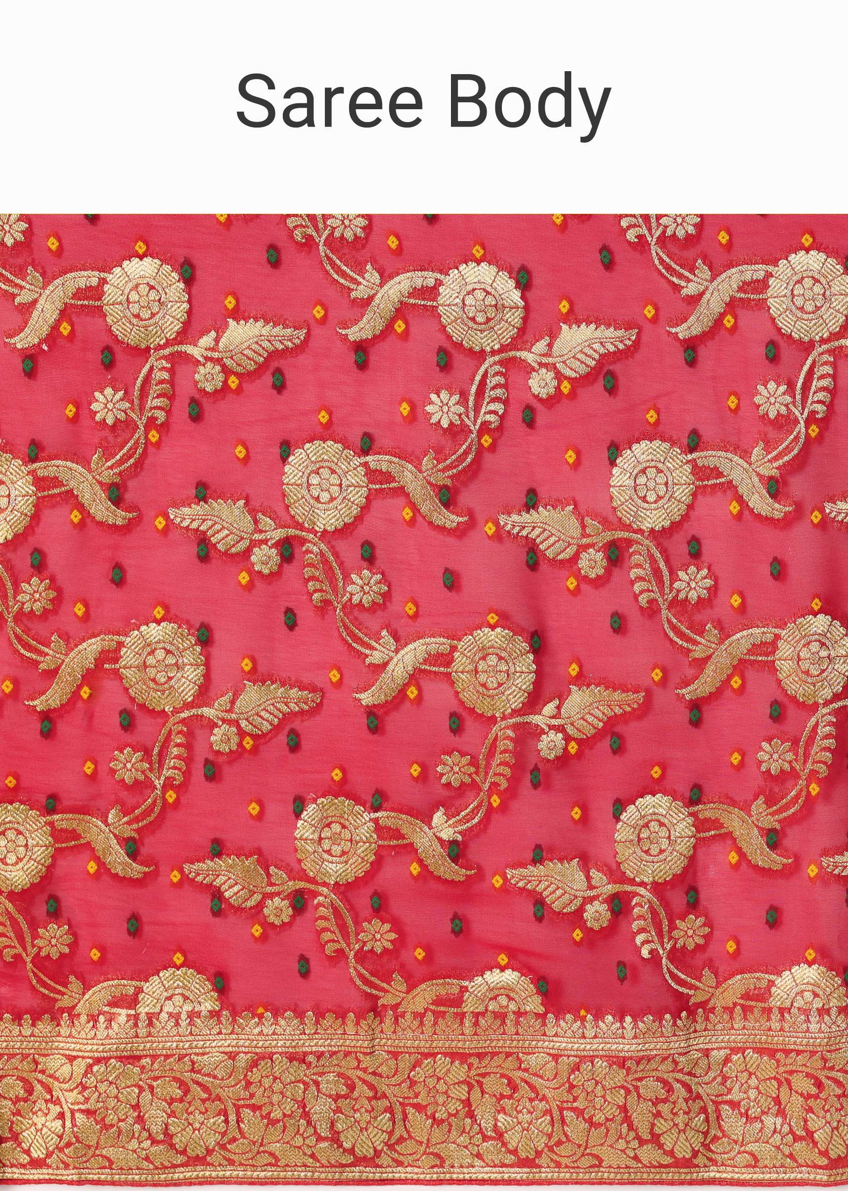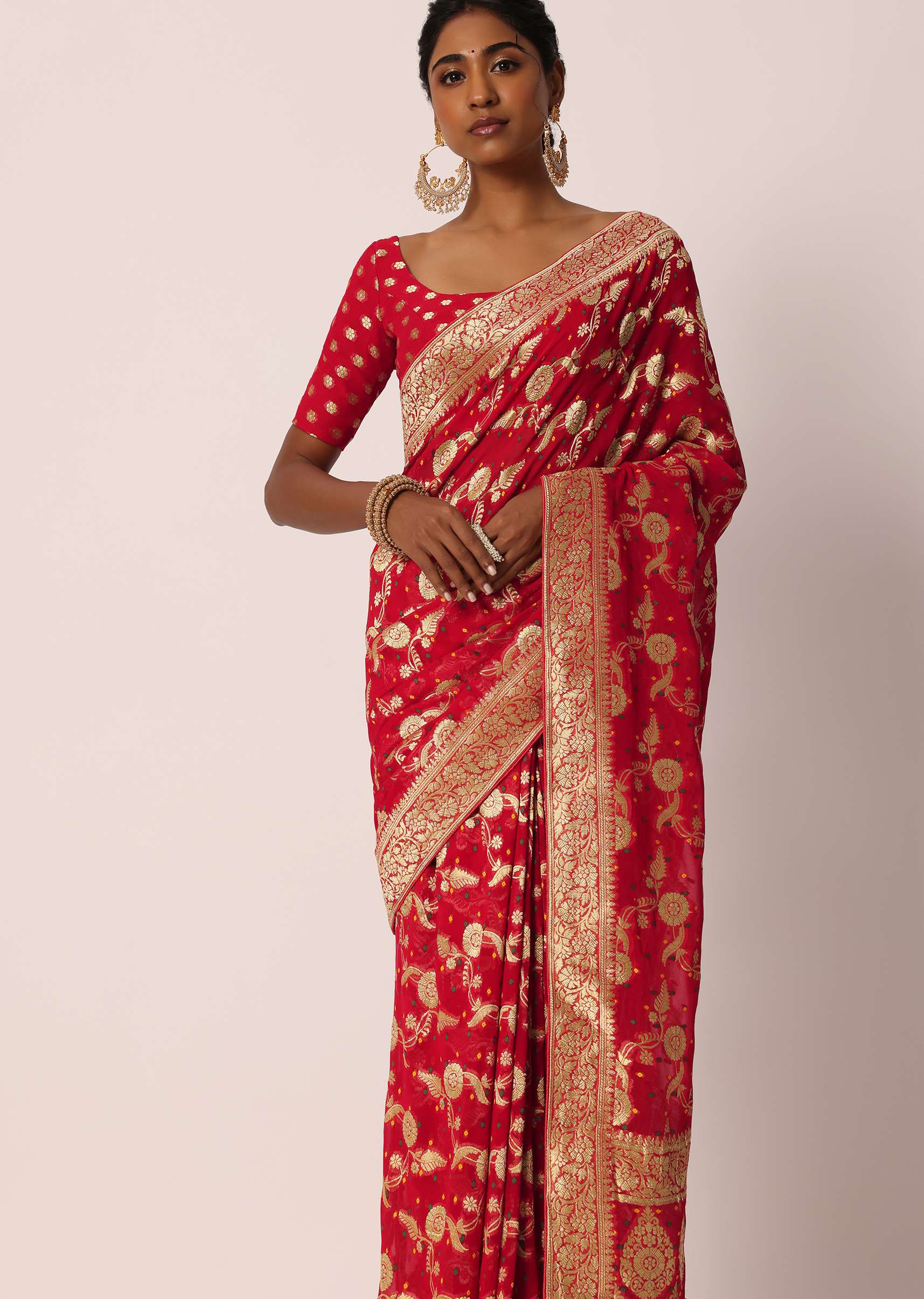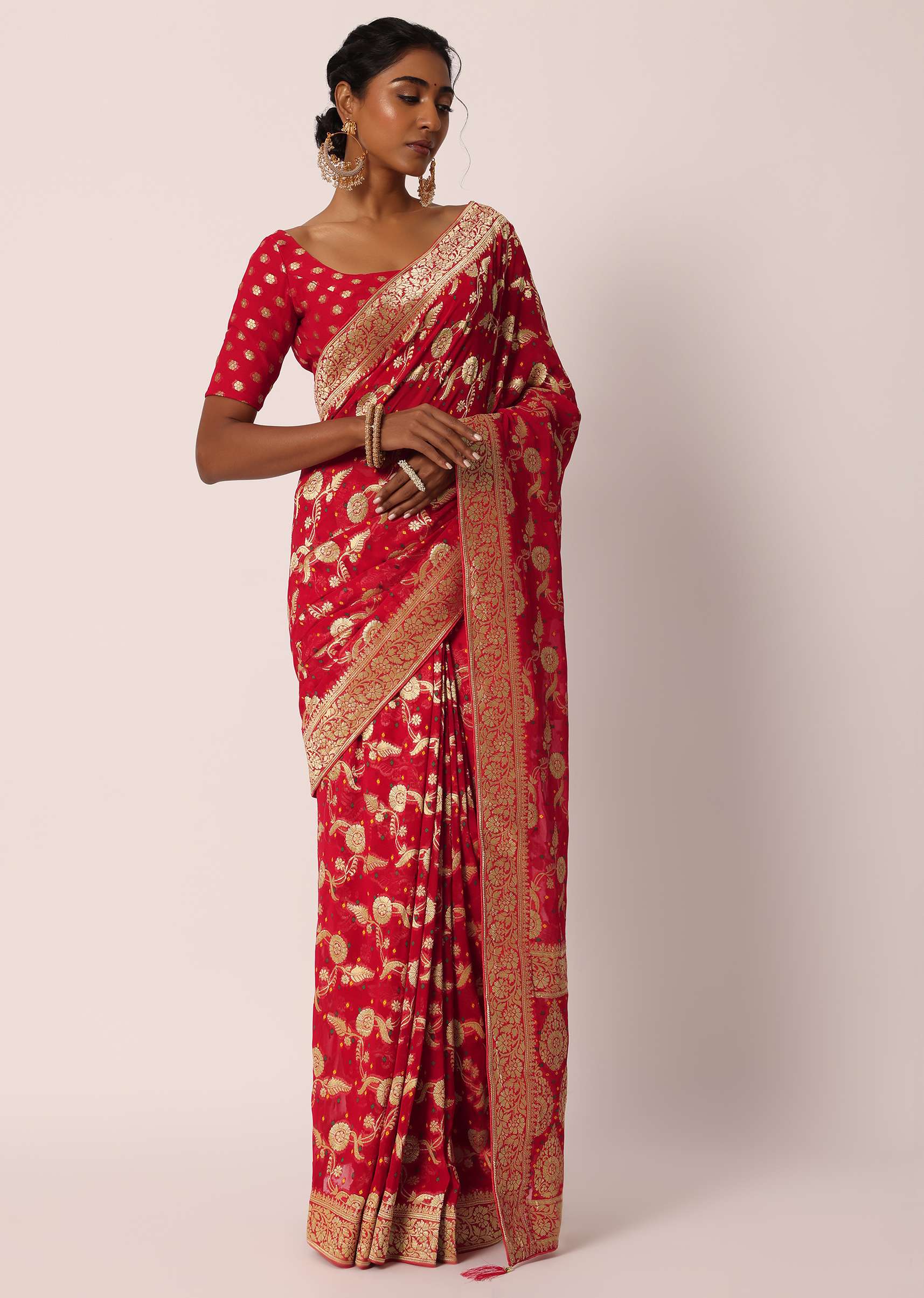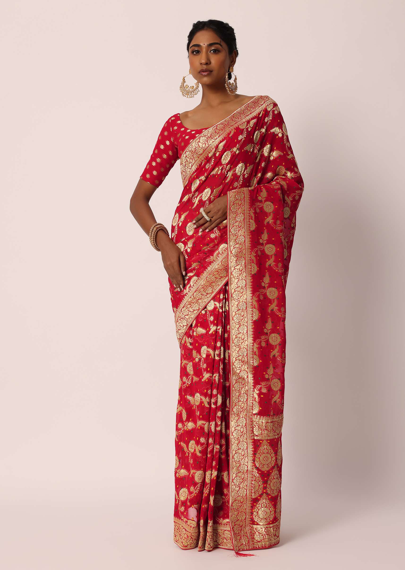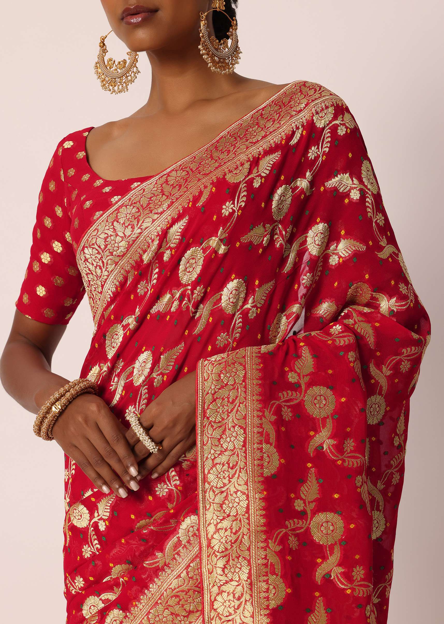 Showcase your exquisite style by stepping out in this classic red saree, that comes fabricated from rich khadi georgette fabric. Accentuated with captivating banarasi and bandhani weave, it is beautified on a vibrant hue. Glistening with gota patti detailing on the border, this drape is a magnificent choice for year-round family functions. Completed with an unstitched blouse piece, don this drape to win a ton of compliments. Awarded As The Most Trusted Brand We'Re Delivering Styles You Love Just As Promised.