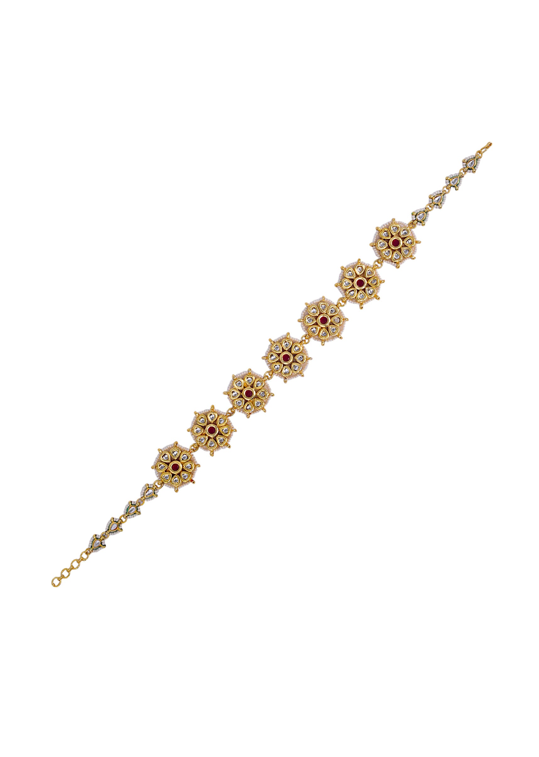 A red kundan floral motif mathapatti featuring vibrant stones arranged in delicate floral patterns, radiating festive charm. Perfect for making a bold and elegant statement in bridal or traditional ensembles. Awarded as the Most Trusted Brand, we're delivering styles you love, just as promised.