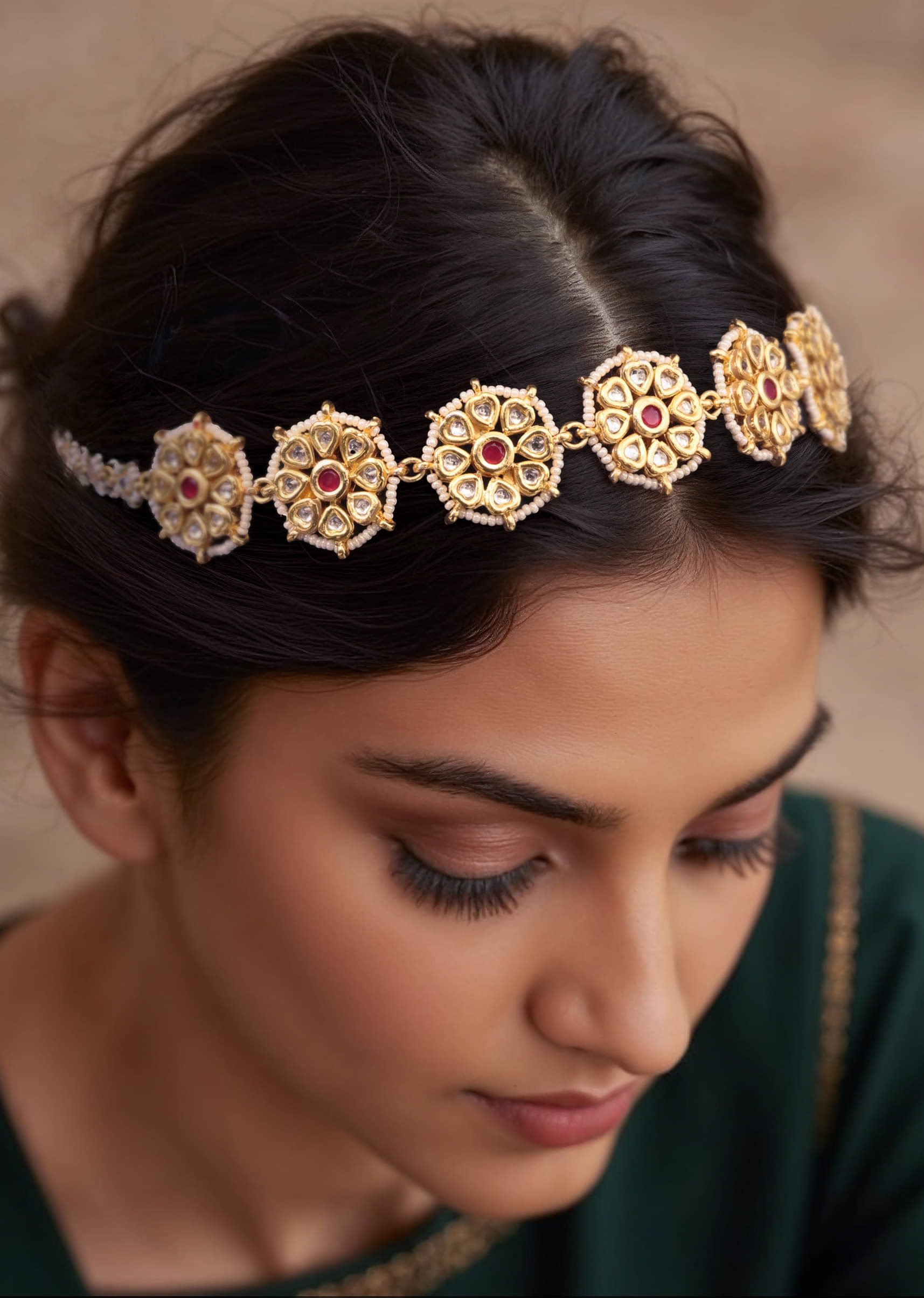 Complements rich-colored lehengas and sarees, enhancing intricate embroidery and detailed outfits.Fit Tips: Designed with a flexible base and secure hooks to stay comfortably in place throughout long ceremonies.