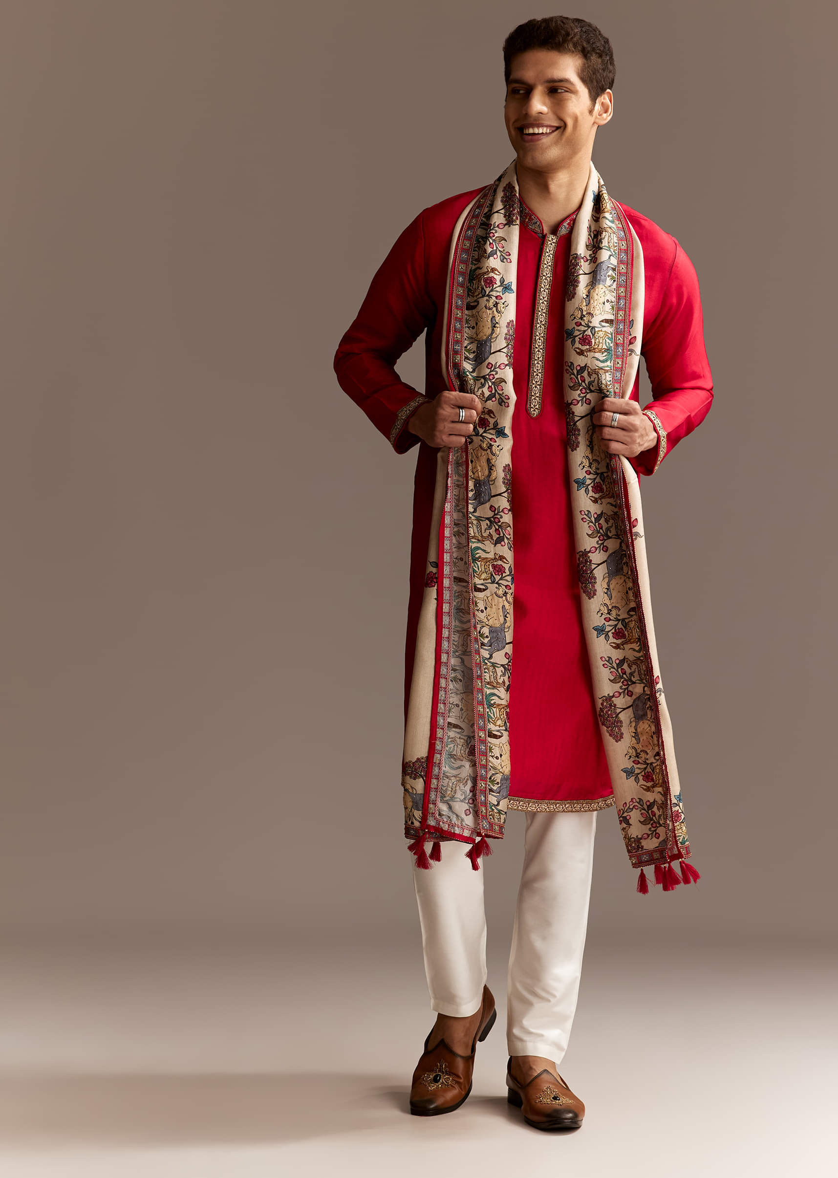 This red kurta set makes a bold impression while maintaining tradition. Its mandarin collar, full sleeves, and classic silhouette suit every celebratory occasion—from poojas to engagements. Awarded as the Most... More Product Details