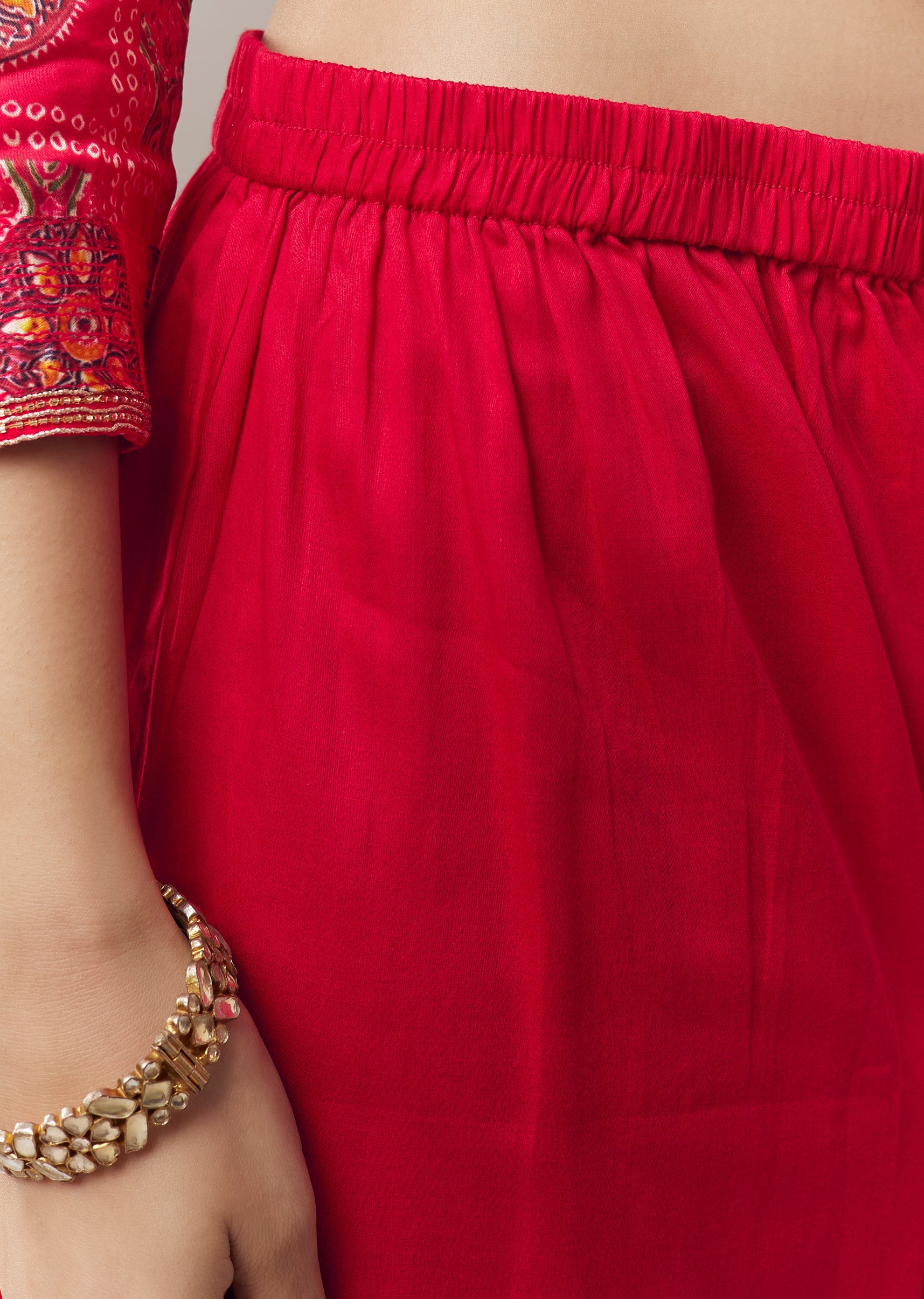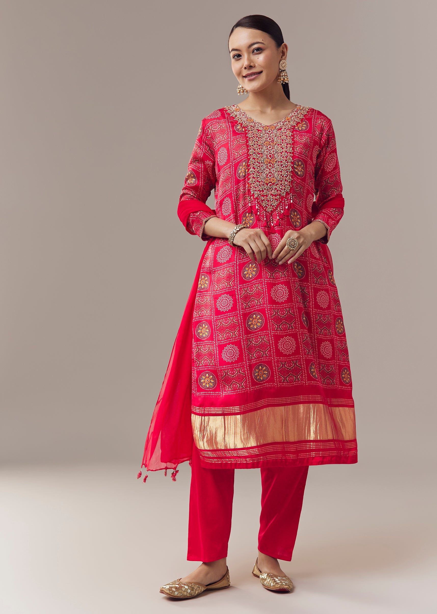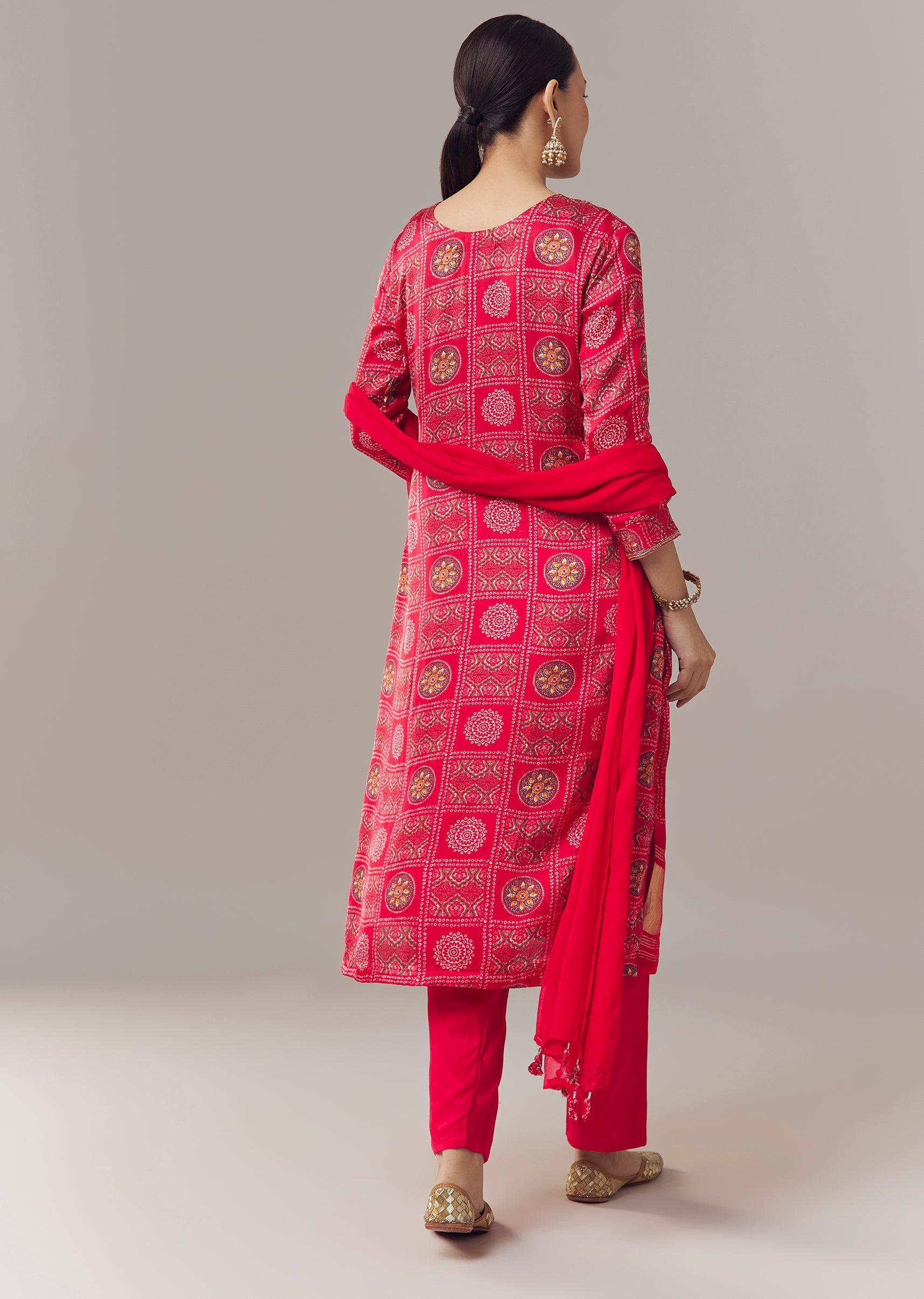 Red Kurta Set With Festive Bandhani Prints And Dupatta