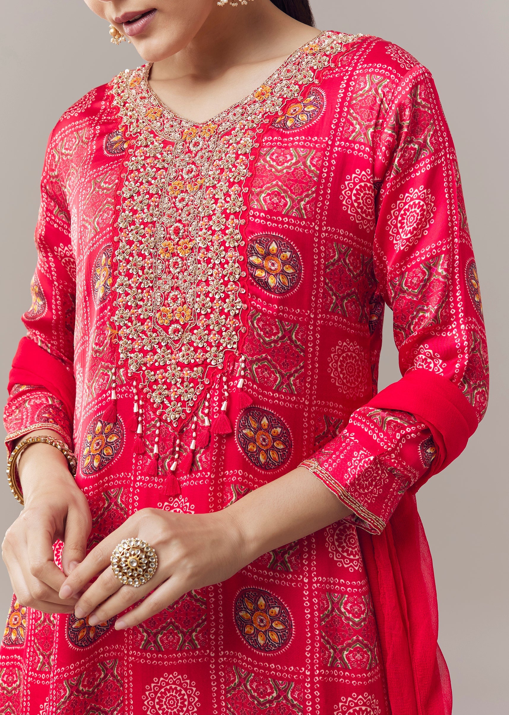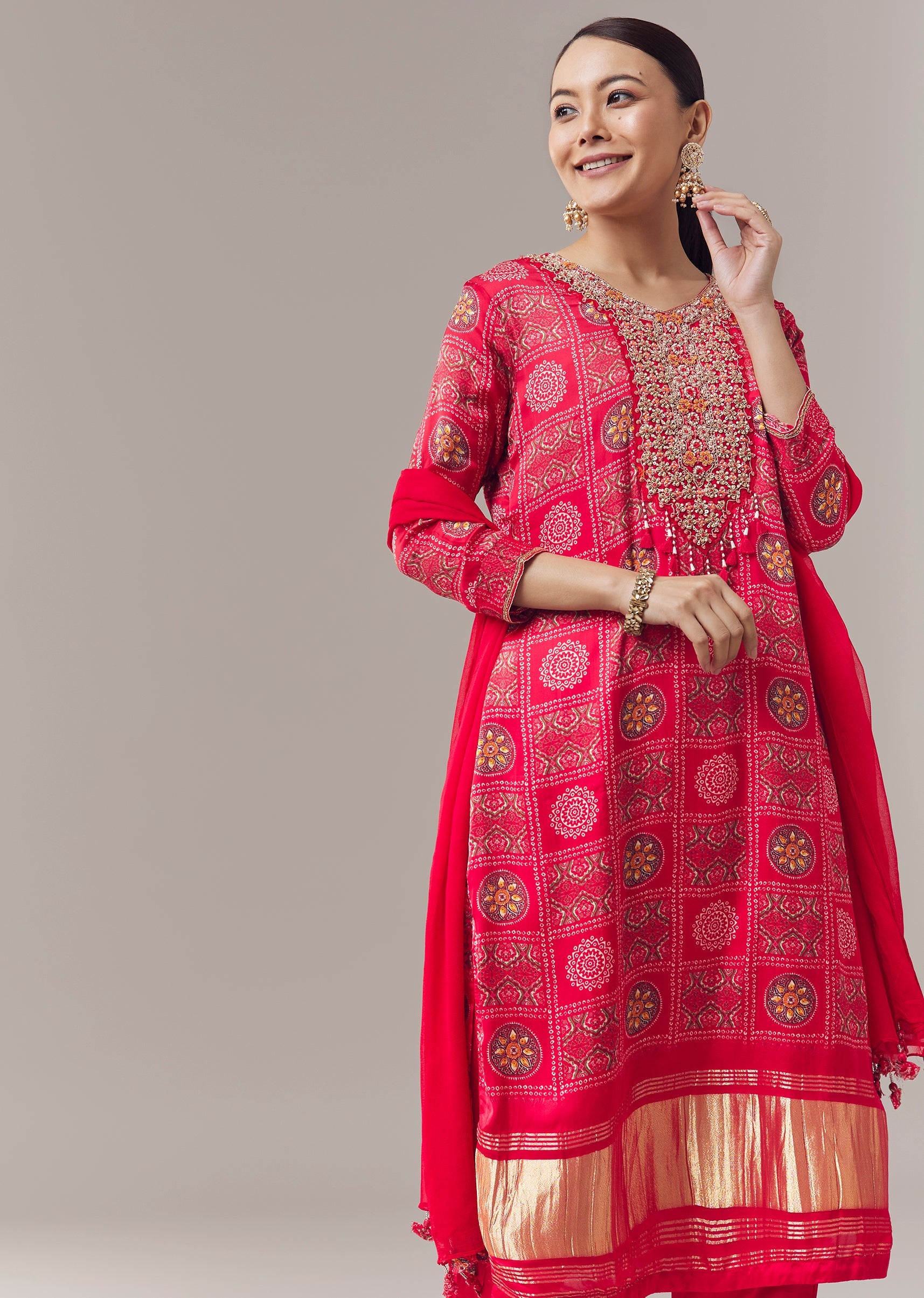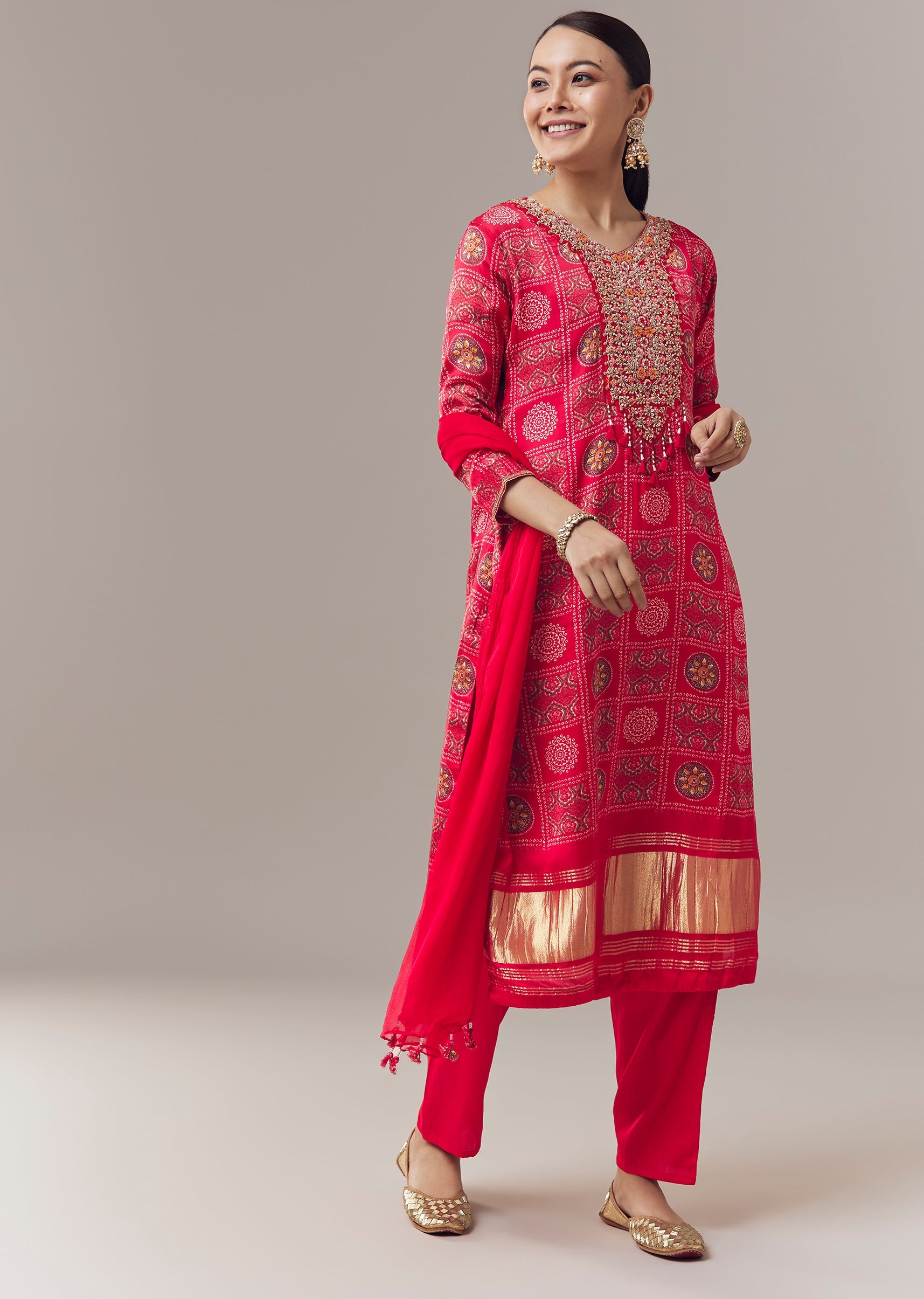 Red Kurta Set With Festive Bandhani Prints And Dupatta